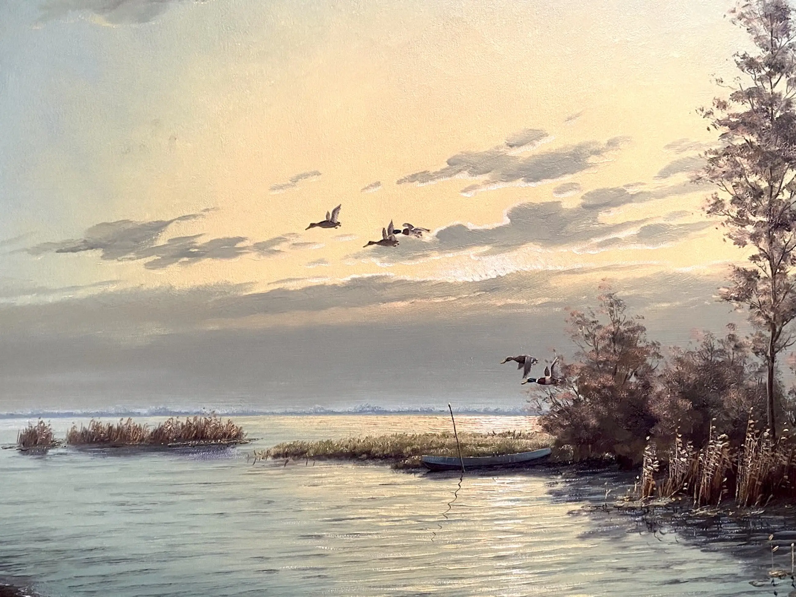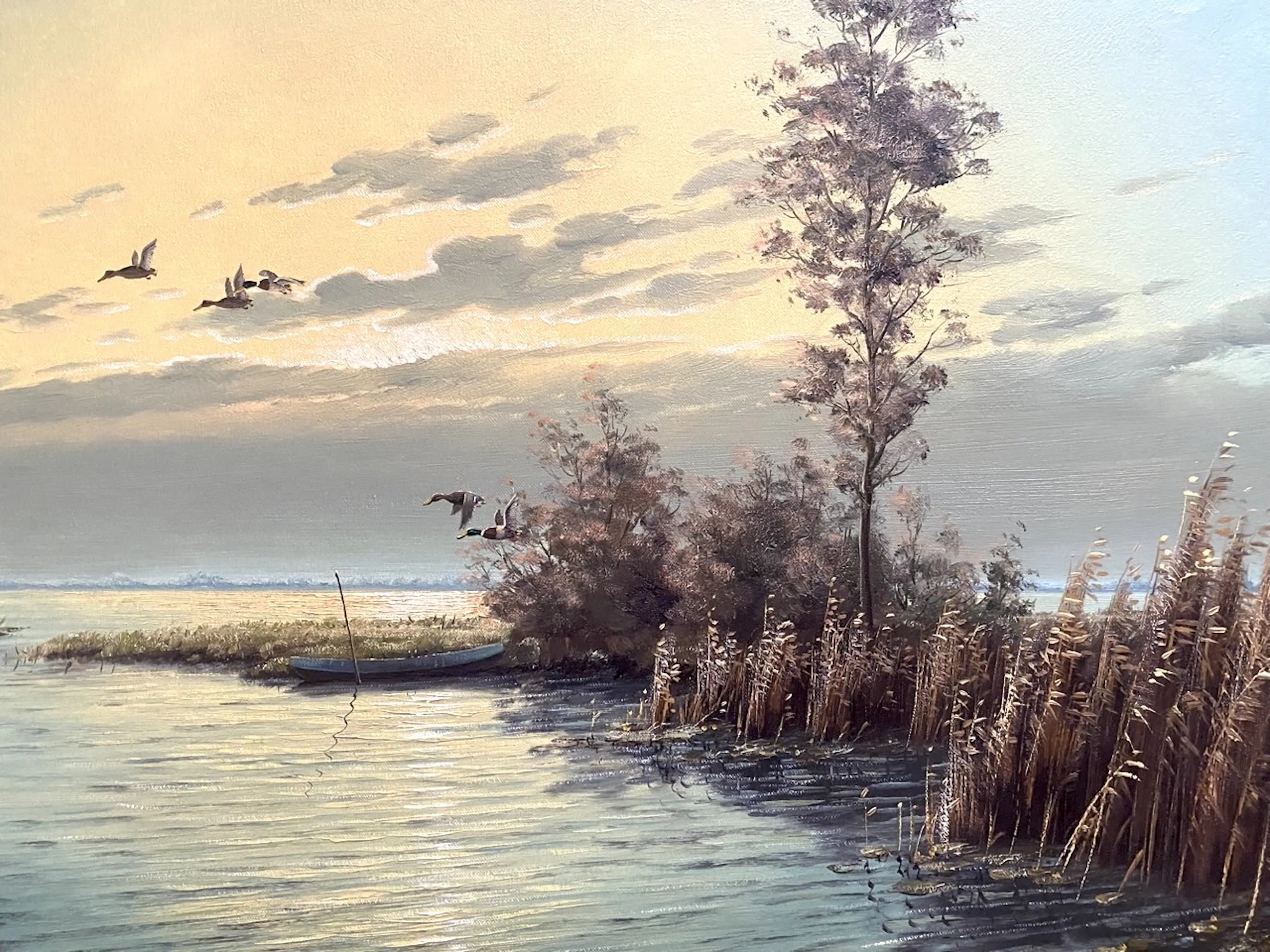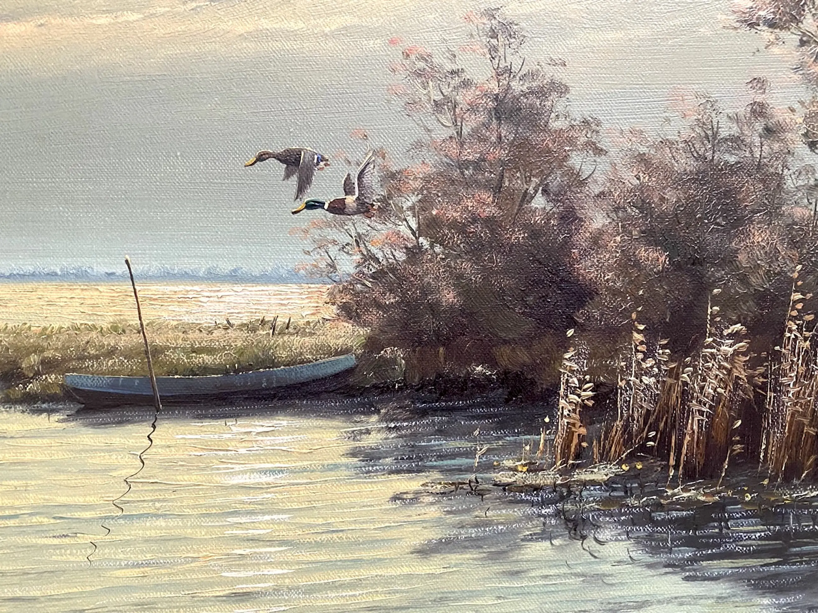Prachtig zeer fijn realistisch geschilderd landschap schilderij van Gien Brouwer Het geeft een prachtig beeld weer van een typisch Hollands waterlandschap met eenden aan het water.
