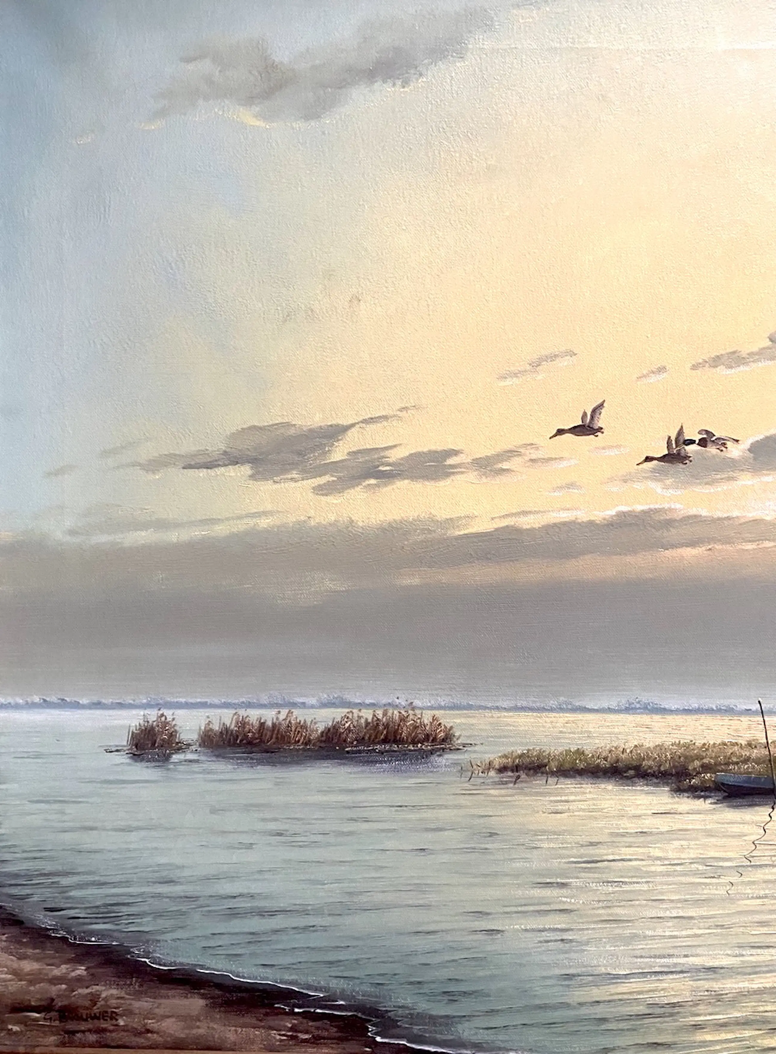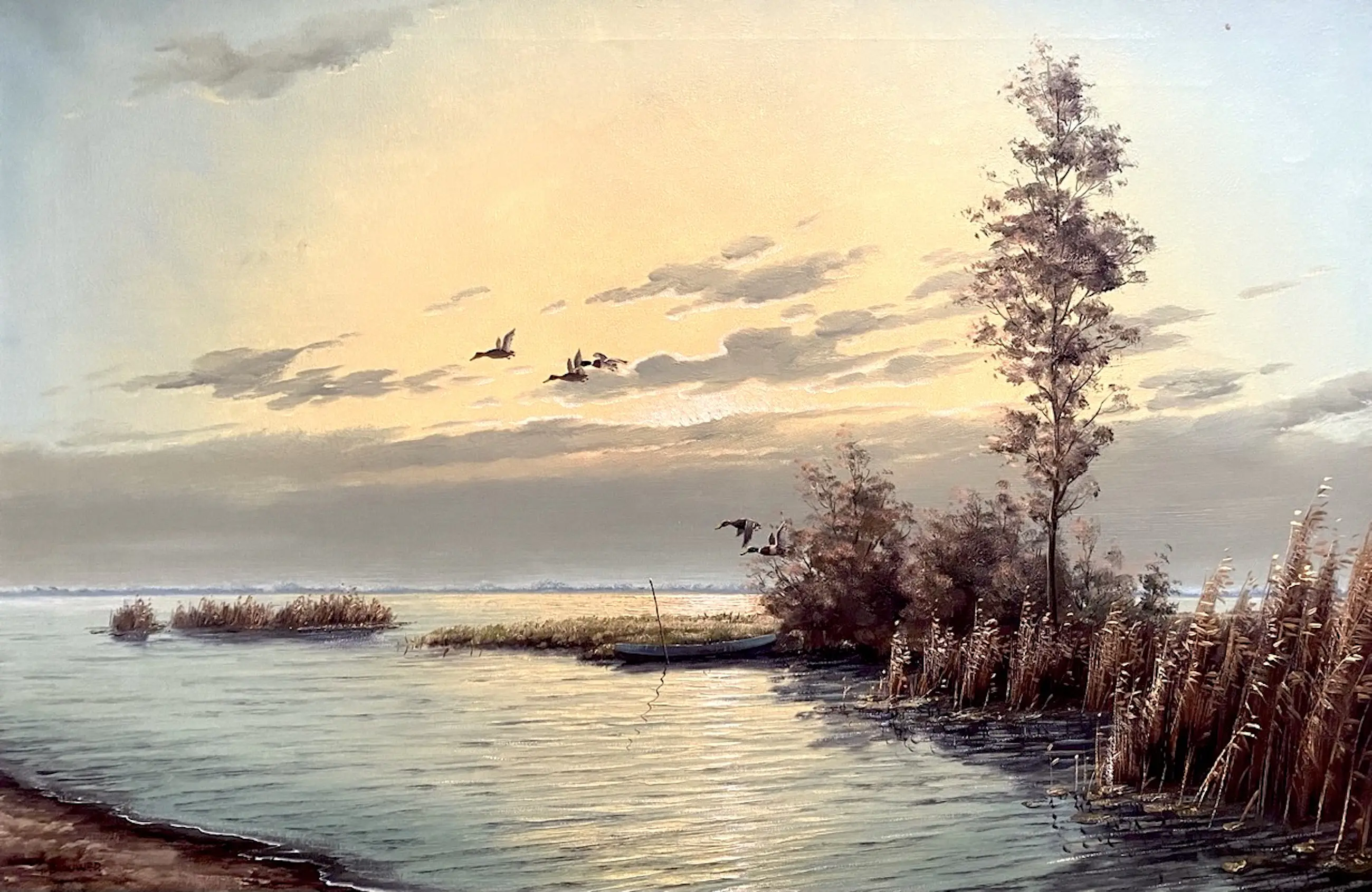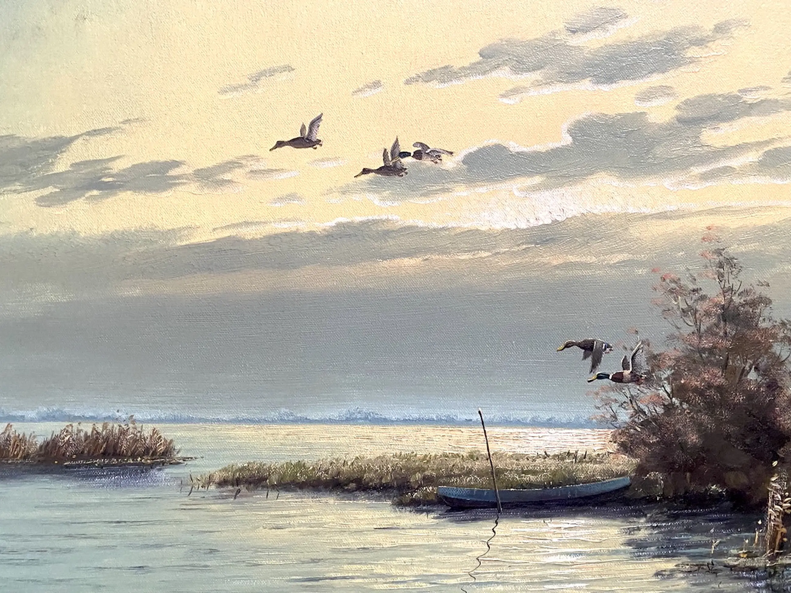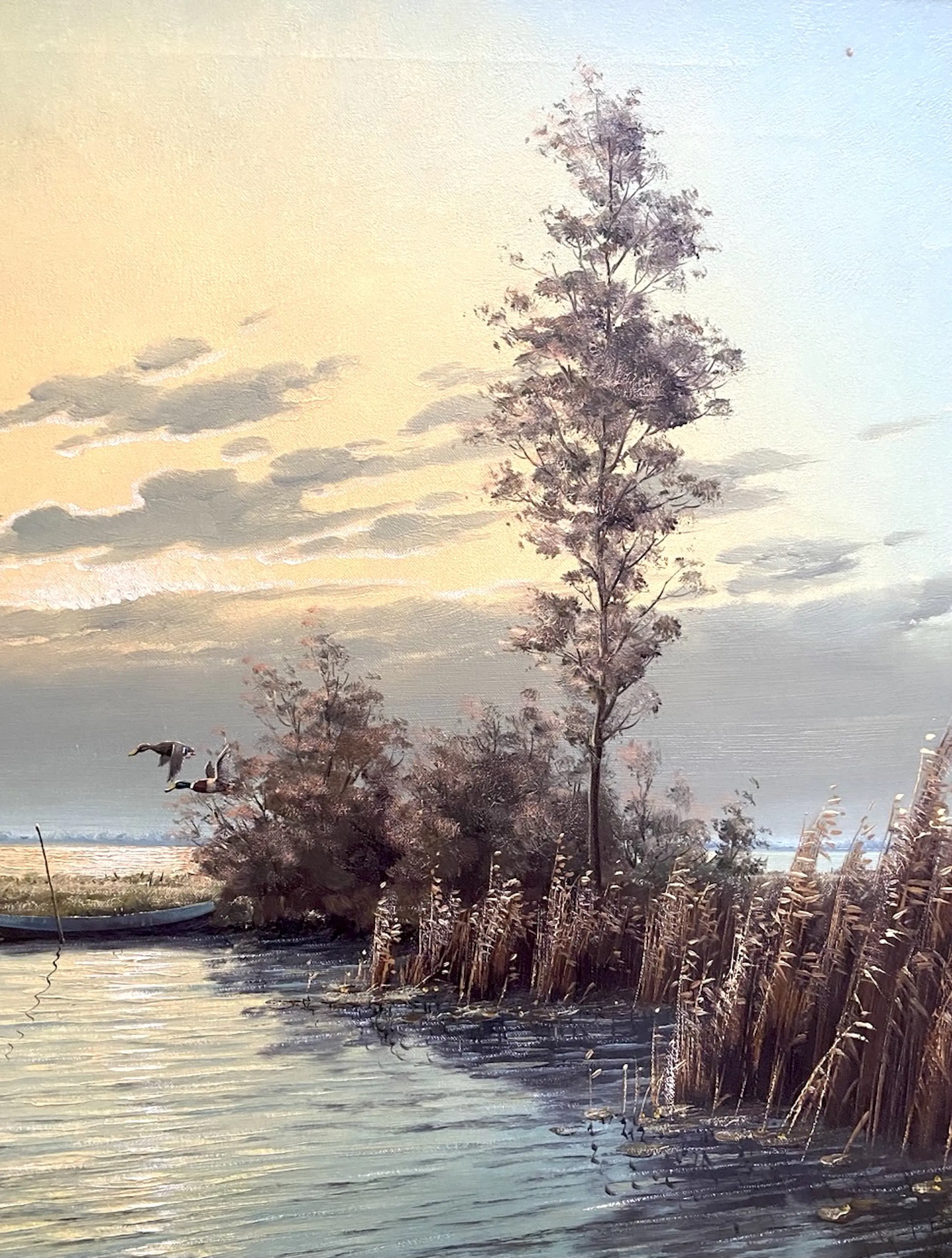 Prachtig zeer fijn realistisch geschilderd landschap schilderij van Gien Brouwer Het geeft een prachtig beeld weer van een typisch Hollands waterlandschap met eenden aan het water.