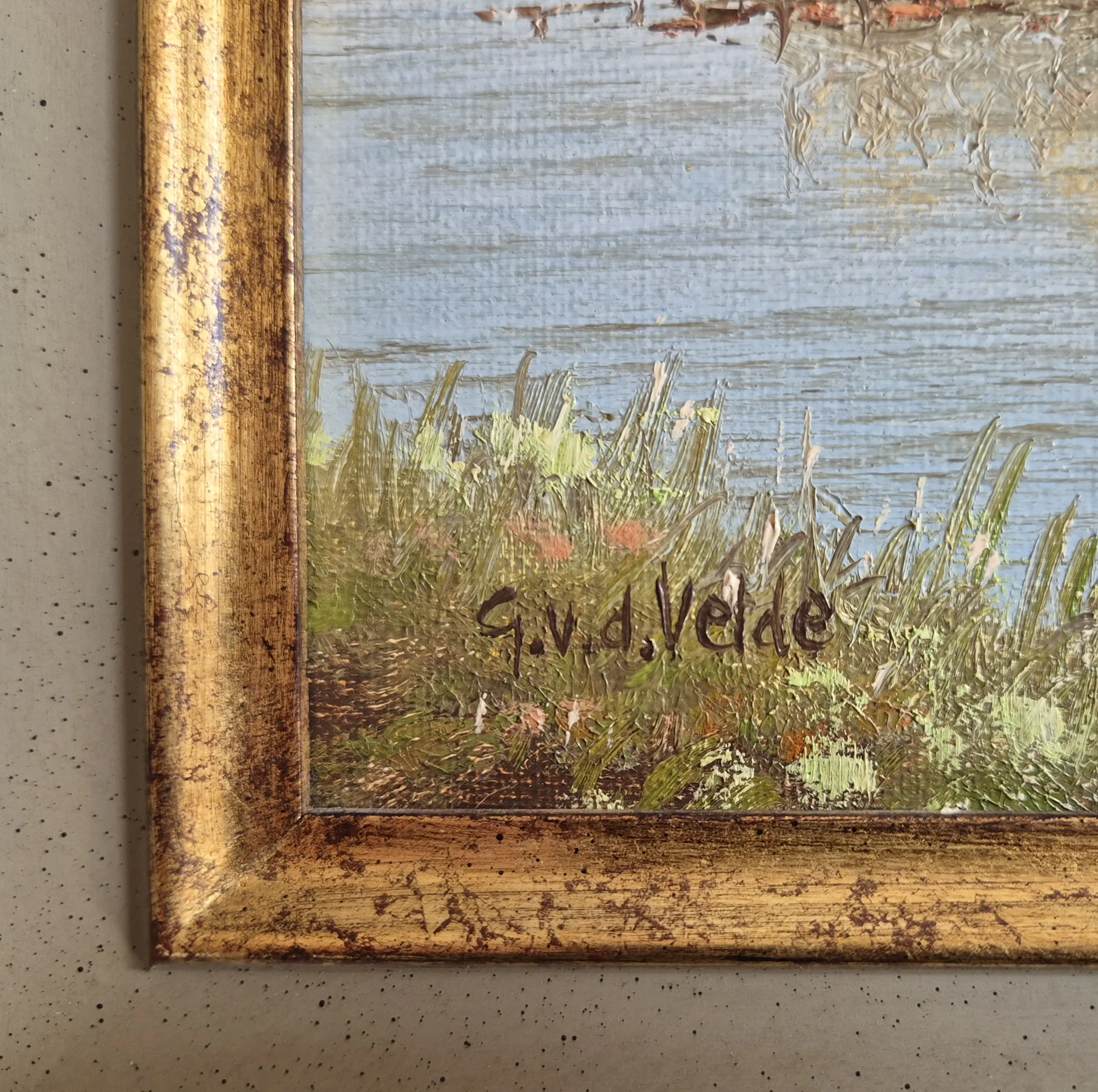 Sfeervol olieverfschilderij van de Nederlandse kunstenaar Gien Brouwer (geb. 1944), ook bekend onder het pseudoniem G. van de Velde.