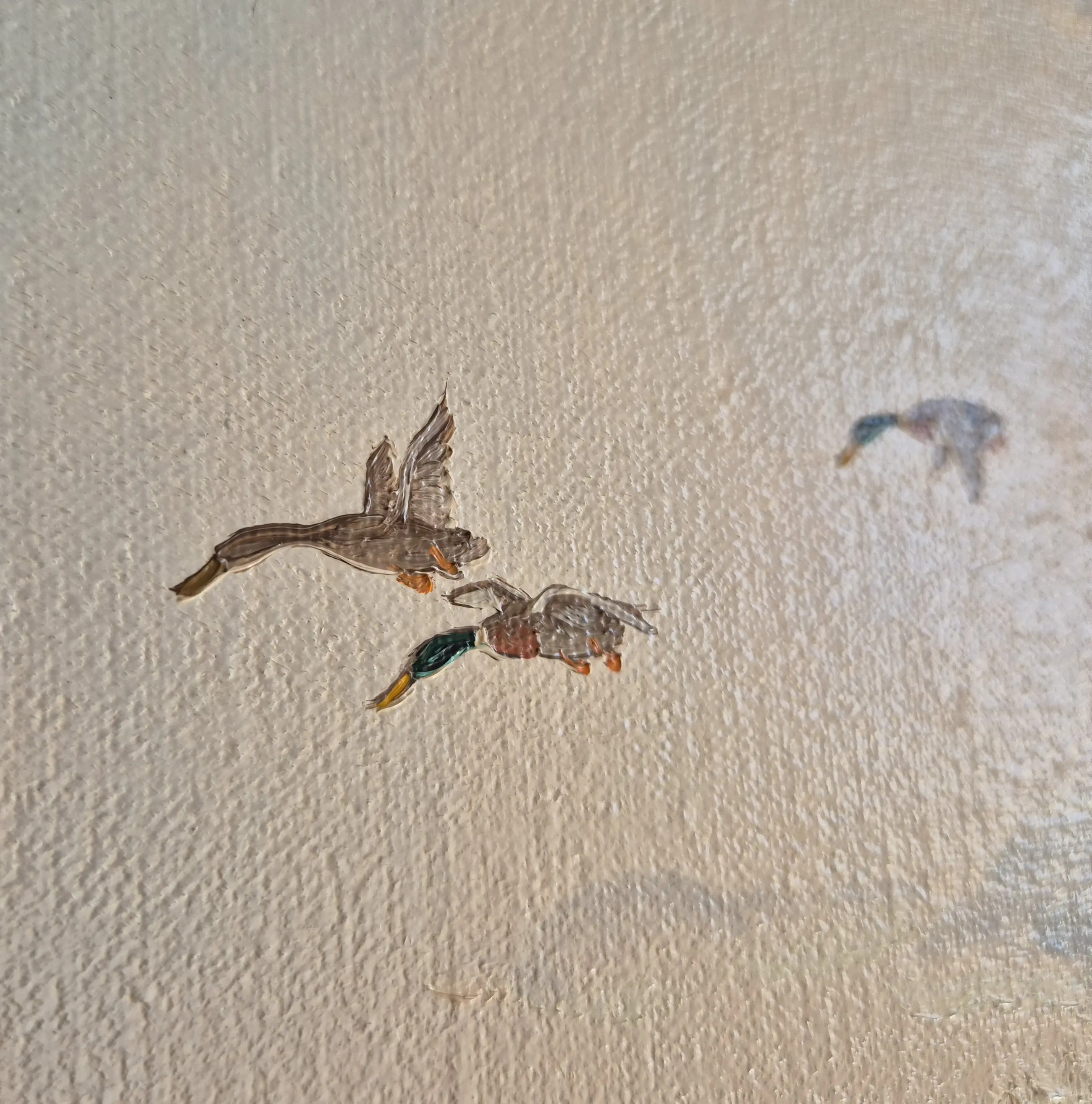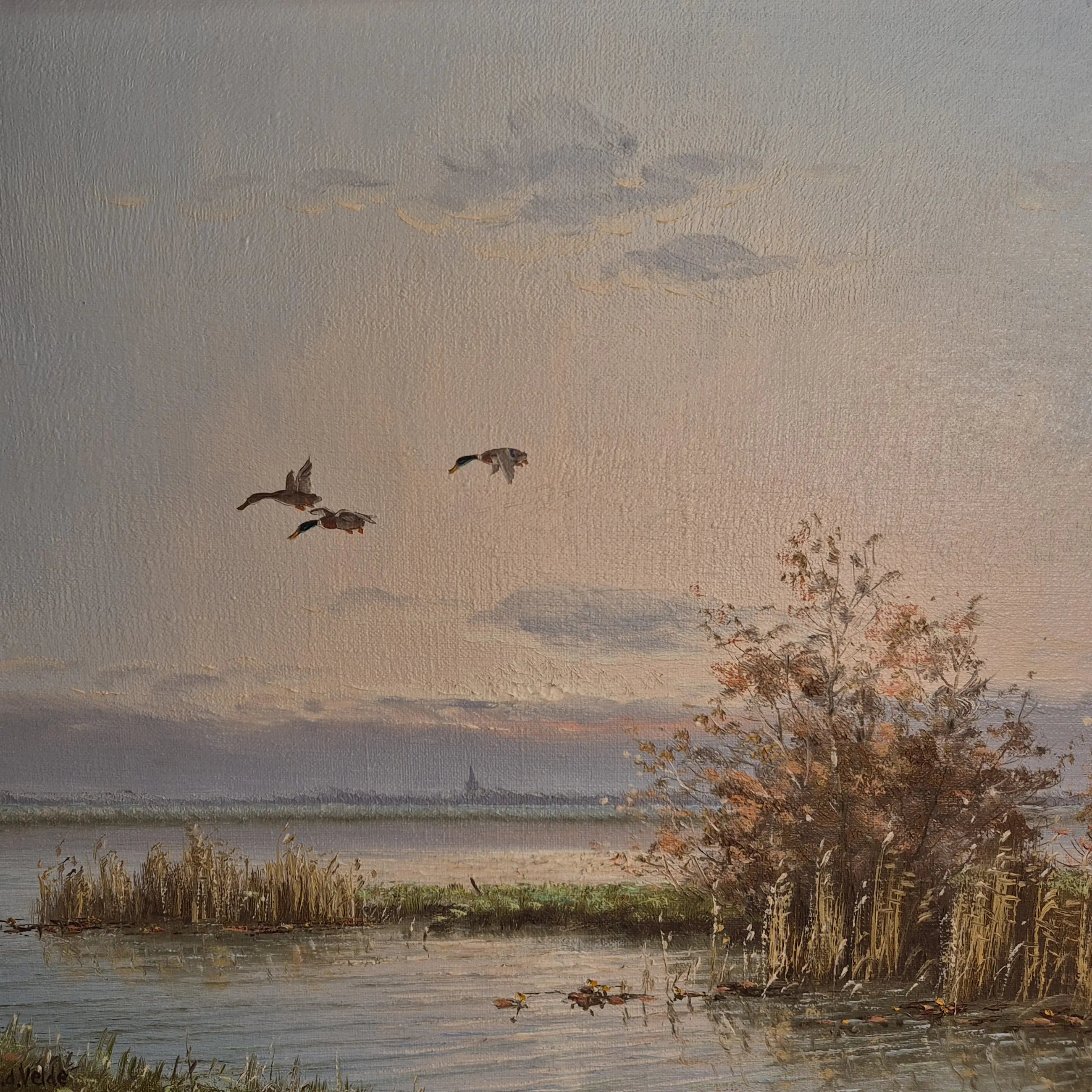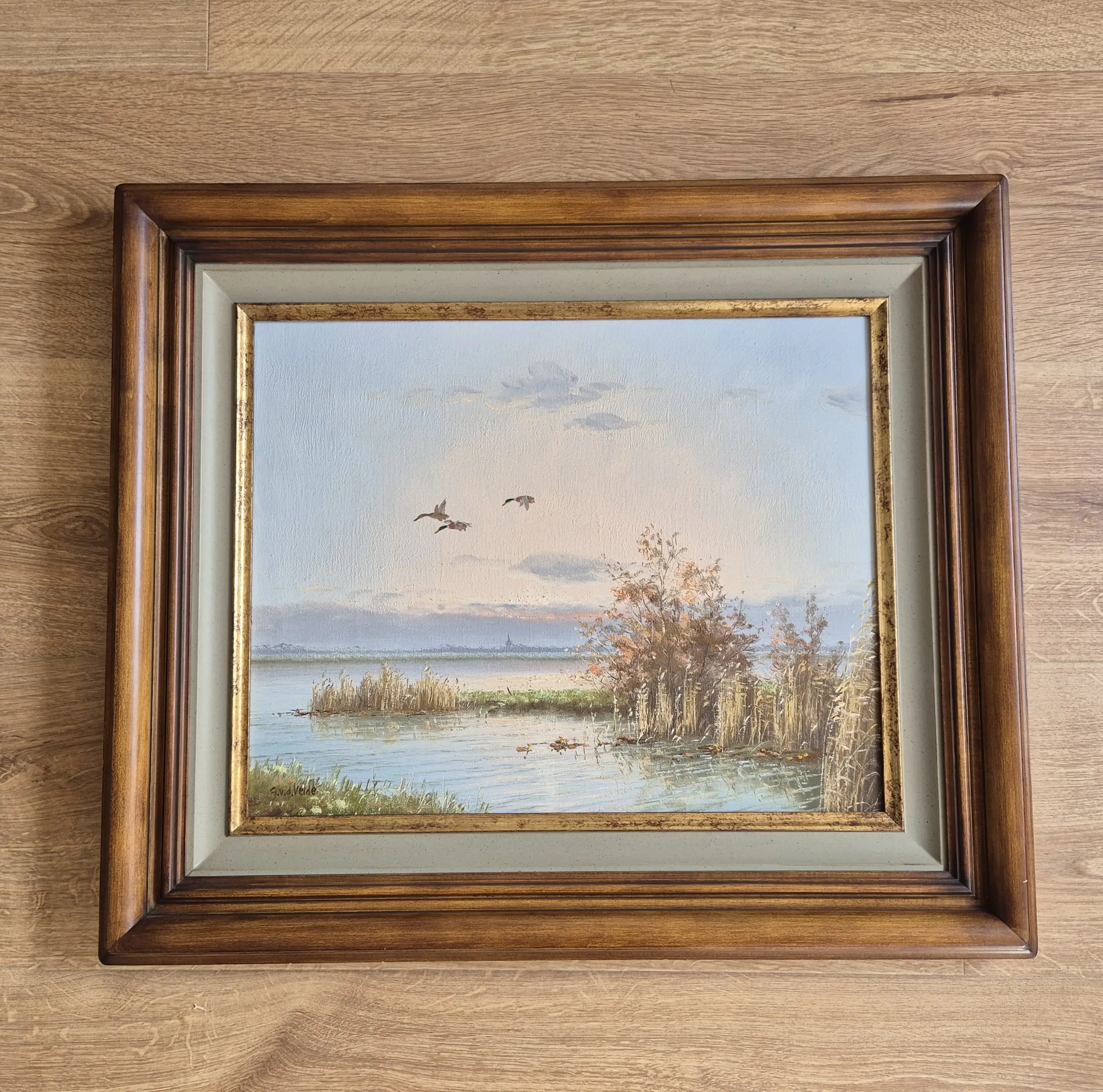 Het schilderij toont een klassiek Hollands polderlandschap met eenden in vlucht boven het water en rietkragen. De combinatie van realisme en impressionistische invloeden zorgt voor een levendige, rustgevende uitstraling die perfect past in een landelijk of klassiek interieur. Details: Kunstenaar: Gien Brouwer (alias G. van de Velde) Techniek: Olieverf op doek Onderwerp: Hollands polderlandschap met eenden Afmetingen doek: ca. 40 x 50 cm Afmetingen lijst: ca. 70 x 60 cm Staat: nette staat, direct op te hangen Gesigneerd (zoals gebruikelijk bij deze kunstenaar)