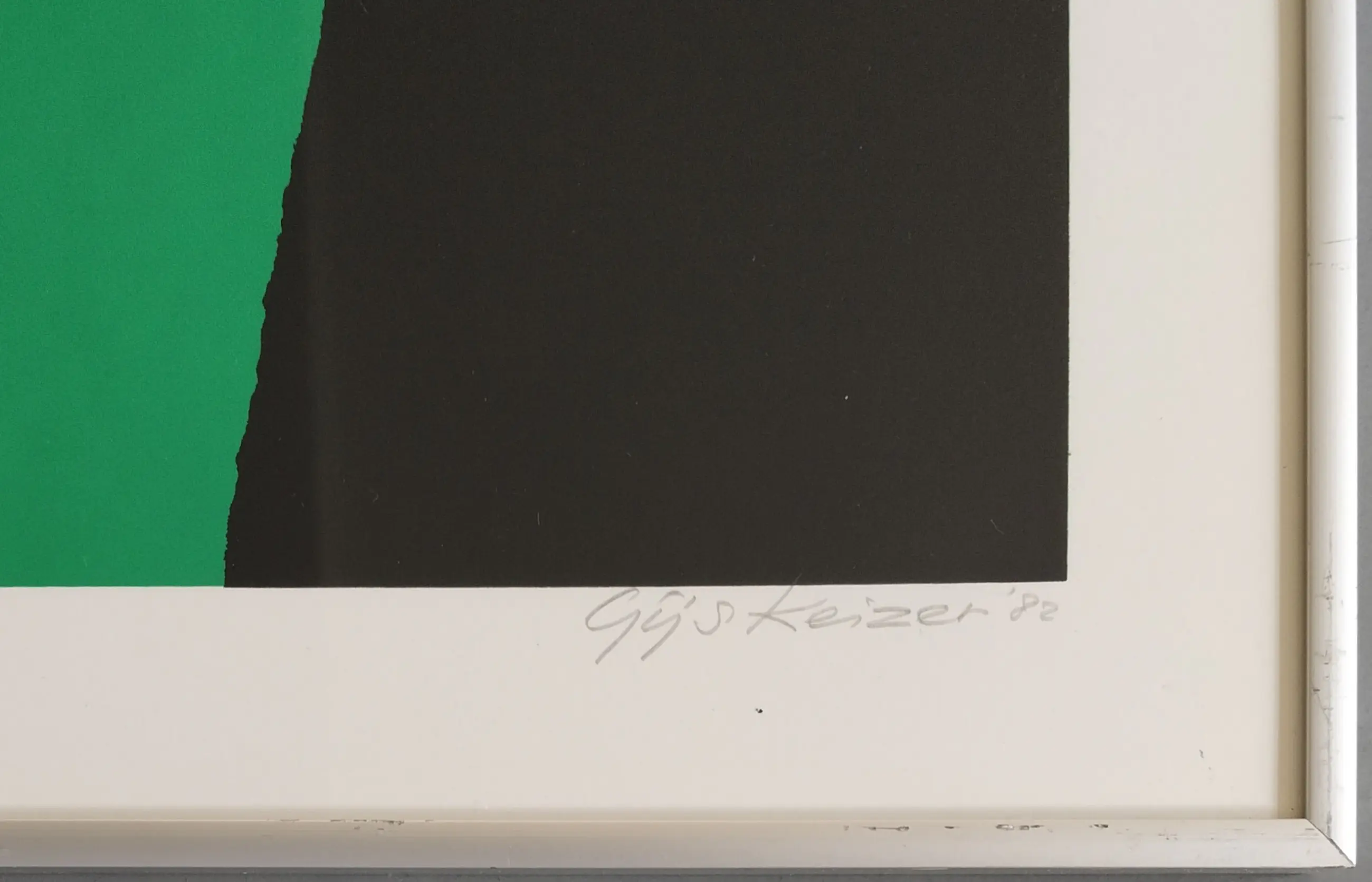 Zeefdruk van de kunstenaar Gijs Keizer (1933) Het werk rechtsonder gesigneerd en gedateerd 82 linksonder genummerd 6/10 e.d. Afmeting beeld 42 x 42 Afmeting lijst 50.5 x 50.5 cm (hxb) De zeefdruk is in goede staat. Op de aluminium lijst zijn krassen zichtbaar.