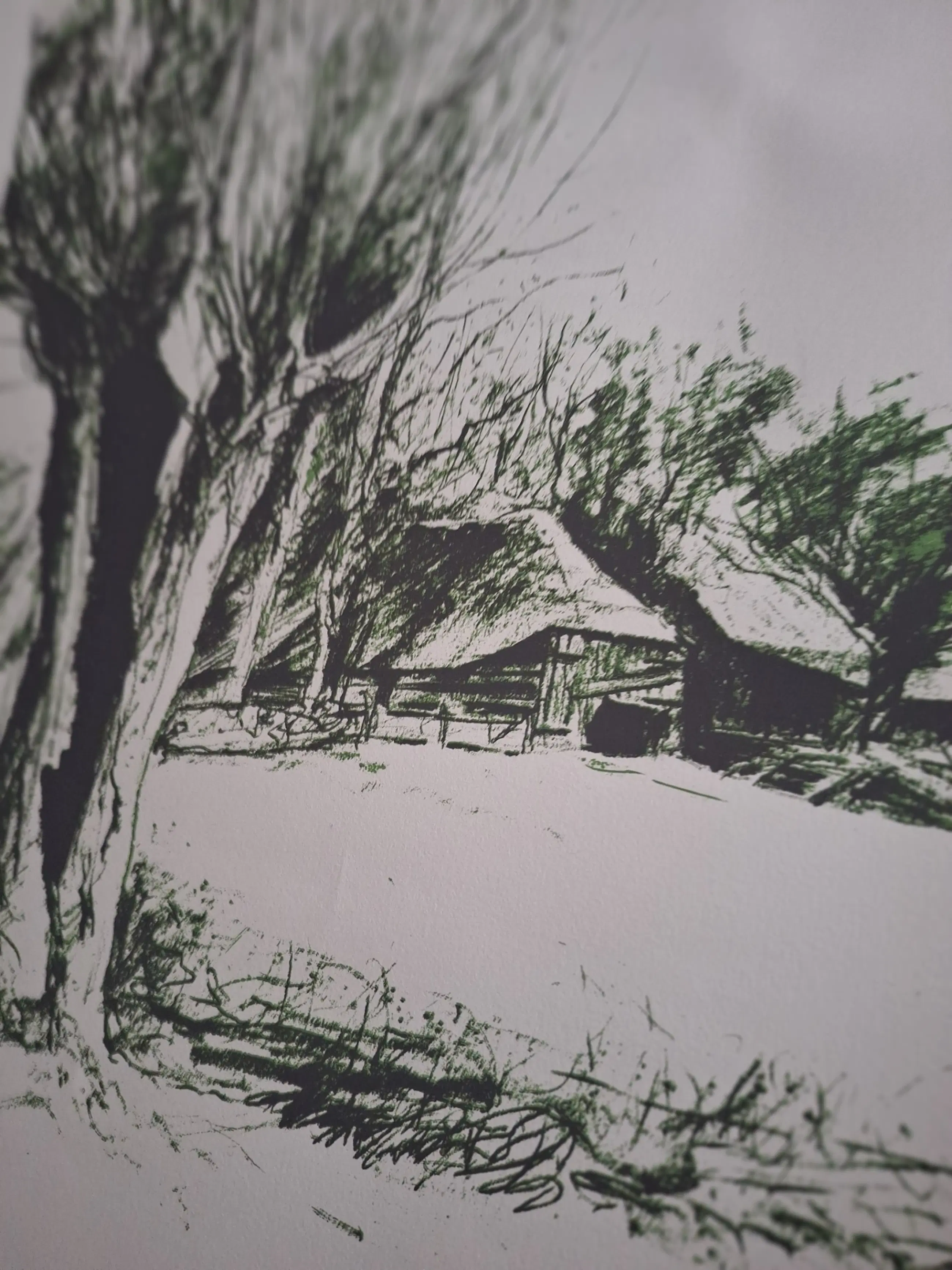 De kunstenaar Gijs Keizer is ook geboren in het dorp Hoogland , waar deze tekening door hem gemaakt is. De Zeefdruk is gedrukt in eigen beheer.
