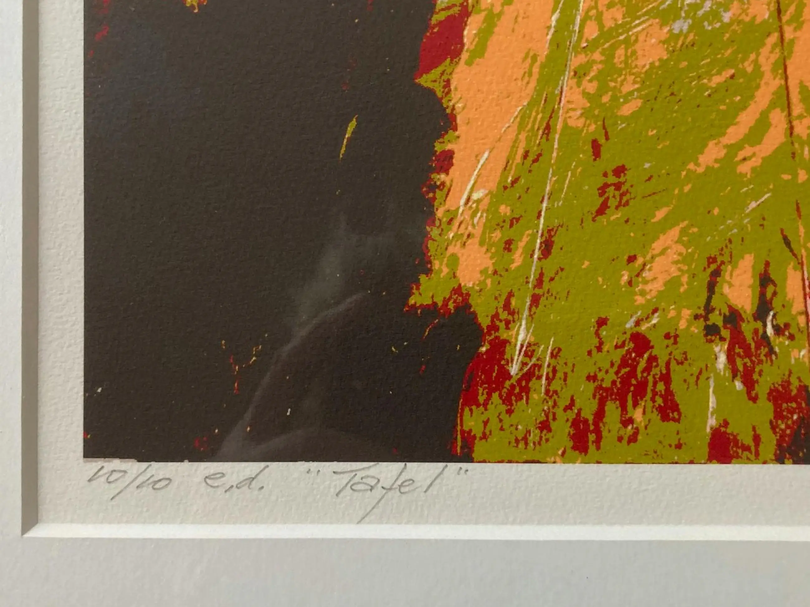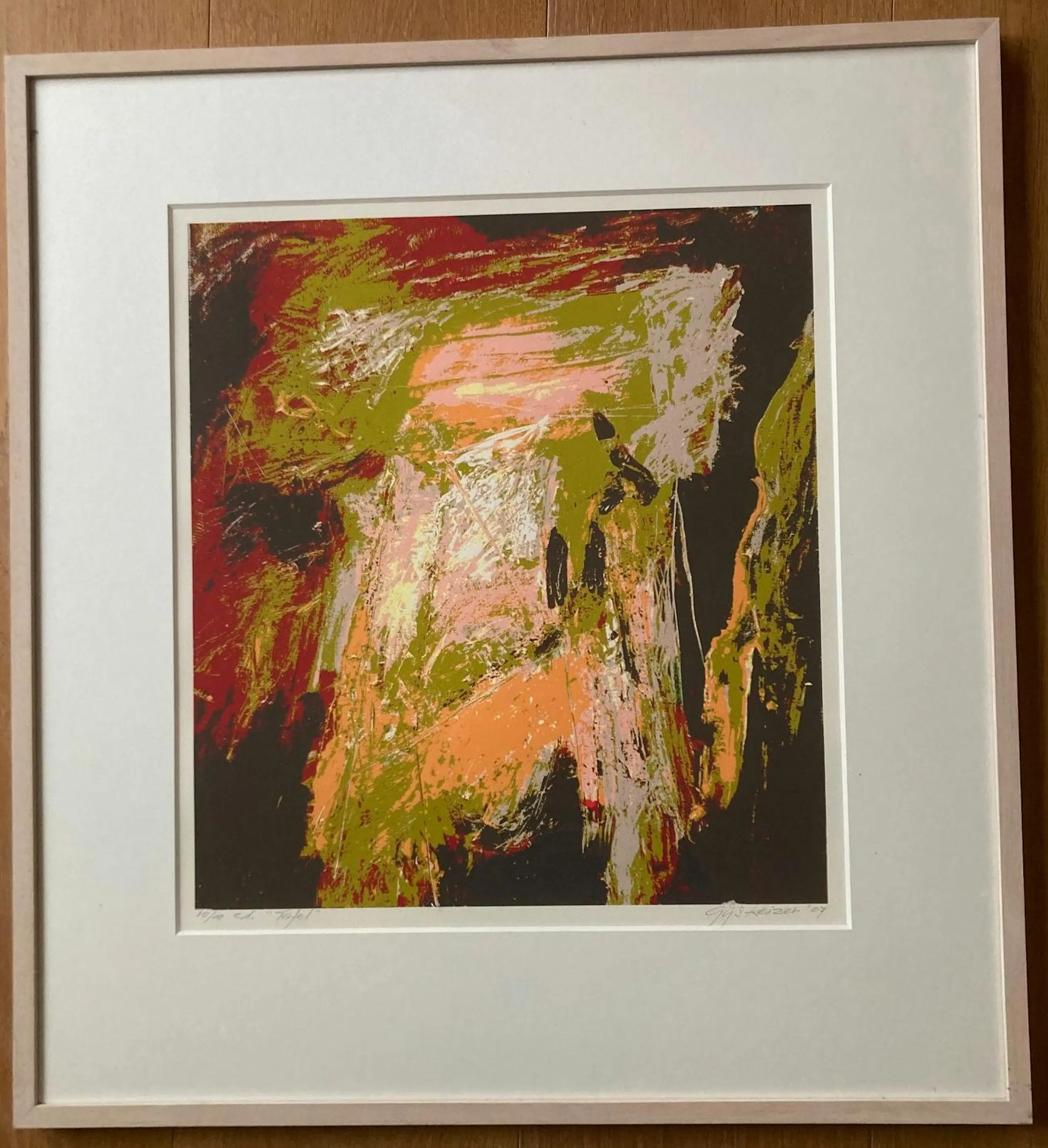 Een abstract werk in heldere kleuren. Een lichte, houten lijst. Een tweede werk in dezelfde kleuren, afmetingen, stijl, jaartal en lijst wordt tegelijkertijd aangeboden.