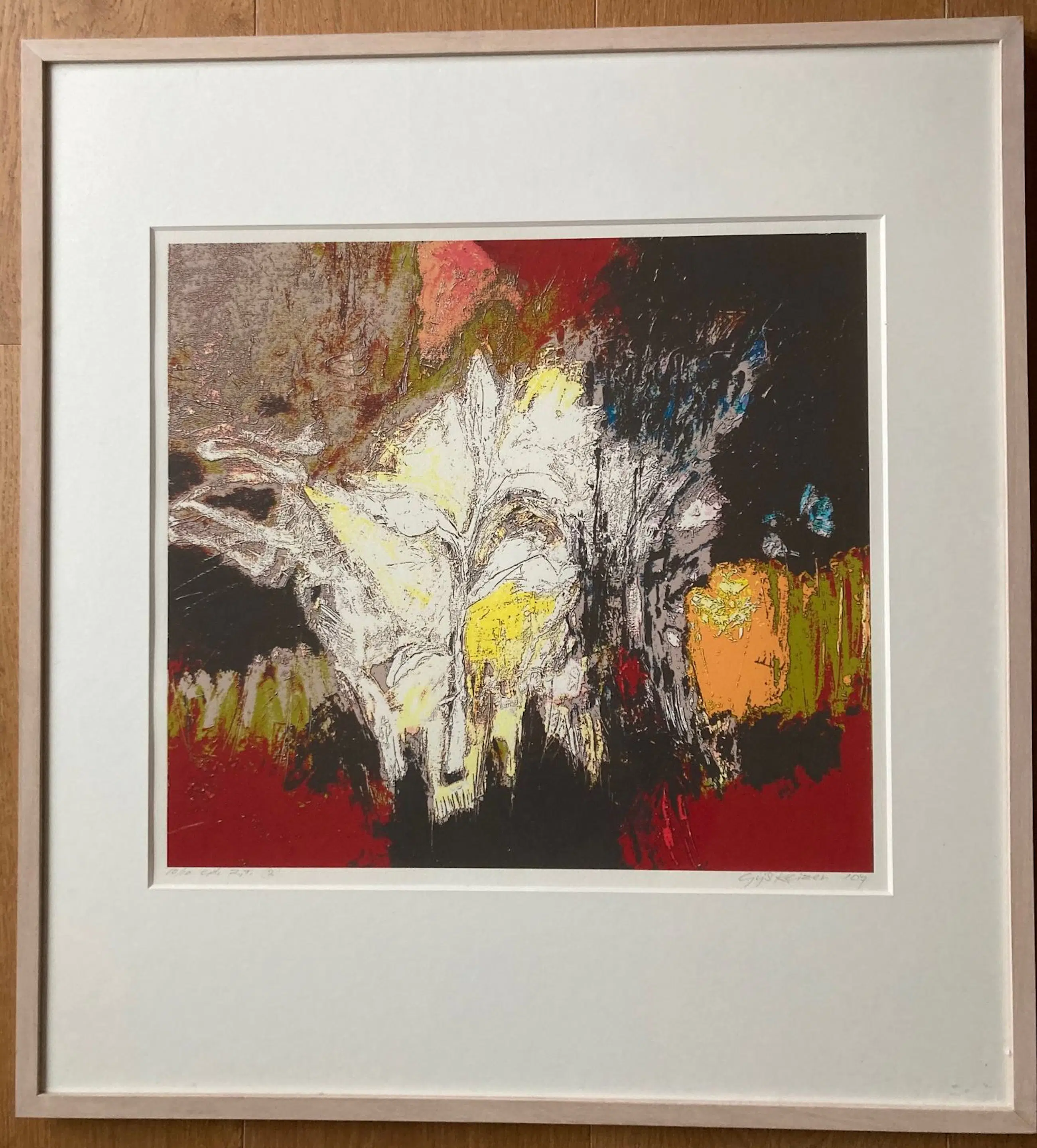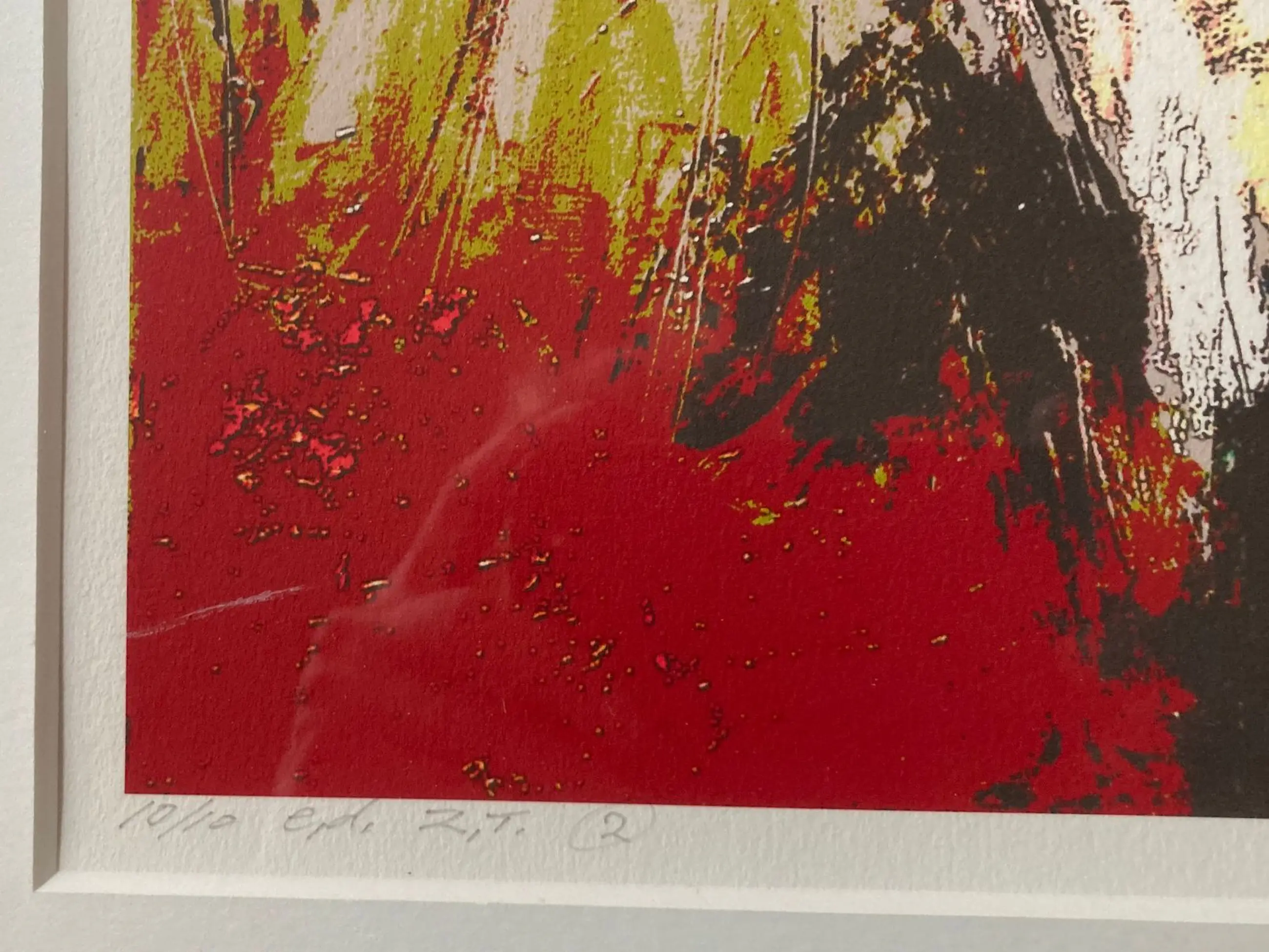 Twee abstracte werk in heldere kleuren met een lichte houten lijst. De twee werken hebben dezelfde kleuren, stijl, jaartal, afmetingen en lijst. Zonder titel: foto's 1 - 3. Tafel: foto's 4 - 6.