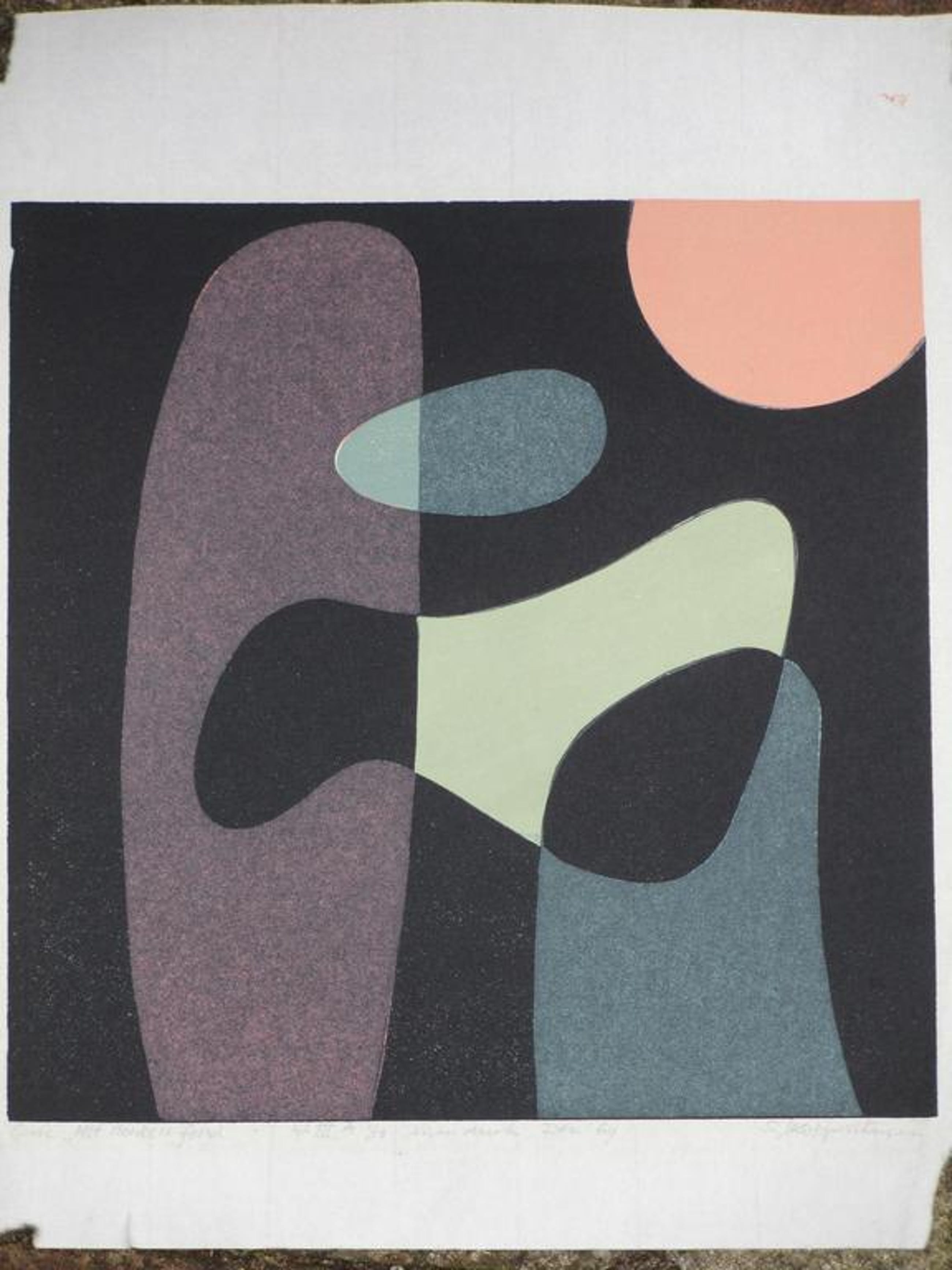 Geometrisch kleurenhoutsnede door Gijs Koppenhagen.