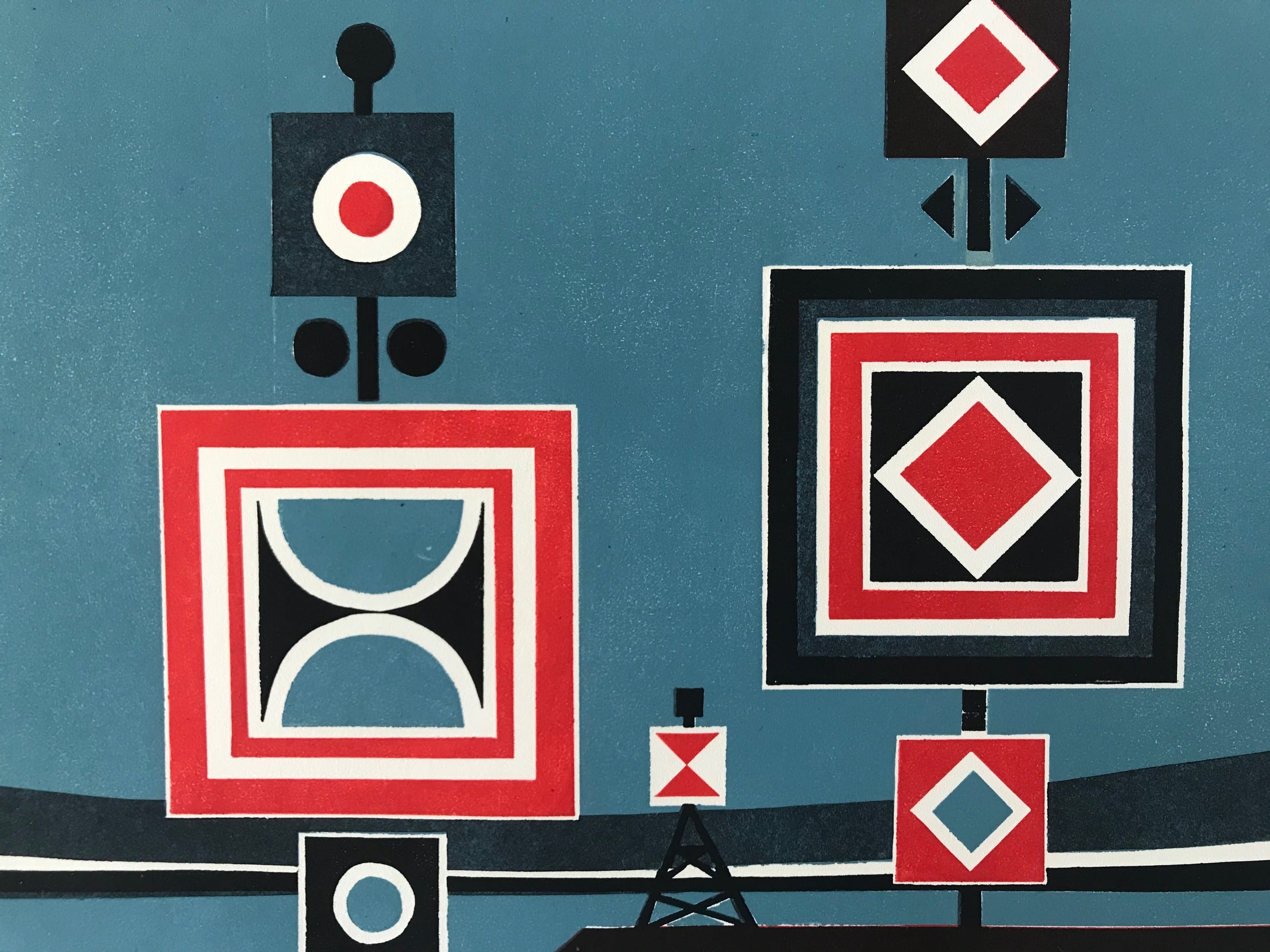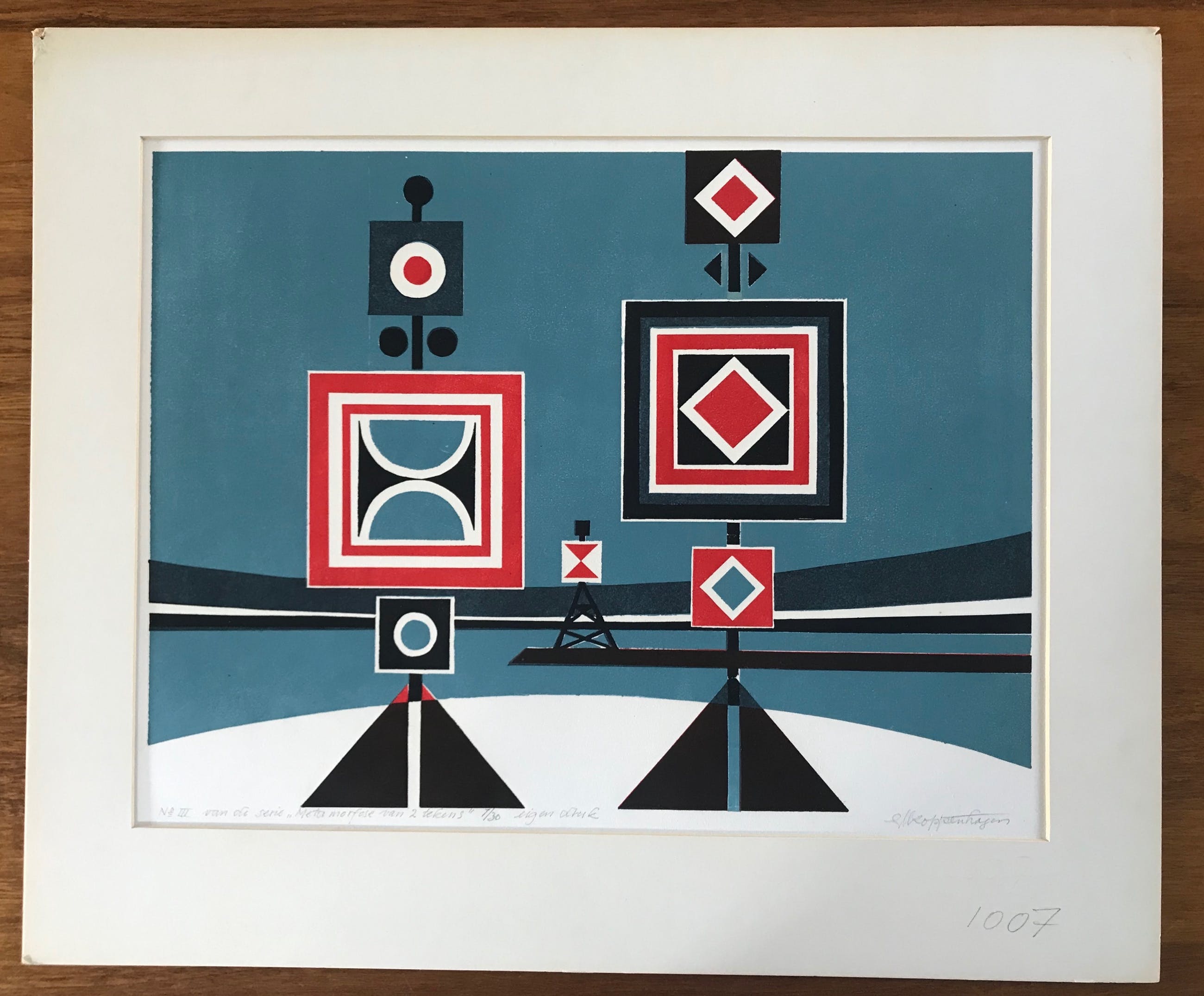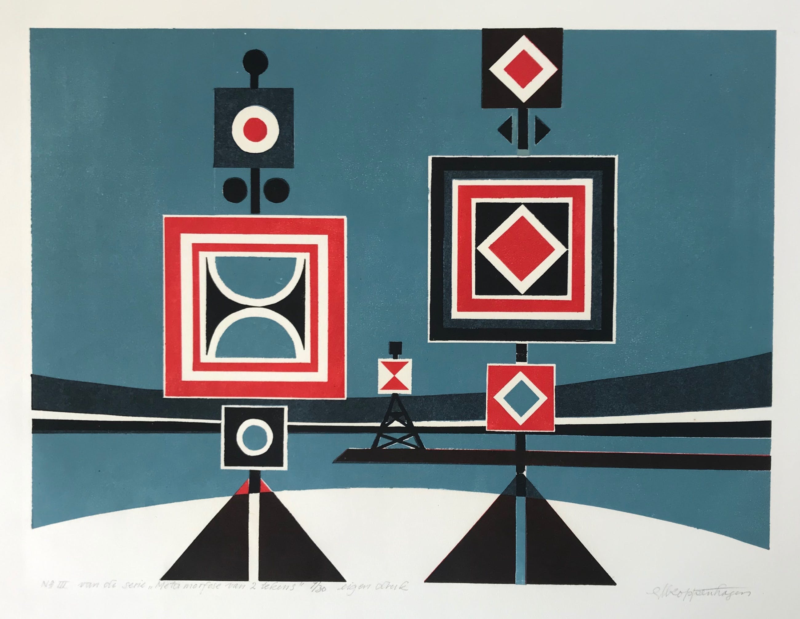 Kleurenhoutsnede door G.J. van Koppenhagen. Voorstelling van een ruimtelijke compositie Gesigneerd in potlood r.o. 'GJ Koppenhagen' Annotatie en nummering l.o. en m.o. 'No III van de Serie "Metamorfose van 2 tekens" 7/30 eigen druk 1974