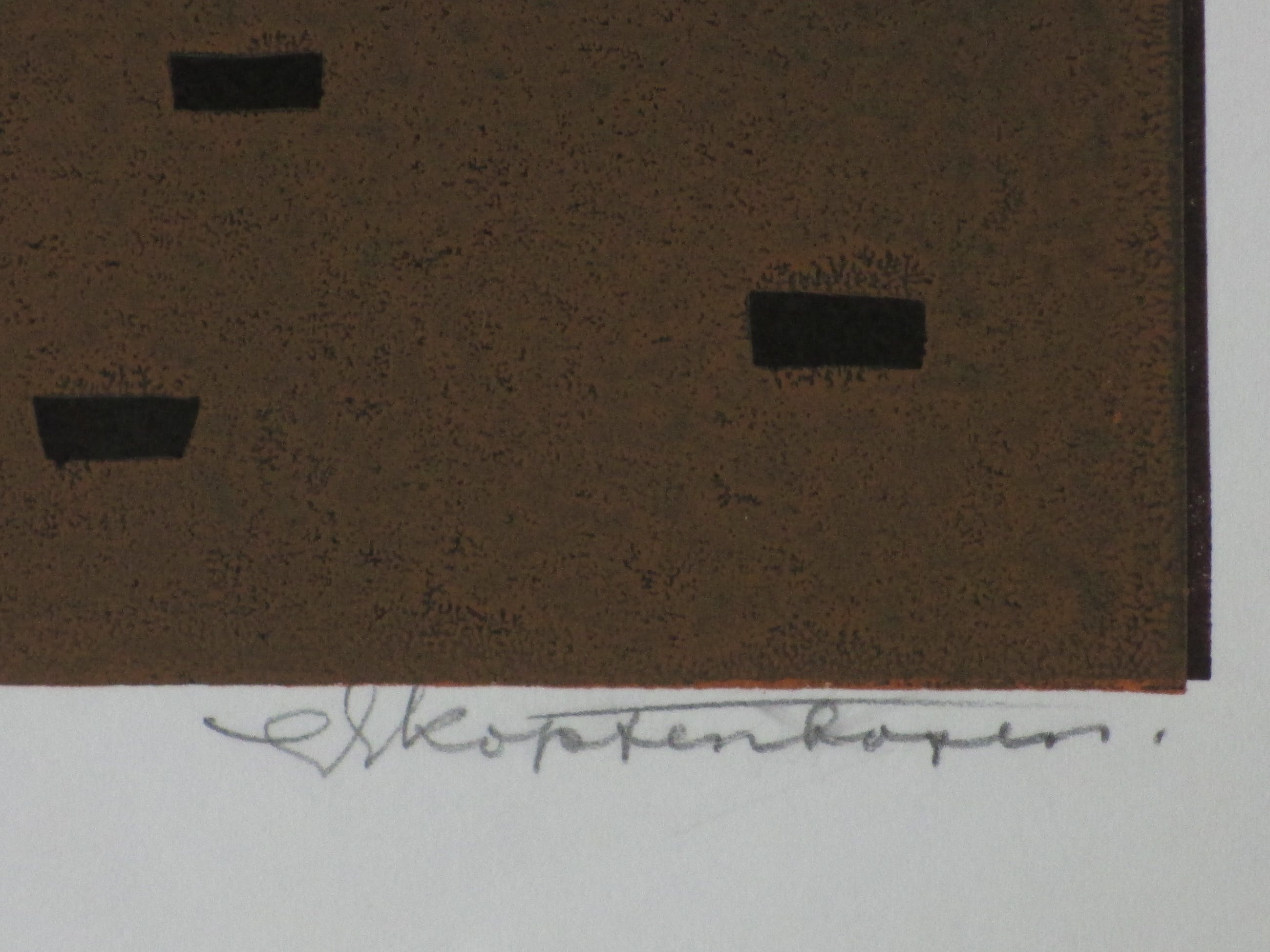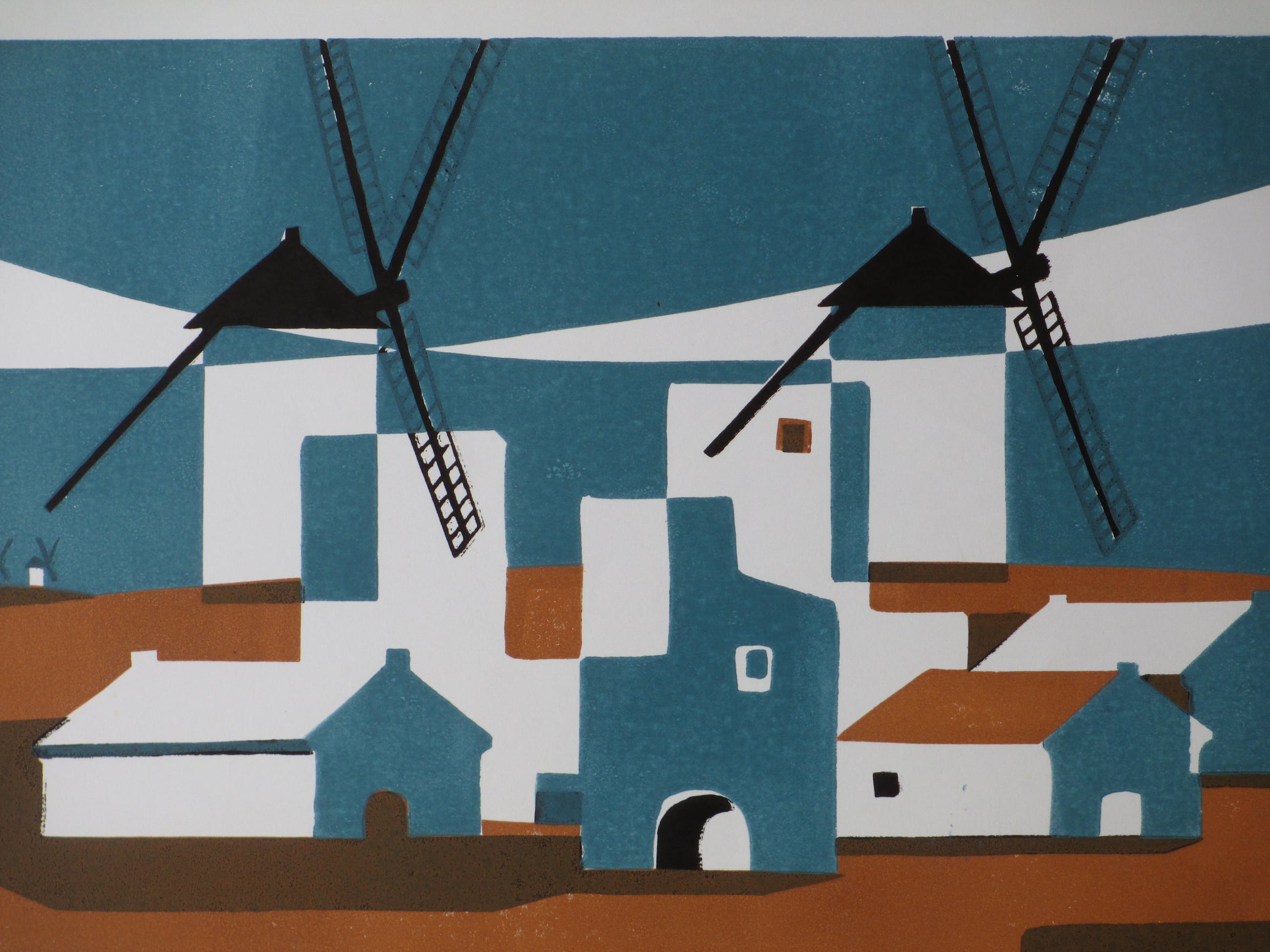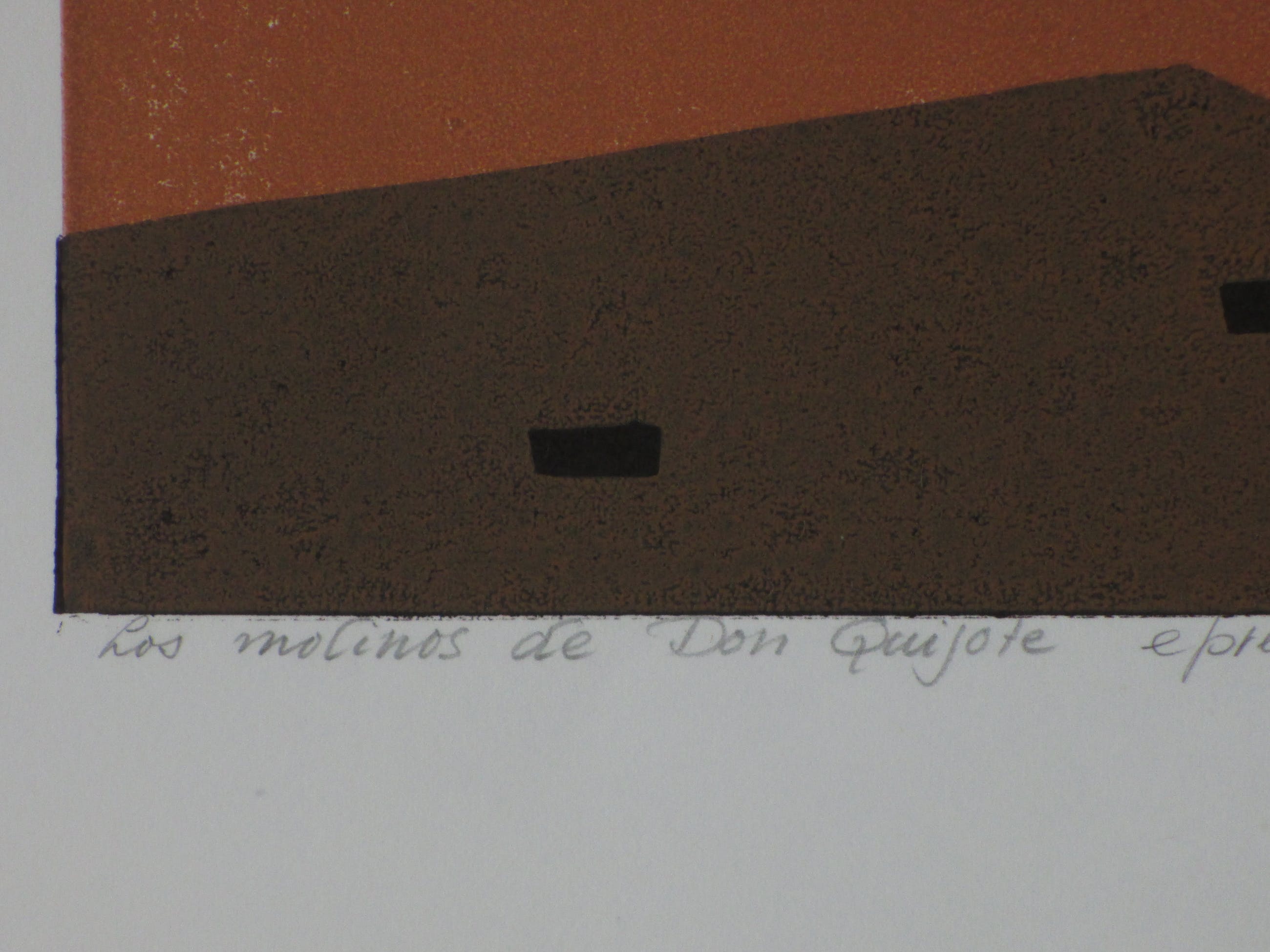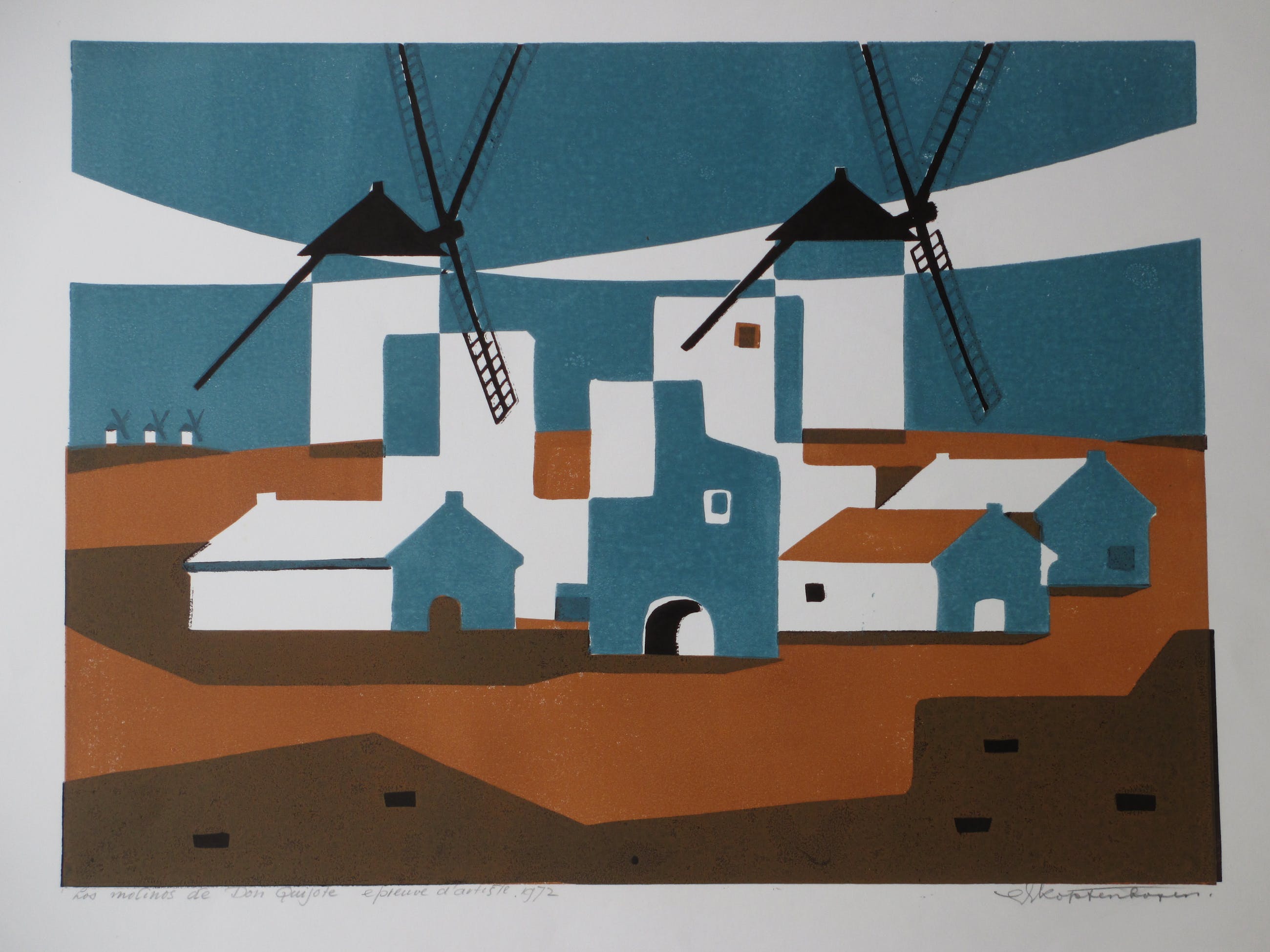 Kleurenhoutsnede door G.J. van Koppenhagen Voorstelling van de molens van Don Quichote Losbladig, beeldmaat 35x46, bladmaat 50x65 Gesigneerd in potlood r.o. Getiteld en gedateerd '1972'l.o. Authenticiteit volledig gegarandeerd