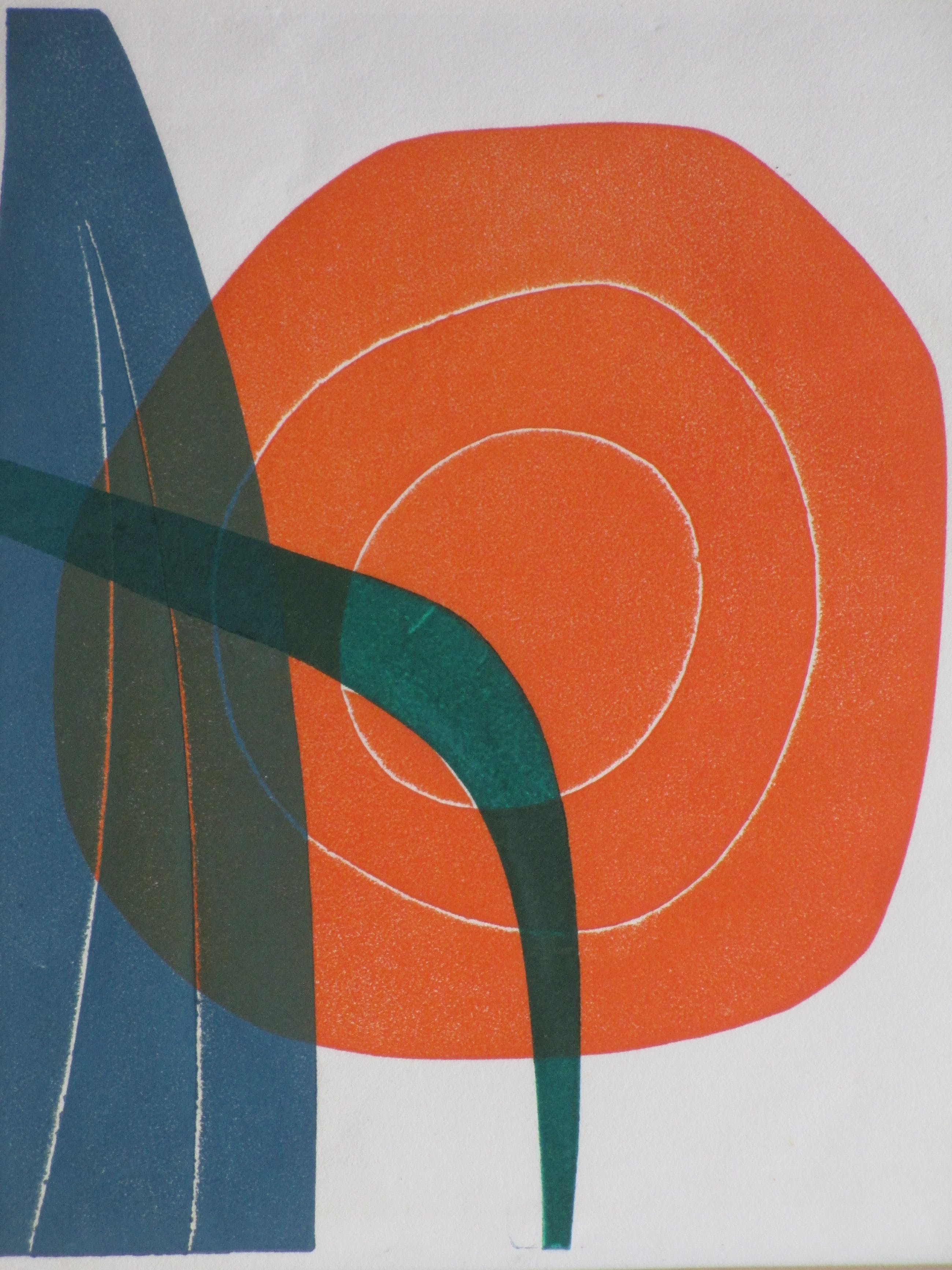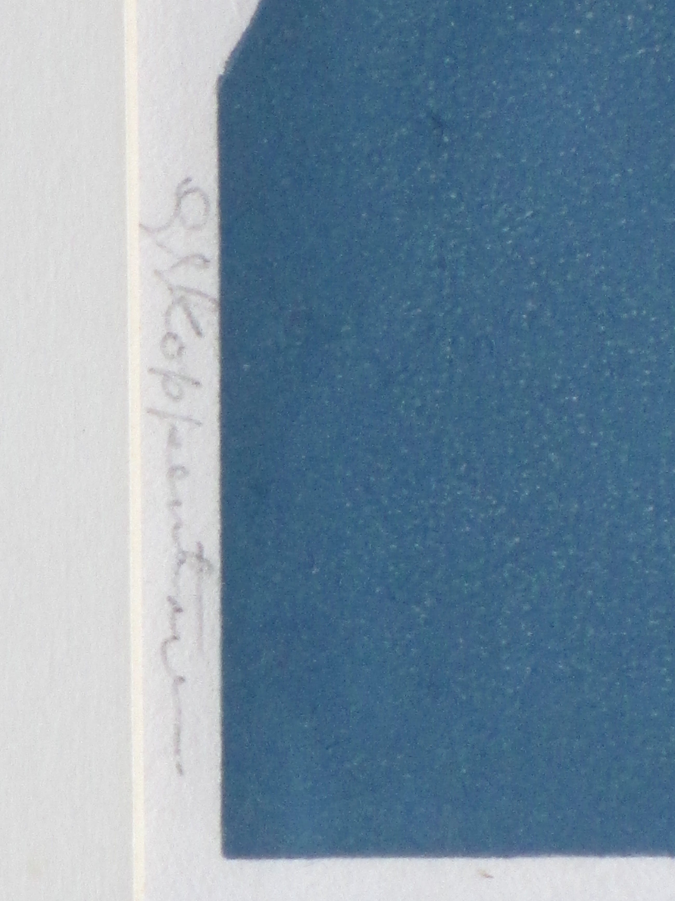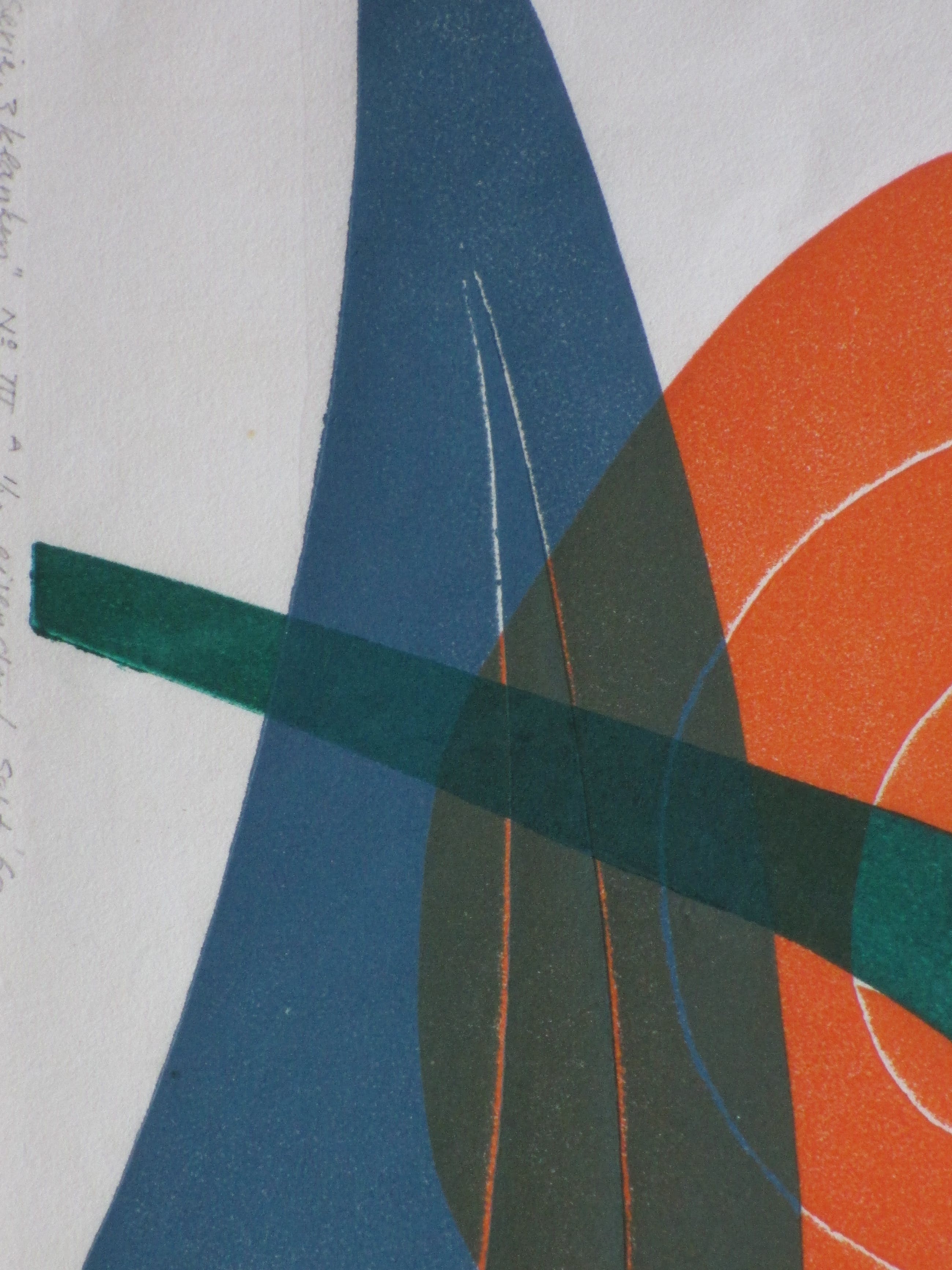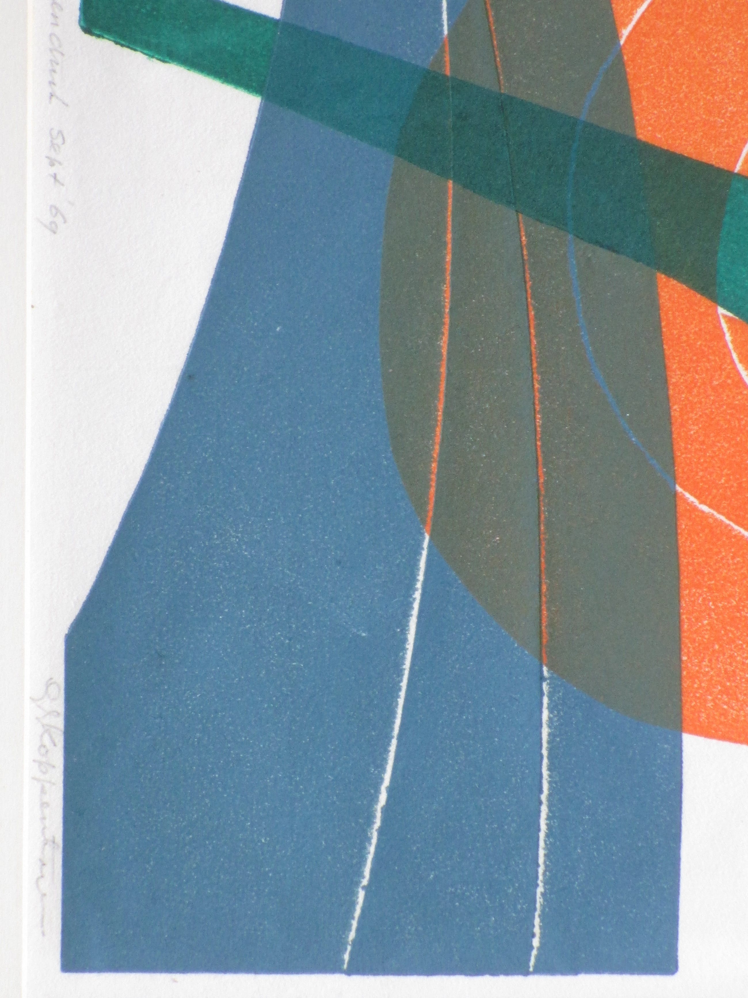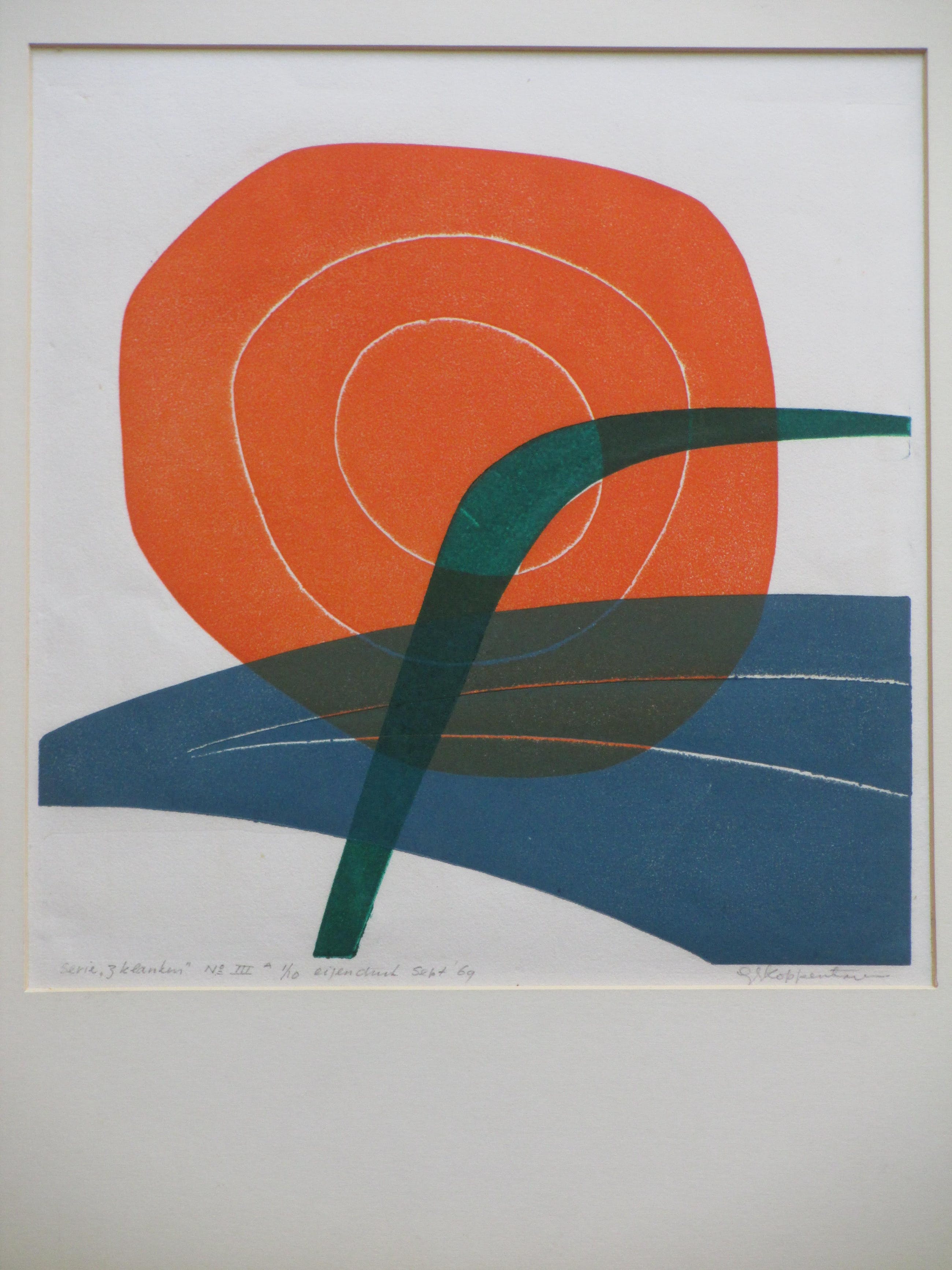 Kleurenhoutsnede door G.J. van Koppenhagen Voorstelling getiteld: 'serie 3 klanken, No III' Gesigneerd in potlood r.o. 'G.J.van Koppenhagen' Nummering en datering m.o. '1/10' en 'Sept '69' Authenticiteit volledig gegarandeerd