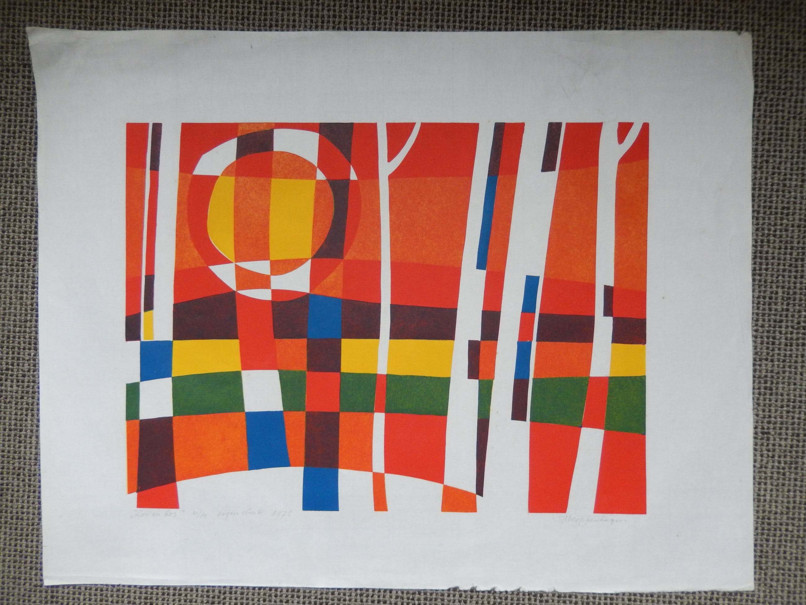 Kleurenlitho van Gijsbert Jan van Koppenhagen, titel: Zon en bos. Gedateerd en gesigneerd.