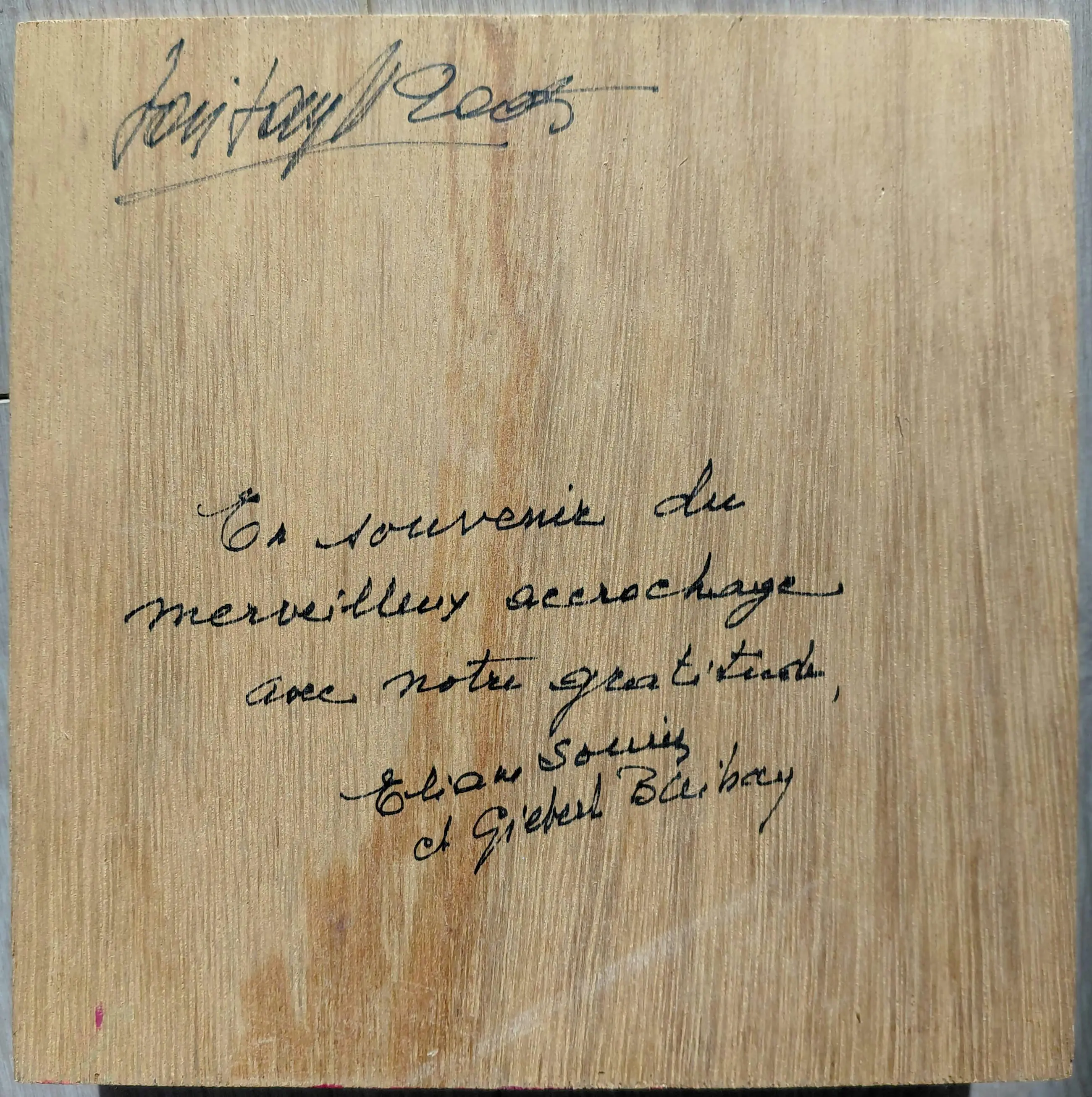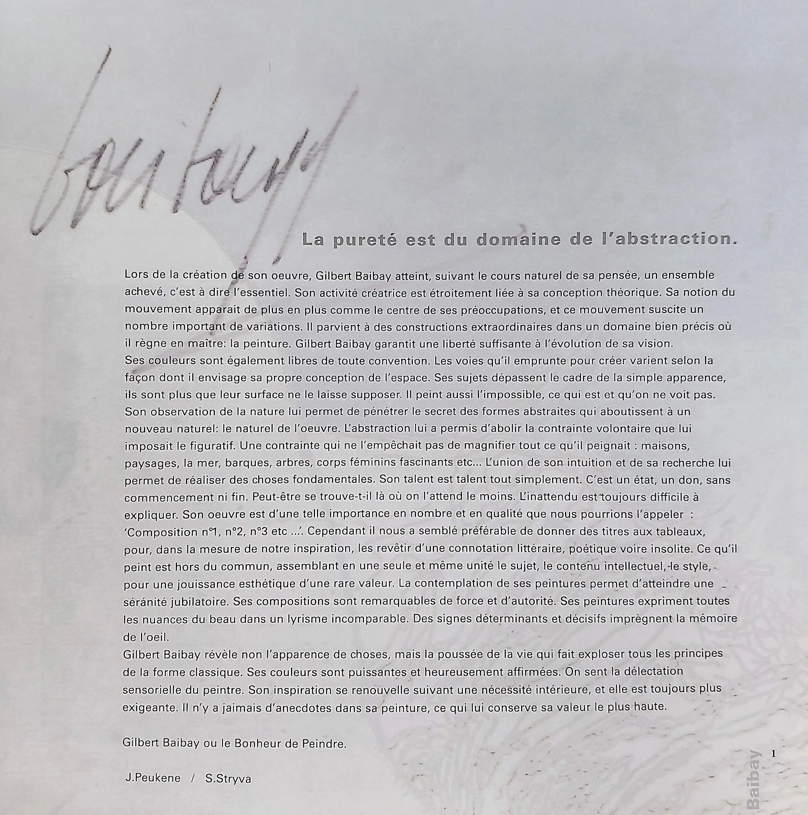 Leuk abstract werkje van de Belgische kunstenaar Gilbert Baibay. Olieverf op triplex, achterop gesigneerd en met opdracht. In zeer goede conditie. Wordt geleverd met begeleidend boekje over de kunstenaar uitgegeven door Galerie A.M.I. (Verviers).
