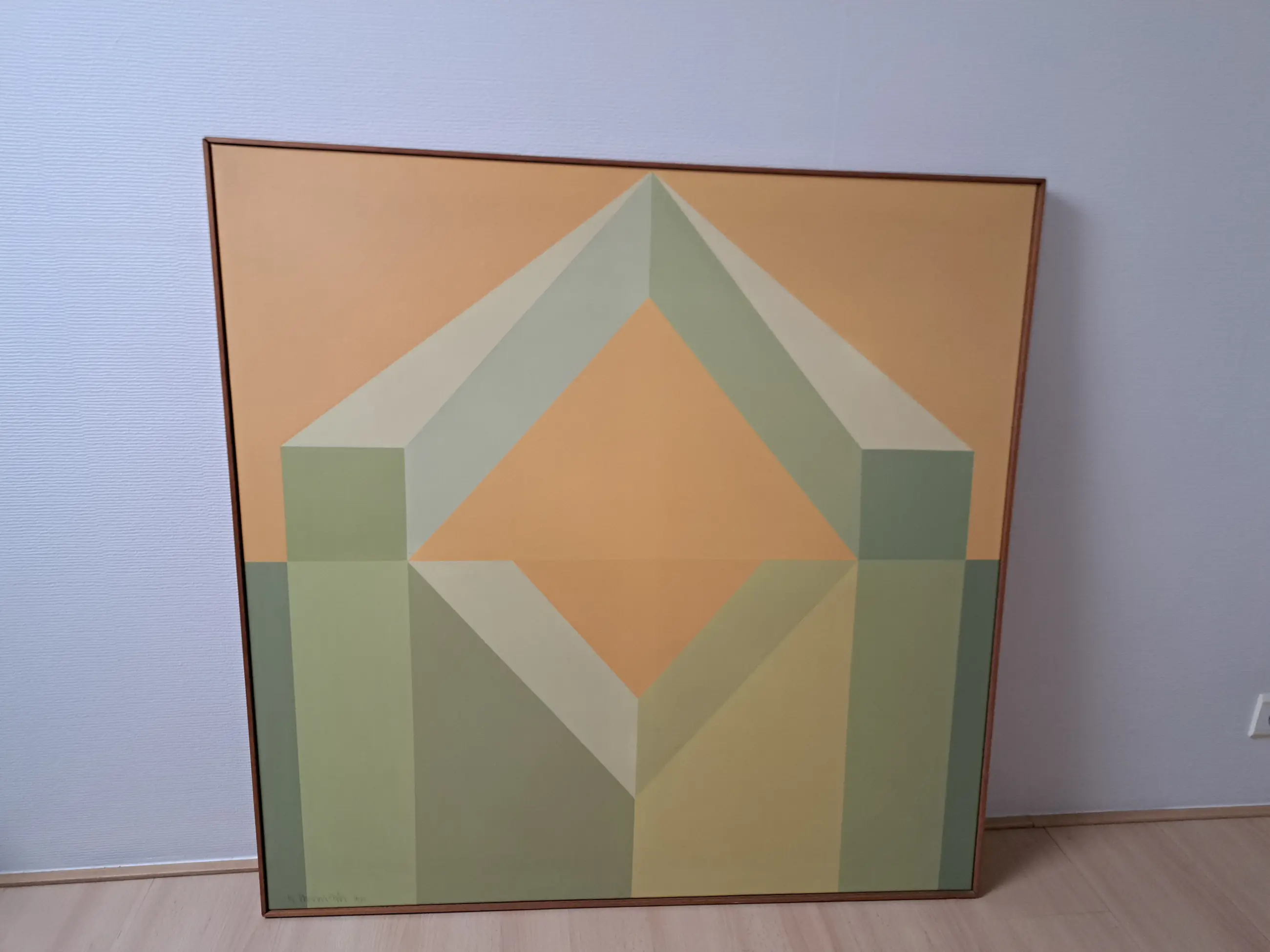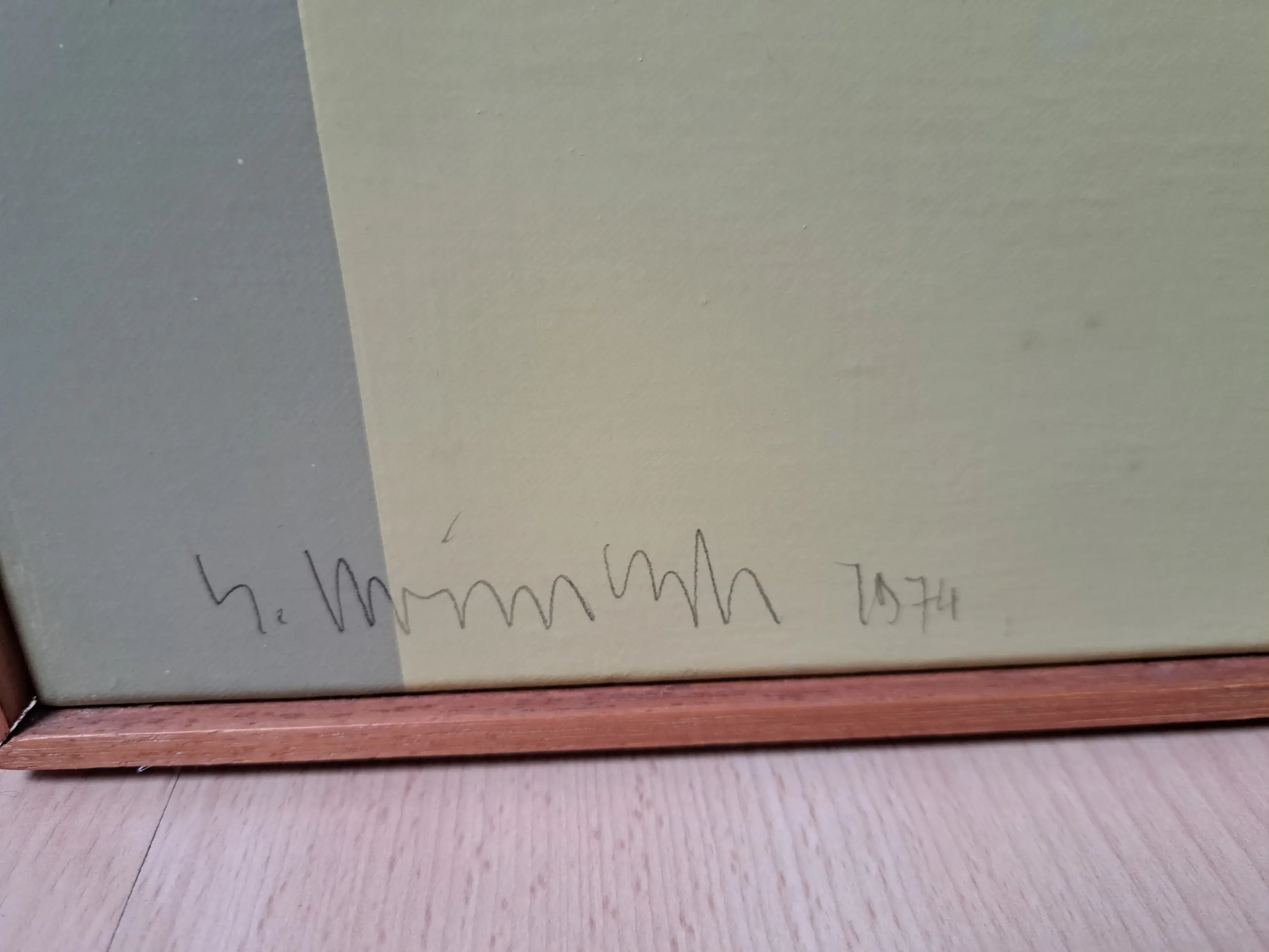 Dit werk is uit zijn groen gele periode. Er is een kleine indueking ter grootte van een euromunt in het doek. Verder is het werk en kader in prima staat.