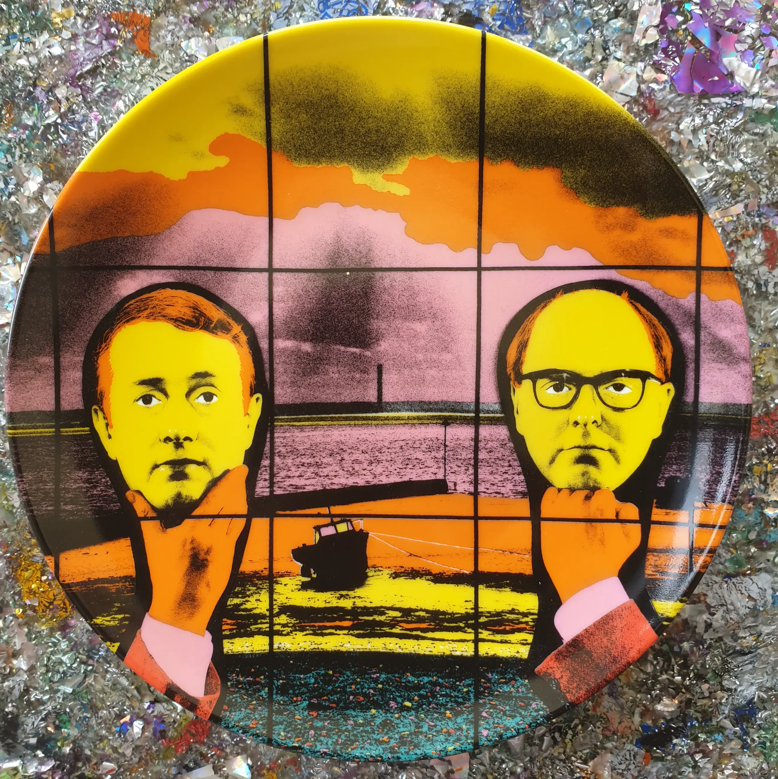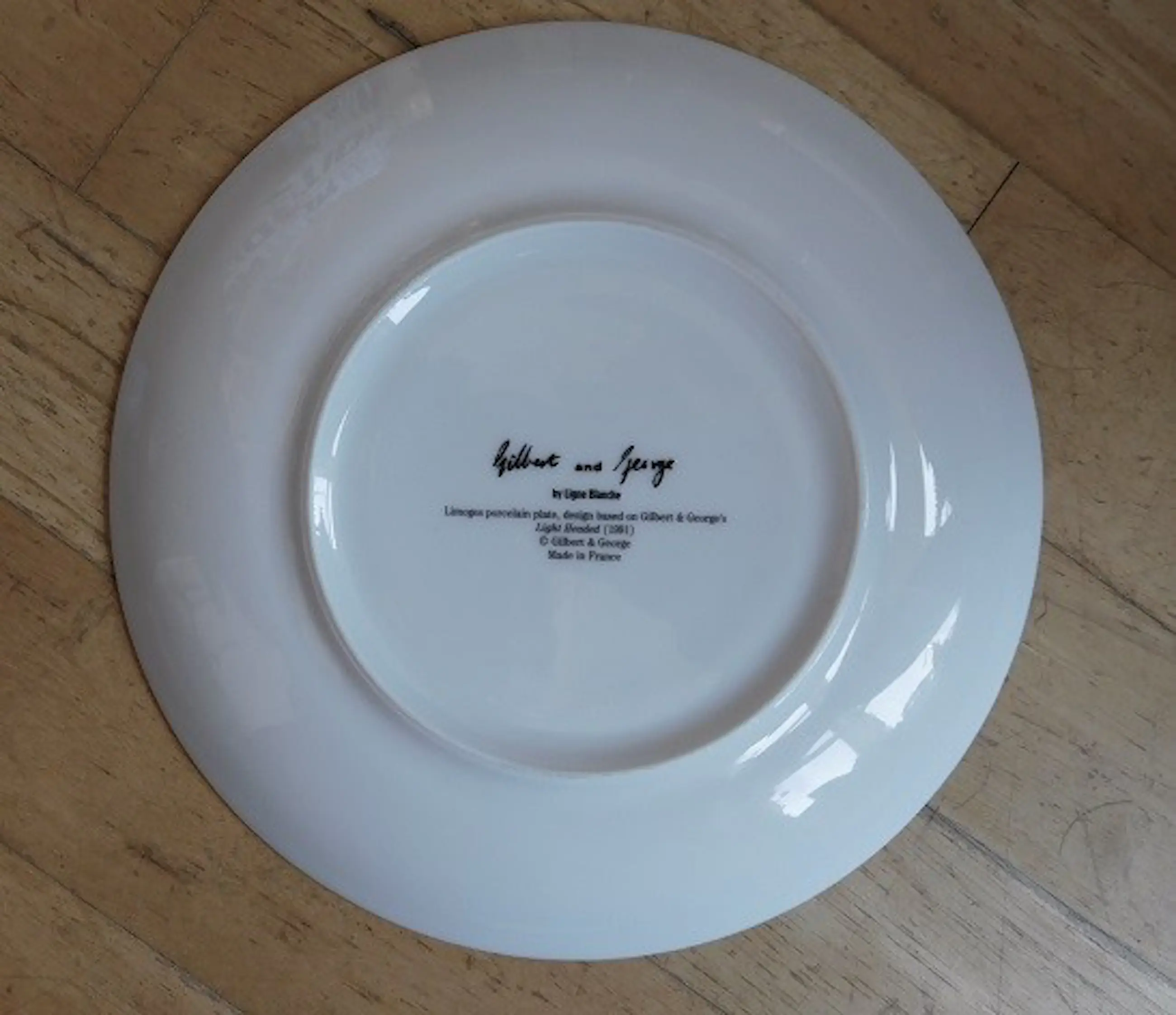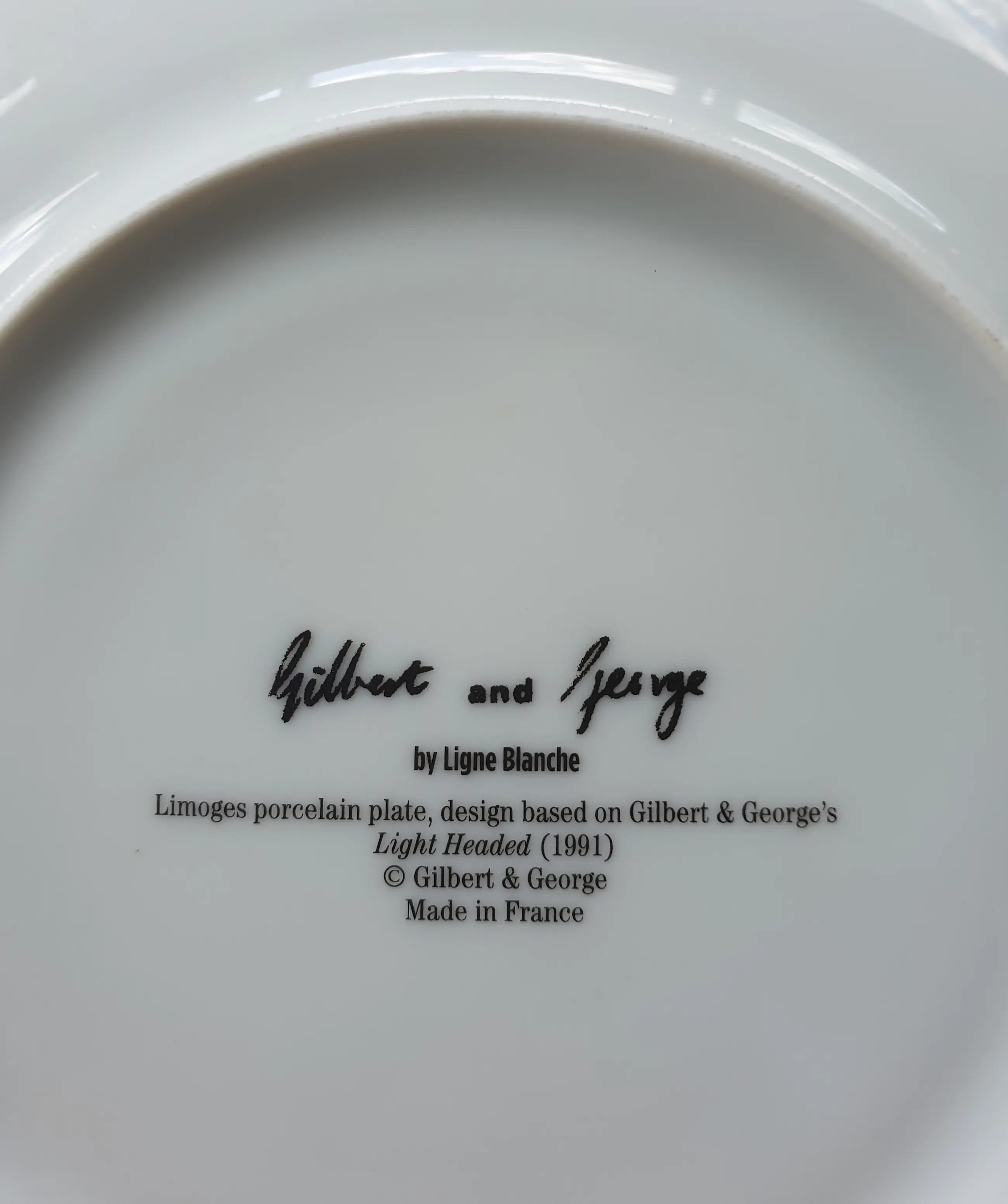 Porseleinen Limoges bord van Gilbert en George uit 1991. Het bord is uitgegeven door Ligne Blanche en is plaatgesigneerd op de achterzijde. Titel "Light Headed". Het bord wordt in een bijpassende doos aangetekend verstuurd.