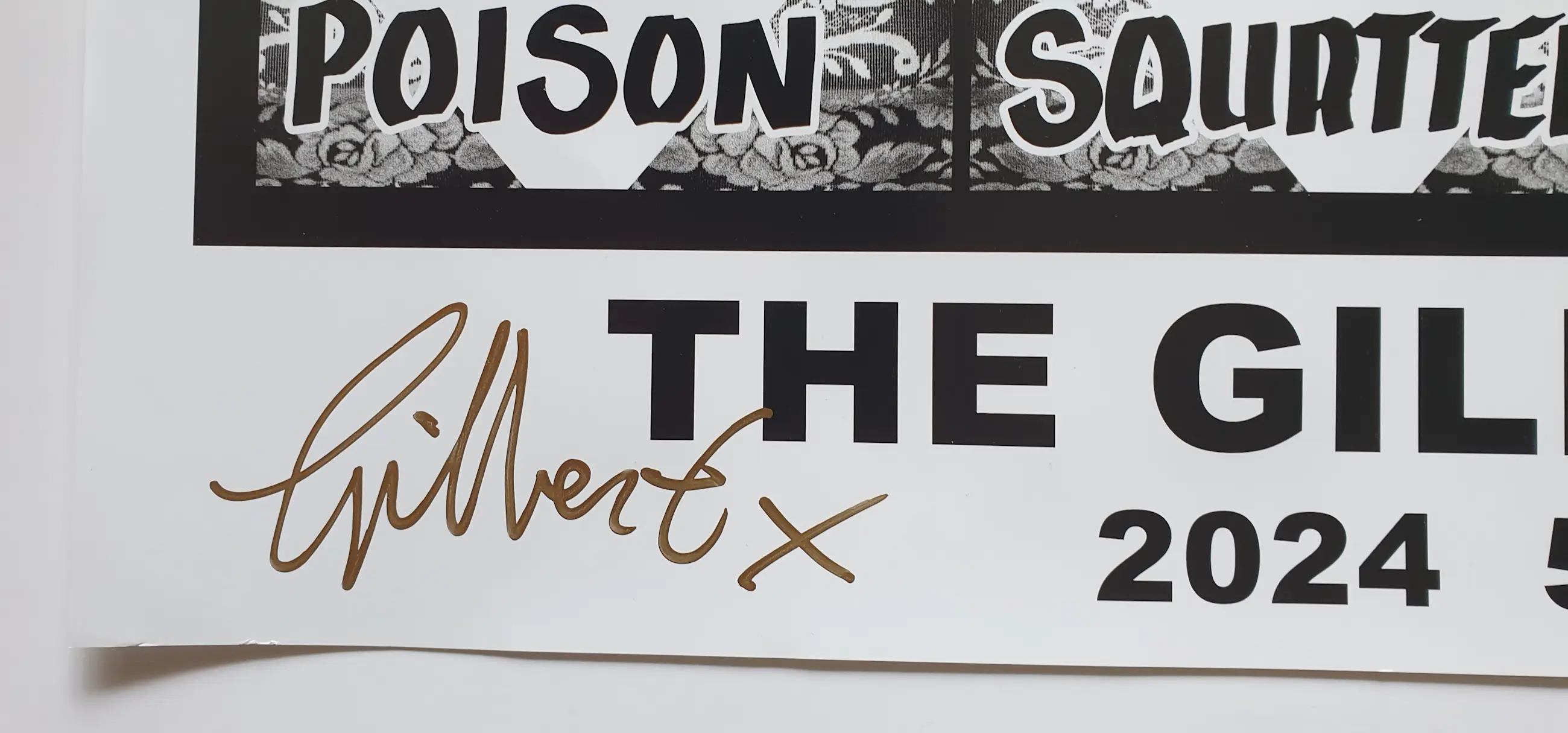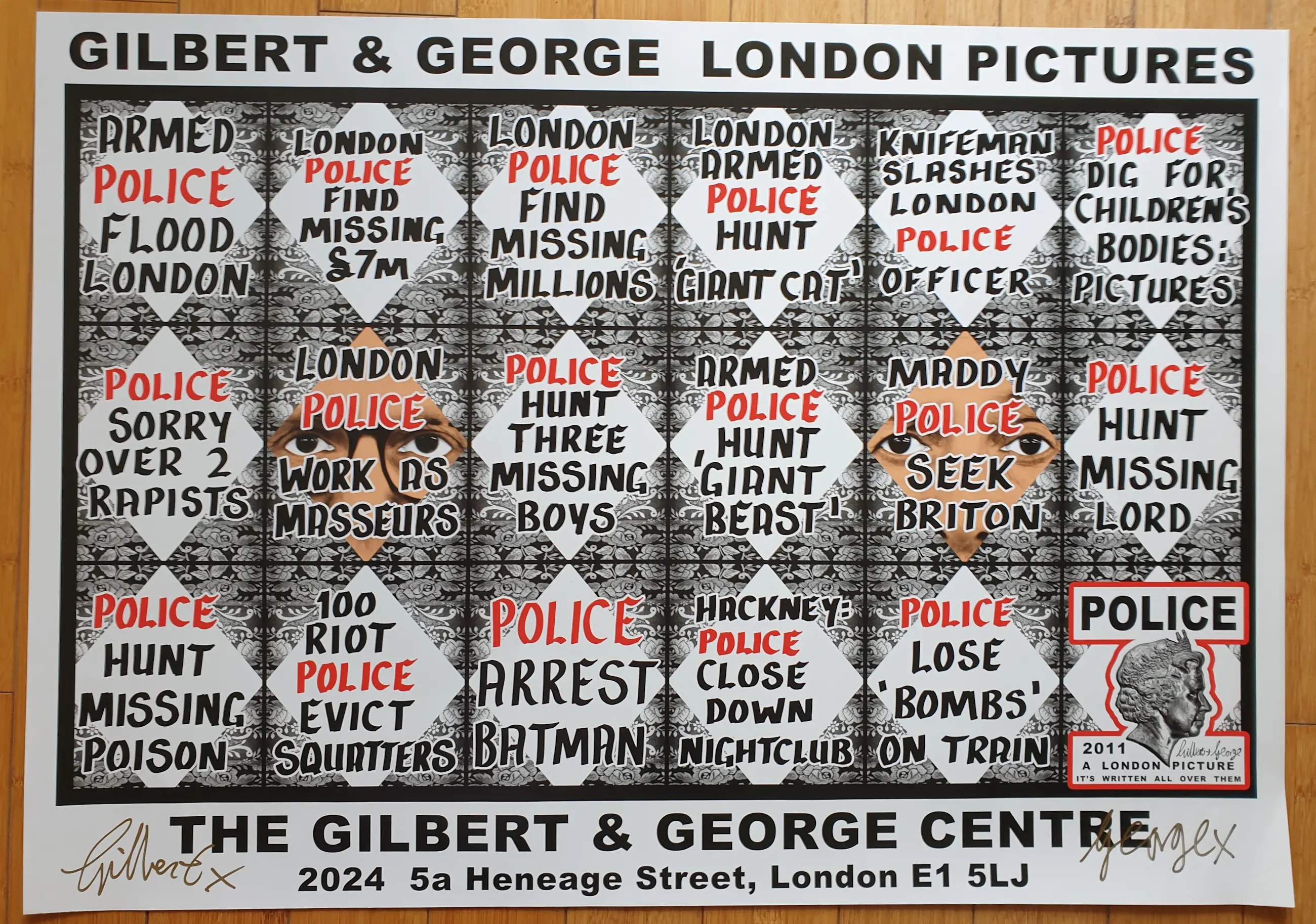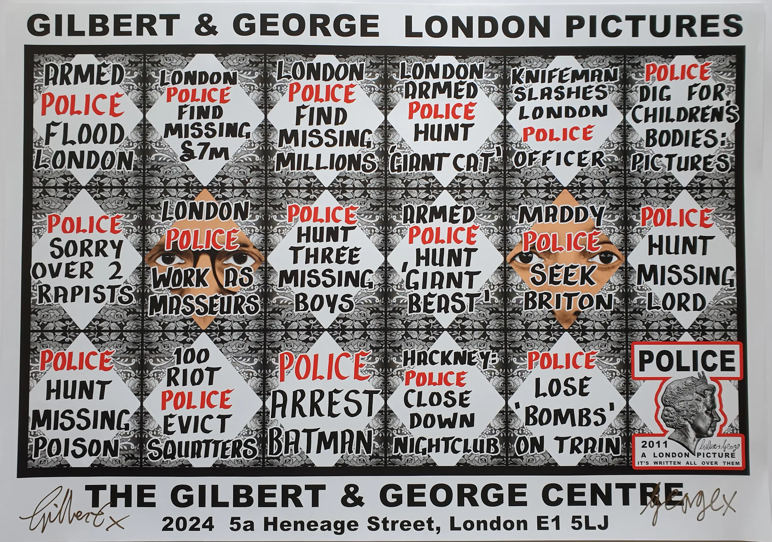 Met een gouden stift gesigneerde offset print van Gilbert (1943) & George (1942) uit 2011. Het werk is genaamd "London Pictures". Het is een aankondigingsposter van een serie over The London (Police) serie. Formaat is 60 x 84 cm. Wordt verstuurd in een koker.
