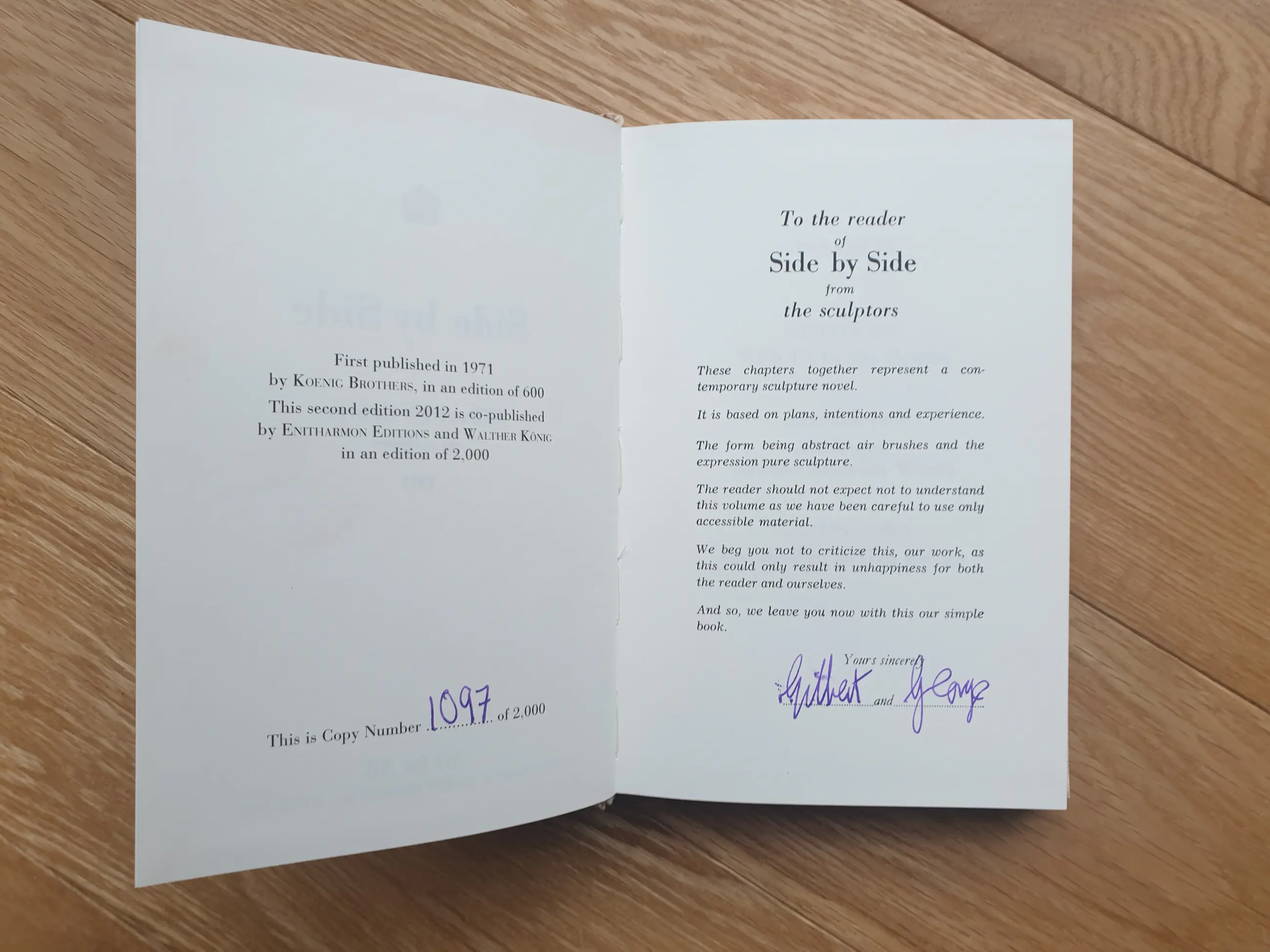 Boekje met als titel "Side by Side" uit 2012 van Gibert & George. De eerste editie van dit kunstitem dateert uit 1971 en verscheen in een editie van 600. Dit exemplaar komt uit 2012 en verscheen in een editie van 2000. Dit is nummer 1097. De kaft is gemarmerd door Gilbert & George. Het boekje bevat foto’s en kunstwerken die de 2 mannen als 1 kunstenaar verbeelden. Een contemporary sculpture novel. Het bestaat uit 3 hoofdstukken: 1. With us in the nature, 2. A glimpse into the abstract world, 3. The reality in our living. Collectors item. Gesigneerd en genummerd.