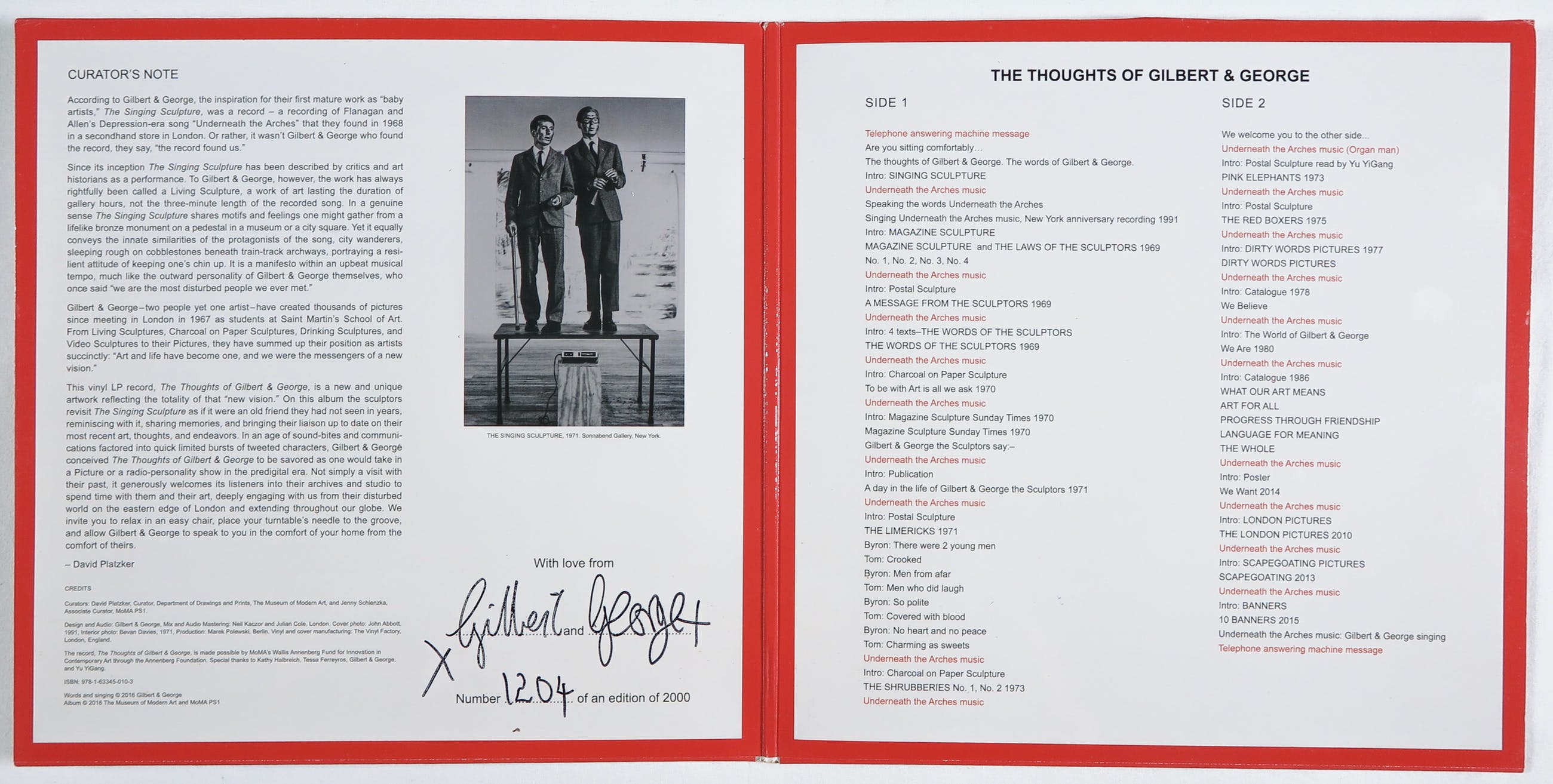 The Museum of Modern Art and MoMA are releasing the second album on MoMA/MoMA Records, The Thoughts of Gilbert & George, in a limited, signed and numbered edition of 2,000 copies. This vinyl record, a new artwork by the artists Gilbert & George, revisits one of their signature works, The Singing Sculpture. Issued in conjunction with the recent exhibition of their work at MoMA, Gilbert & George: The Early Years (May 9–September 27, 2015), The Thoughts of Gilbert & George follows the debut release by MoMA/MoMA PS1 Records in September 2014, There Will Never Be Silence, an album that paid homage to John Cage.