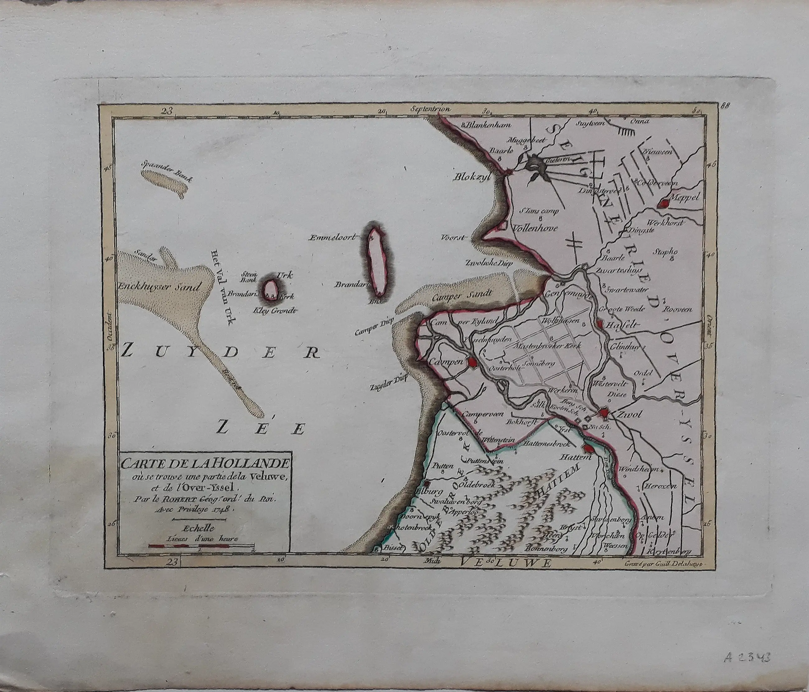 Oudtijds gekleurde kopergravure van noordoostelijke Veluwe en het noordwestelijke deel van Overijssel. Gegraveerd door Guill. Delahaye (sign.) voor Gilles Robert de Vaugondy. Atlas Portatif, Universel et Militaire, (...). A Paris : Chez l'auteur ; Durand [etc.], 1748.