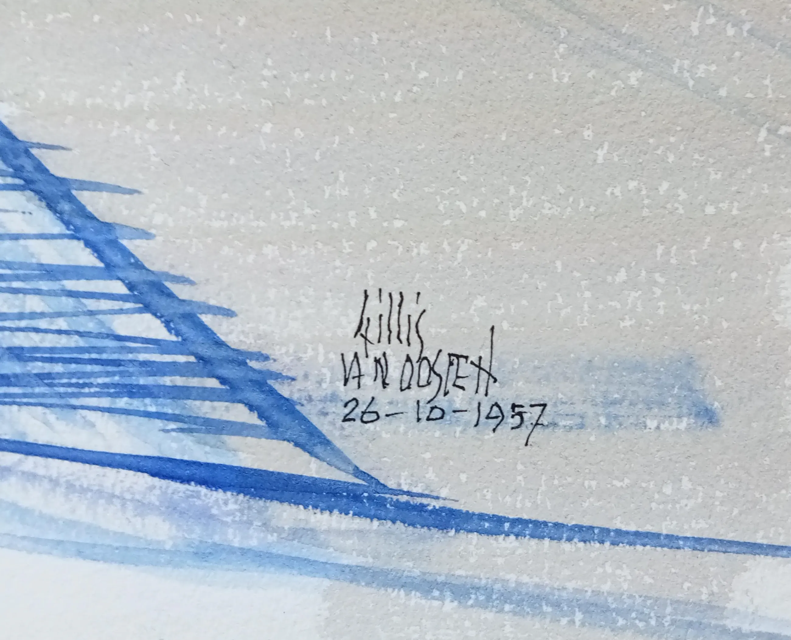 Zeer fraai aquarel op papier met als voorstelling een abstracte compositie met masten en boten,