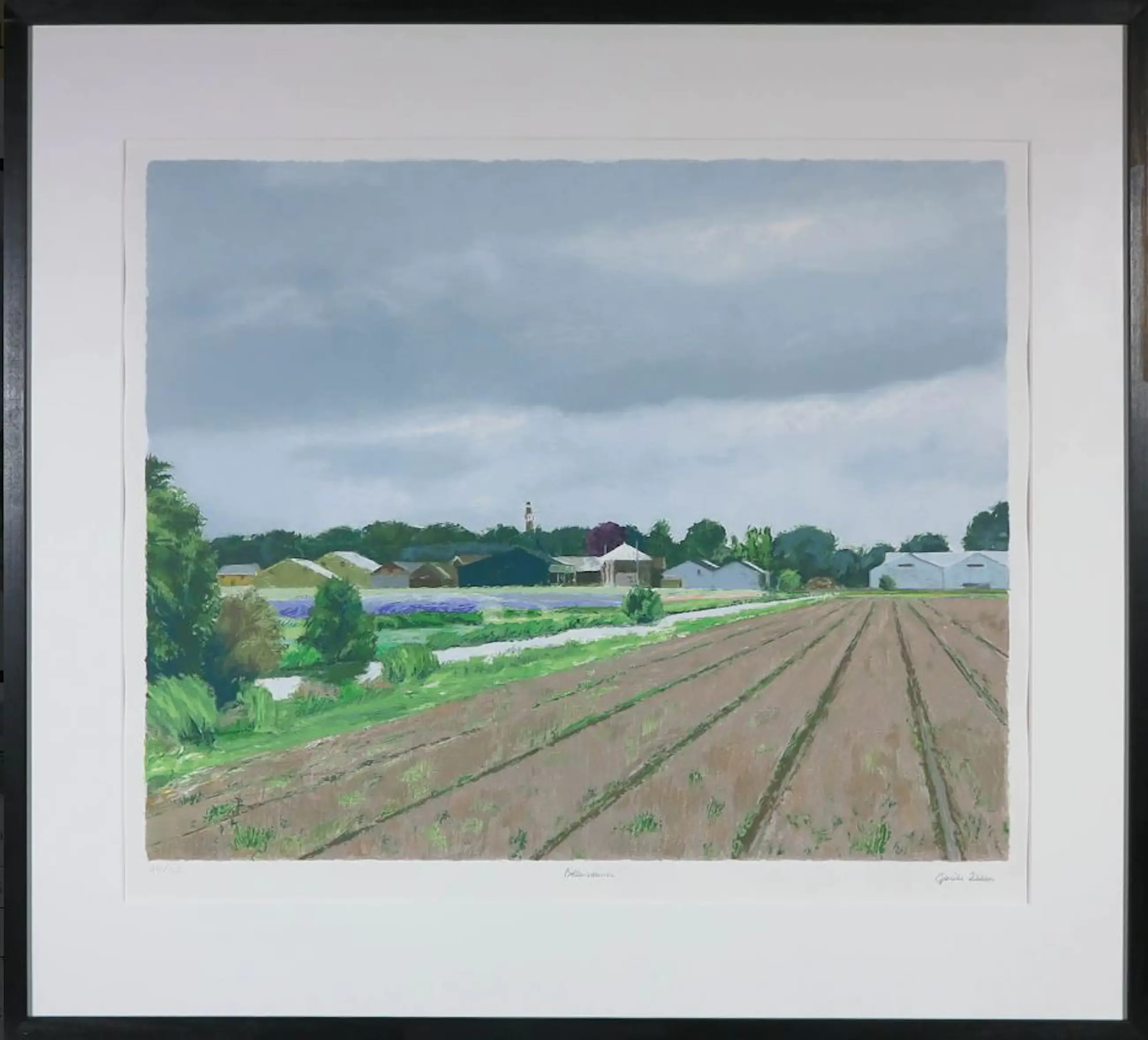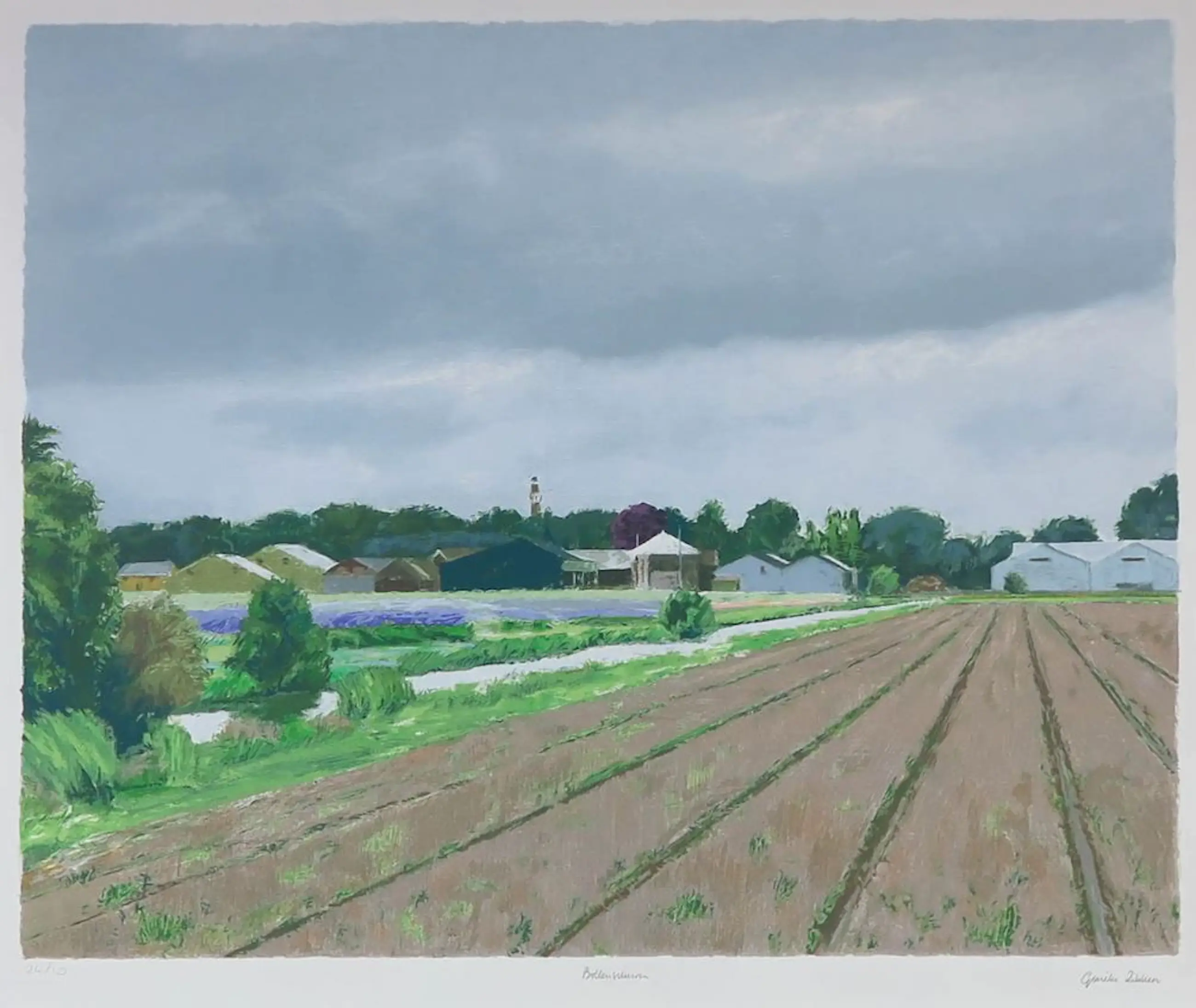 Nederlands landschap op zeefdruk van Gineke Zikken.