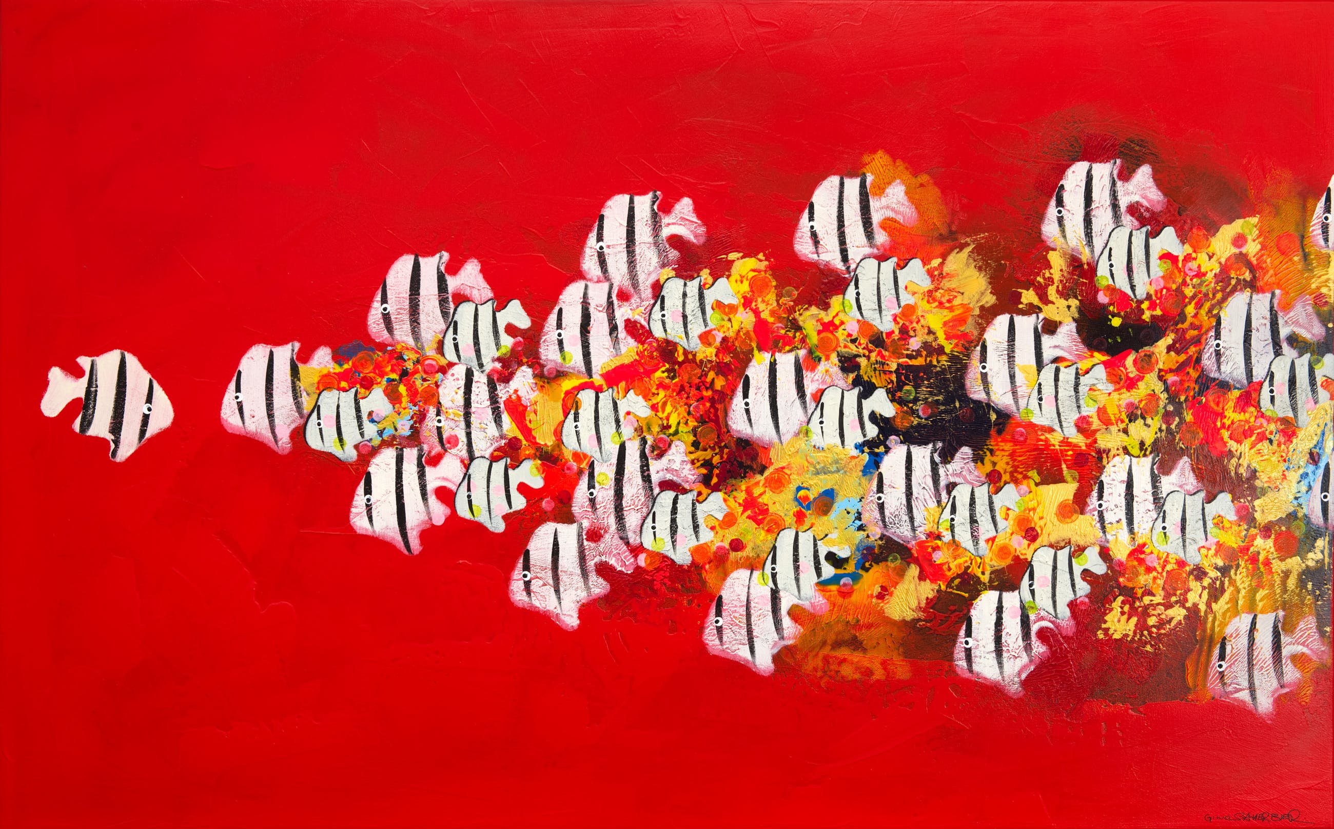 kleurrijk acryl (kwast- en mestechniek) levendig schilderij met bijzondere sfeer in uitbeelding, kleuren en magie. Een andere blik op de natuur, een tegengesteld beeld van de werkelijke maatschappij.