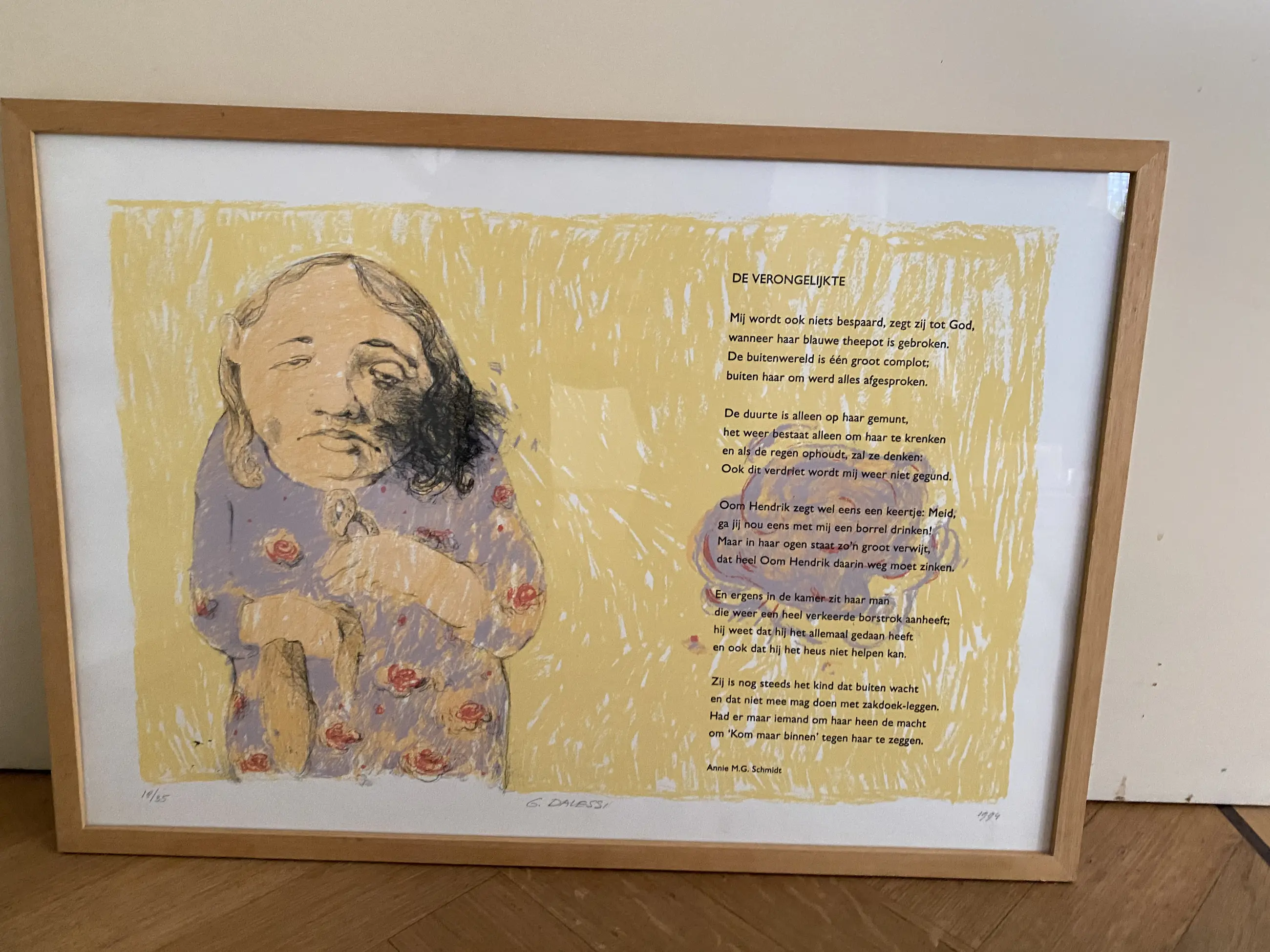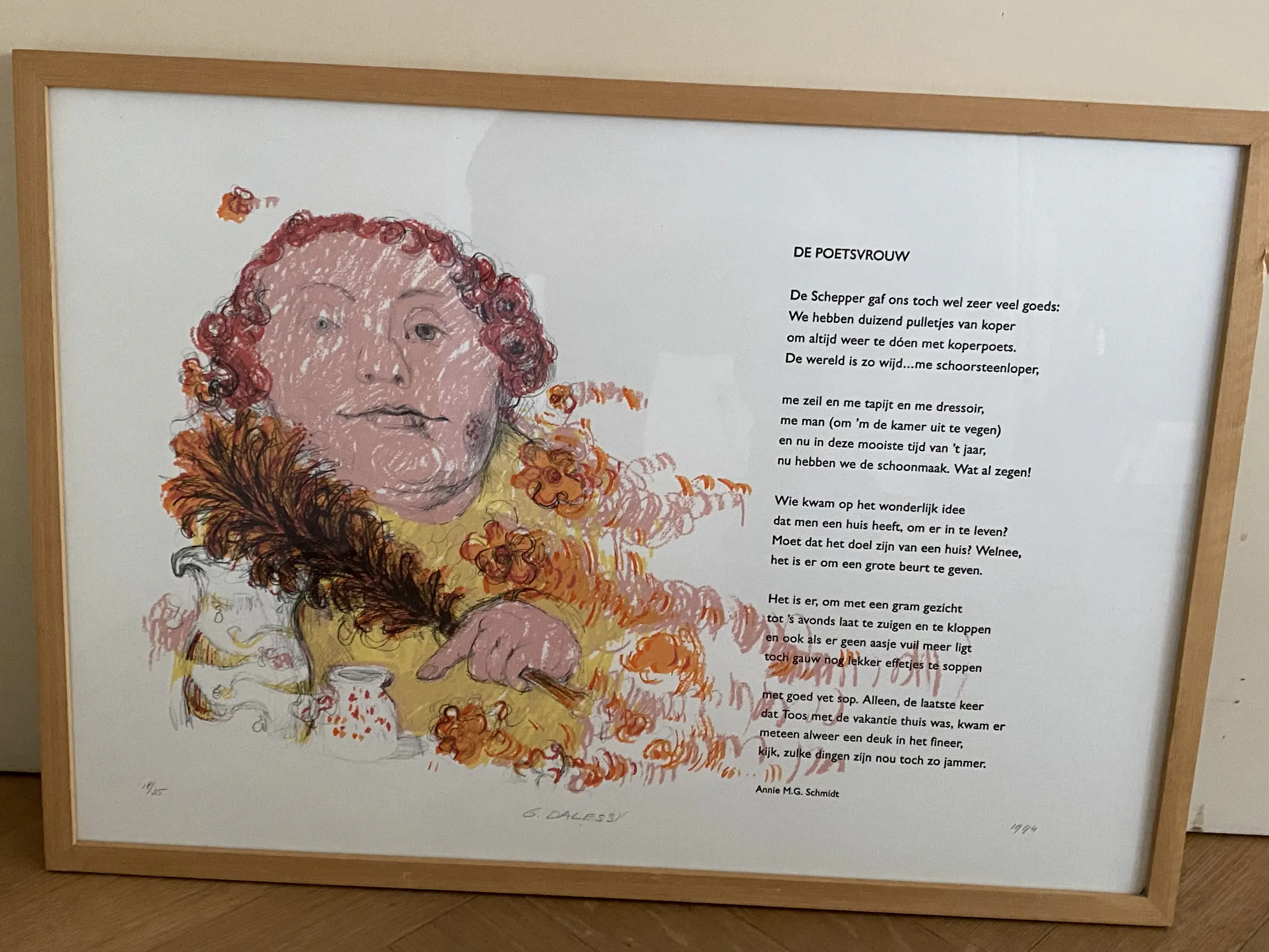 Drie zeefdrukken bij drie gedichten van Annie M.G.Schmidt. De oplage was 35, dit is nummer 18. Vijf bladen in geel linnen map. Typografie verzorgd door Tjeu Teeuwen. Uitgave van Plint Eindhoven.