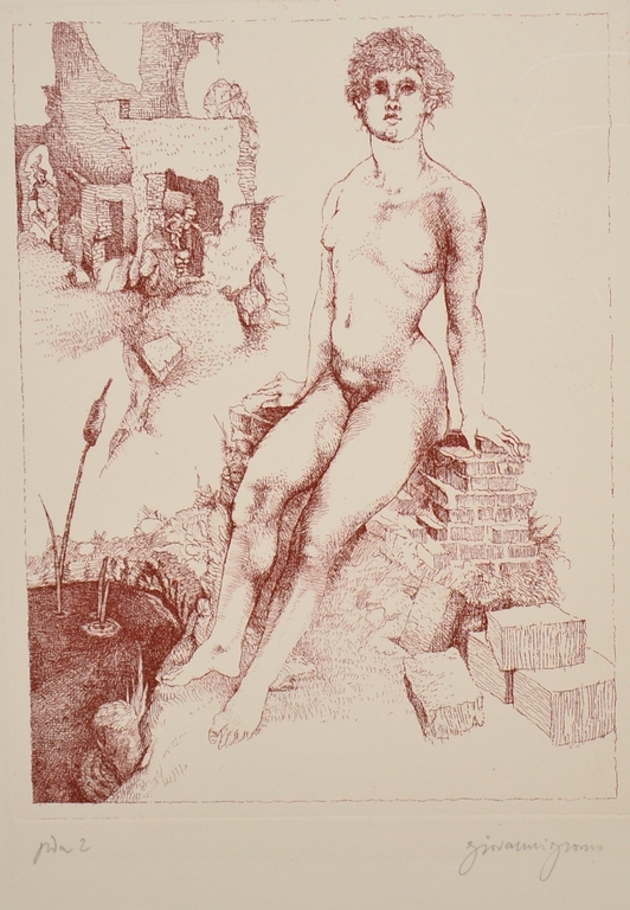 Mooie grote ets van Giovanni Gromo in rode inkt.