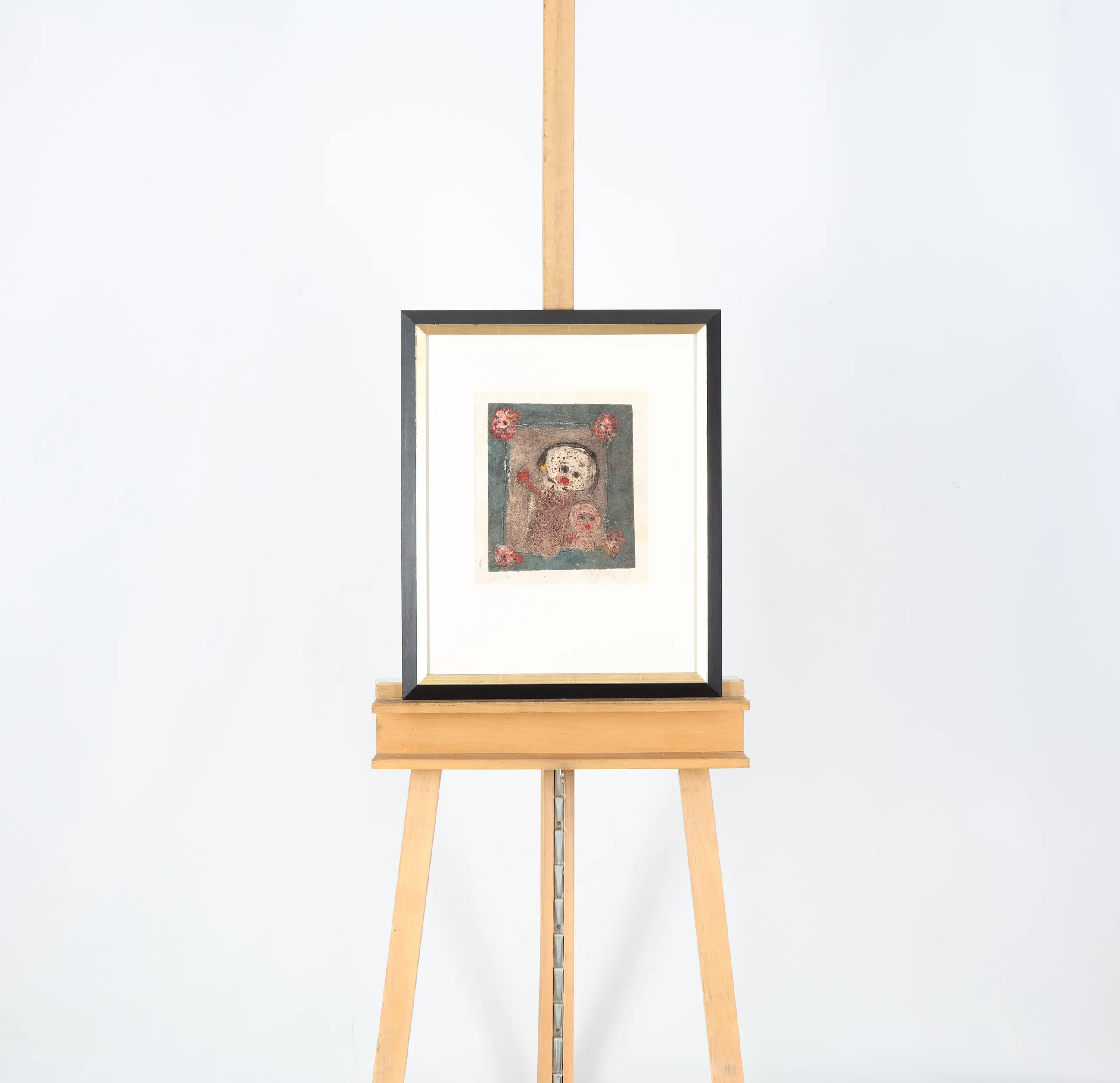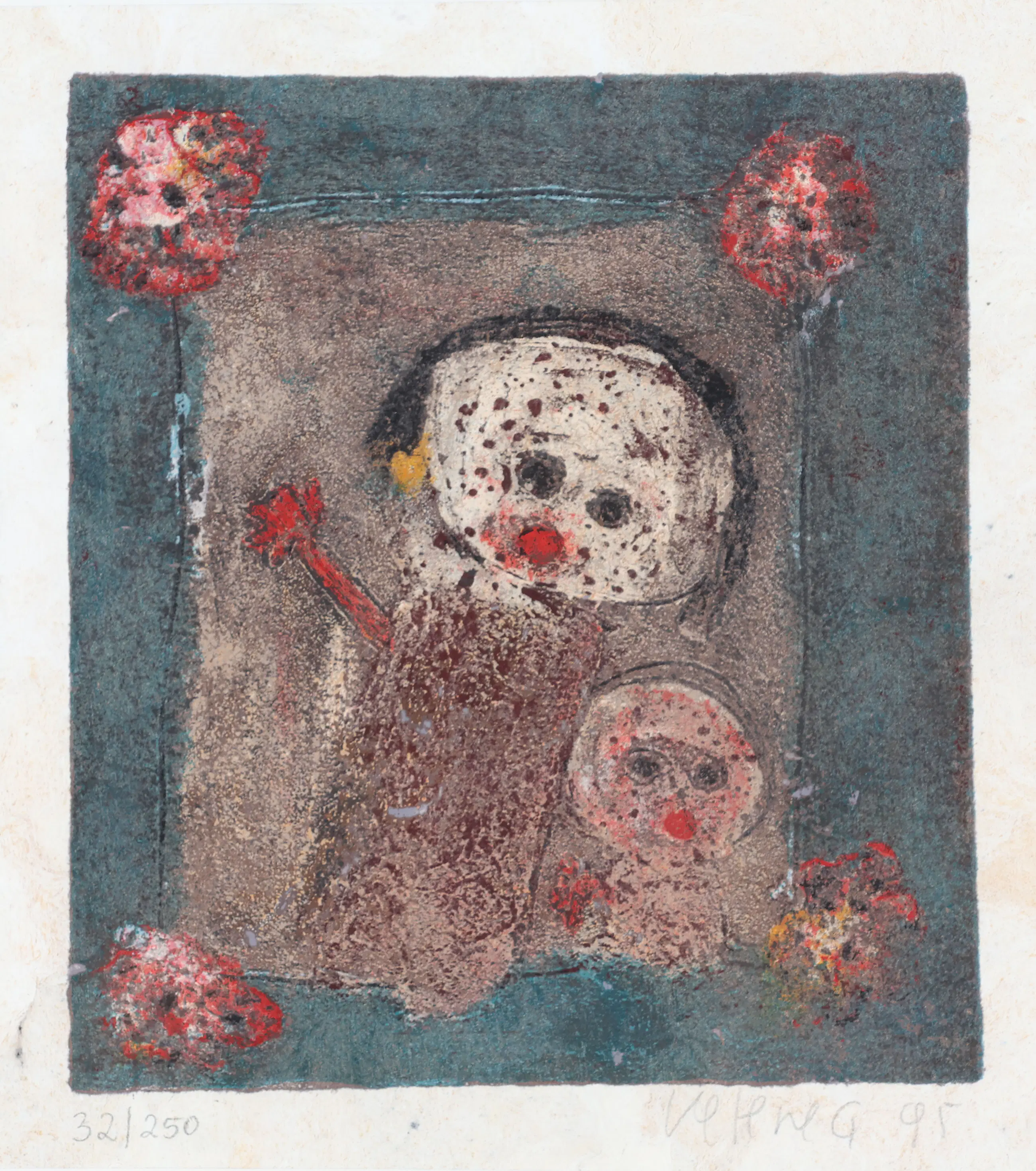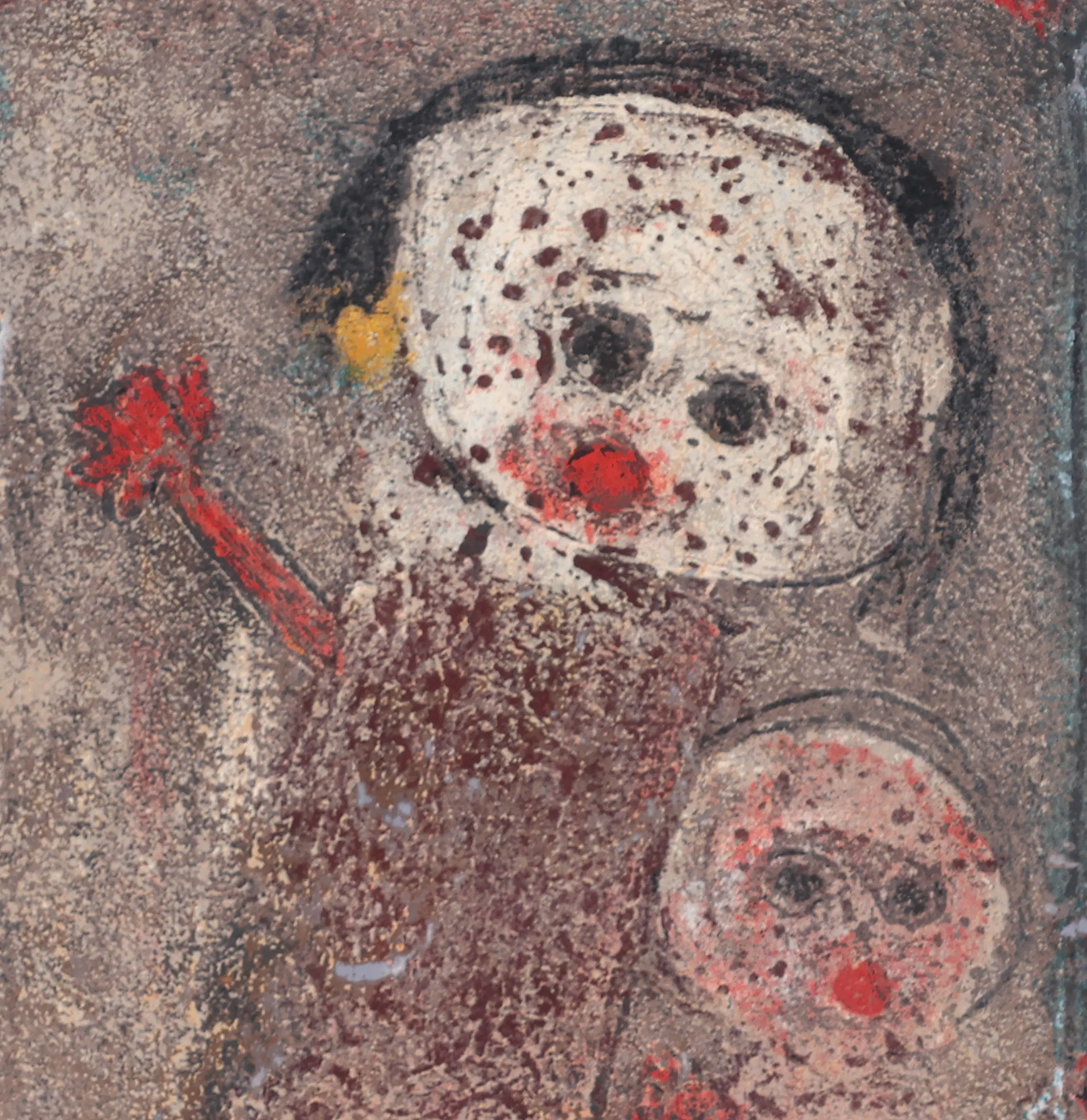 Een typisch werk van Giovanni Vetere (1940). De kunstenaar beeldt hier een figuren af die menselijk ogen, maar toch iets ongrijpbaars hebben– met een veelzeggende blik die de toeschouwer direct aanspreekt.