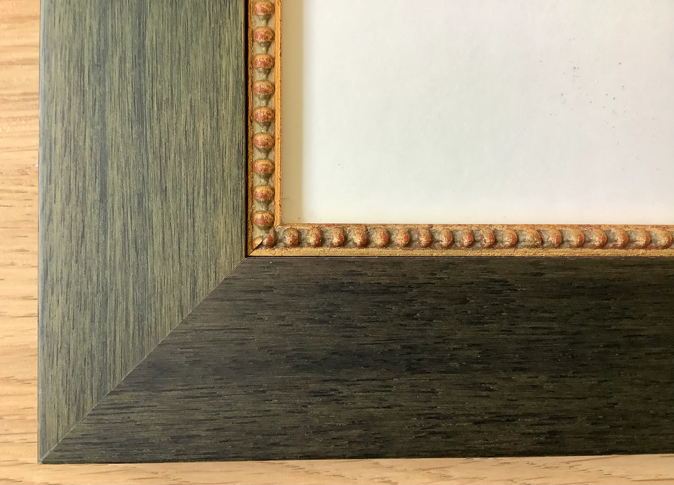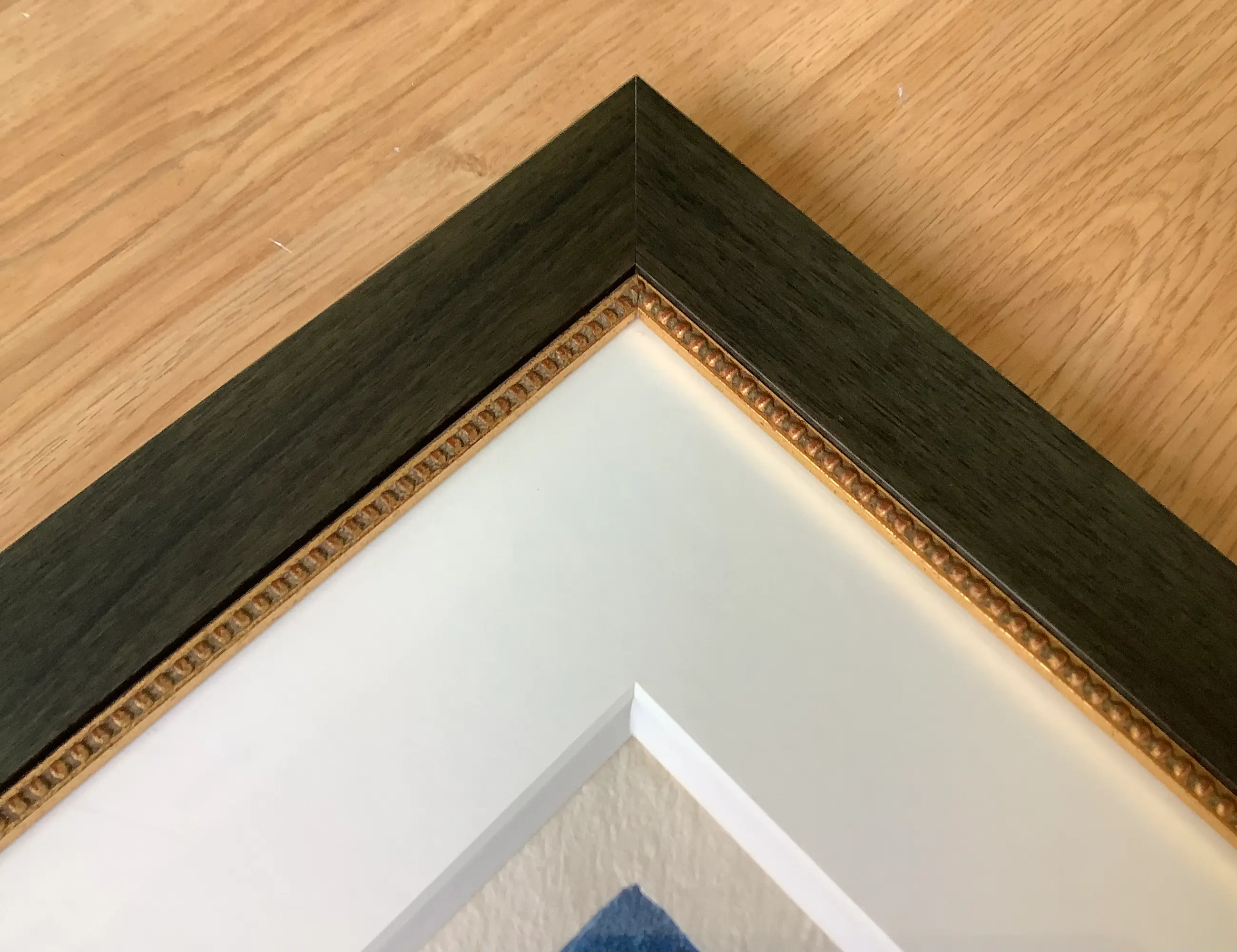 Ingelijst in een robuuste houten lijst, donkerbruin met gouden bies achter een verdiept passe partout. Lijst is 5 cm breed en 2,5 cm hoog.