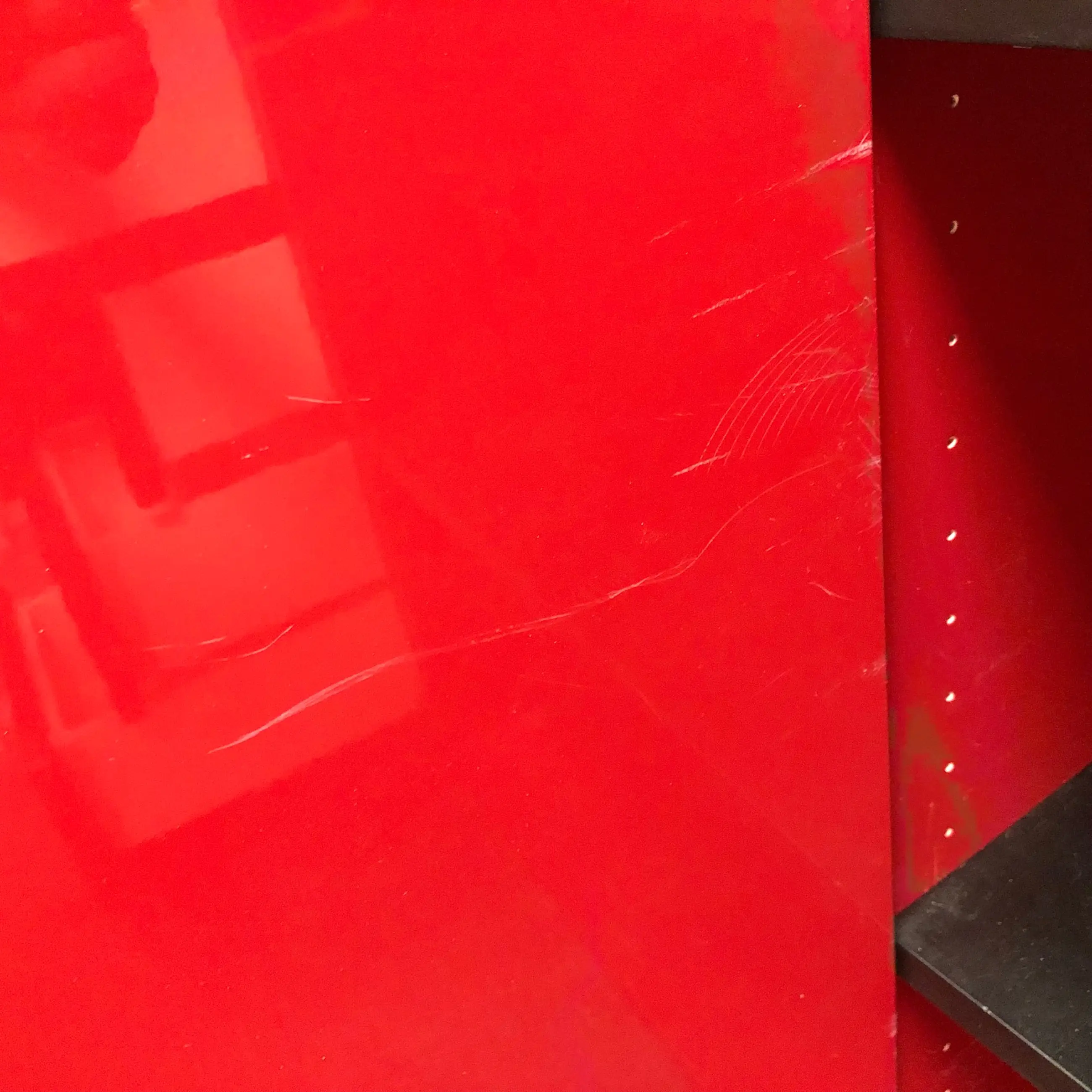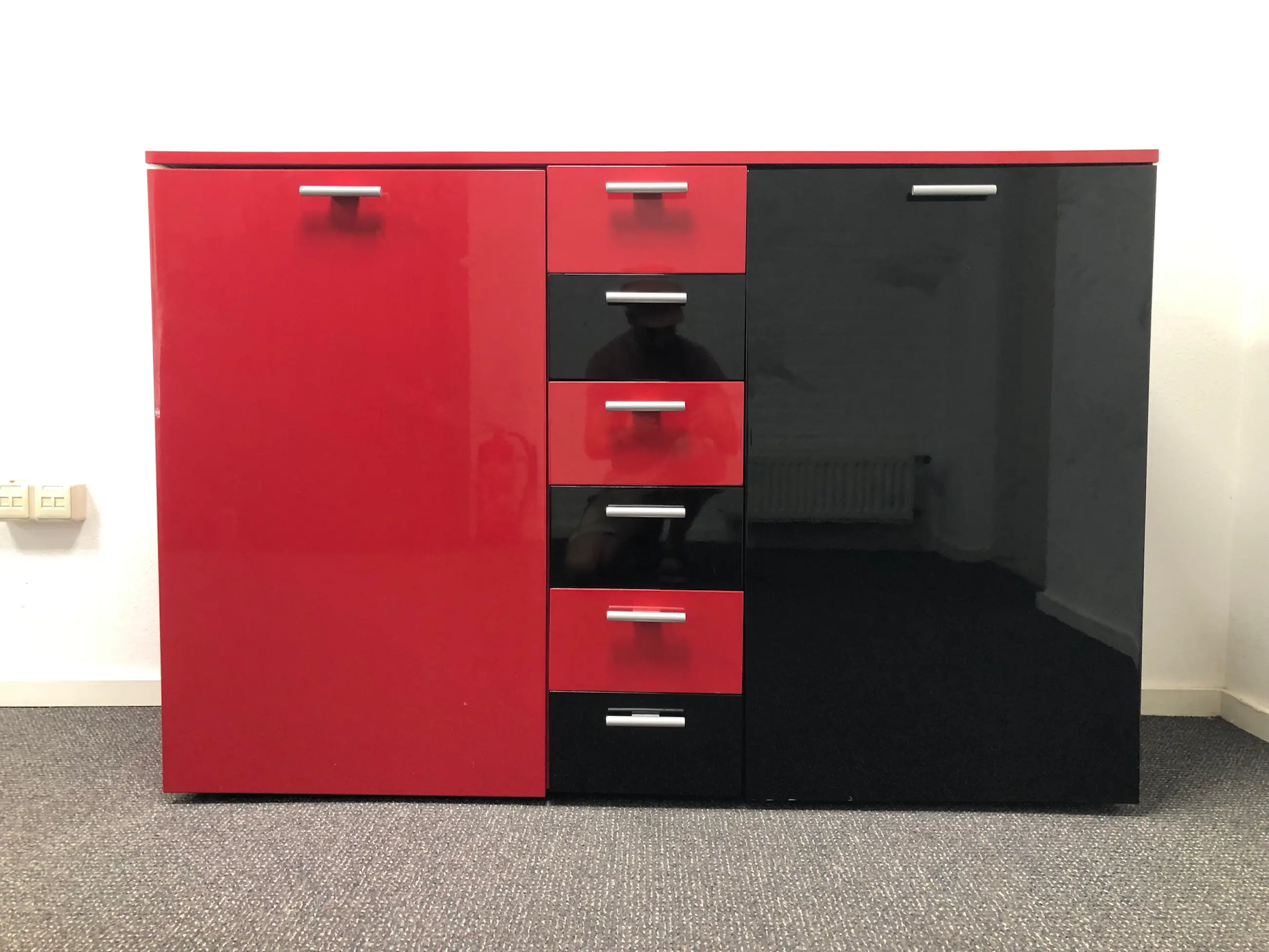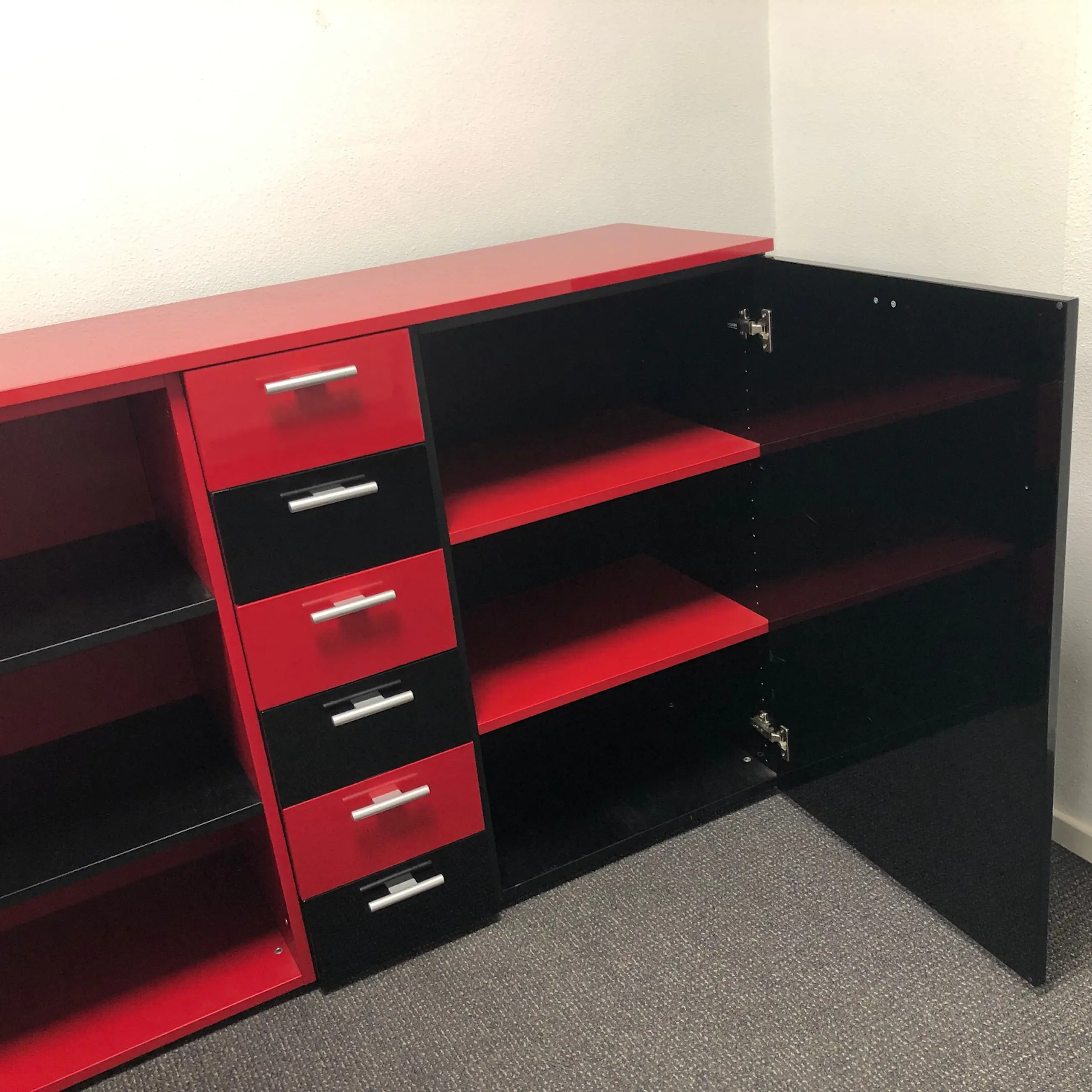 Fraaie design kast van het Italiaanse merk Cappellini uit de jaren '80 in de uitvoering genaamd 'Sistemi'. De kubistisch vormgegeven kast is gelakt in twee kleuren hoogglans: rood en zwart. Hij bestaat uit twee grotere gedeelten met 3 compartimenten afgesloten met een deur en met 6 laden in het midden. De kast is gemerkt op de scharnieren.