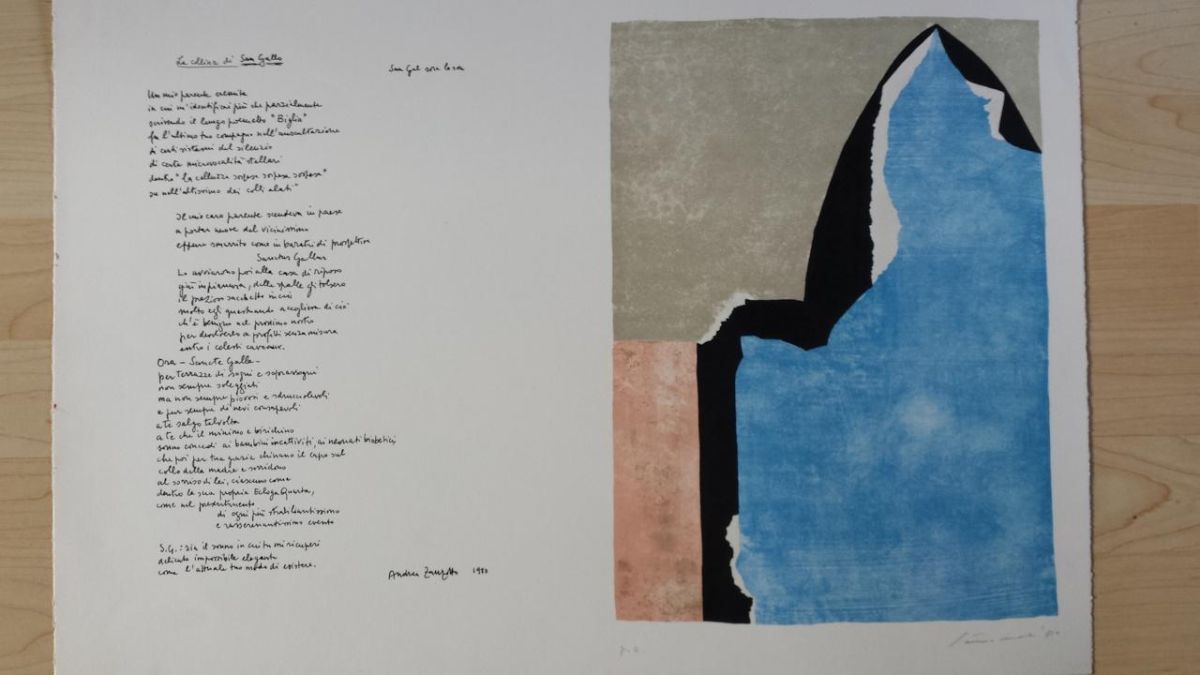 La collina di San Gallo, Farblithographie 1980 mit Text von Andrea Zanzotto, Blatt 56 x 38cm, Auflage 200, e.a., signiert, Erker Presse St. Gallen, Bestzustand, Privatverkauf ohne Gewähr.