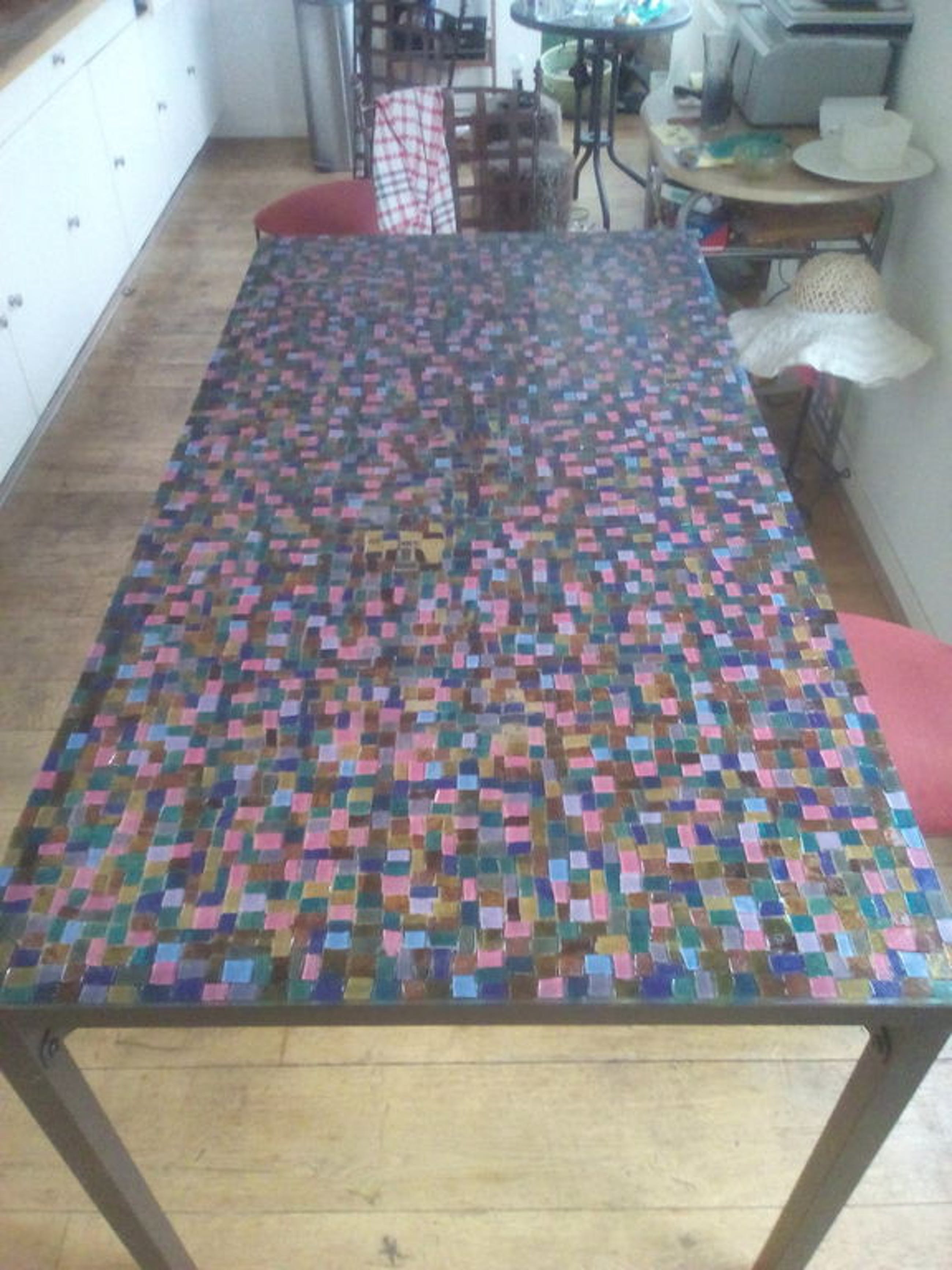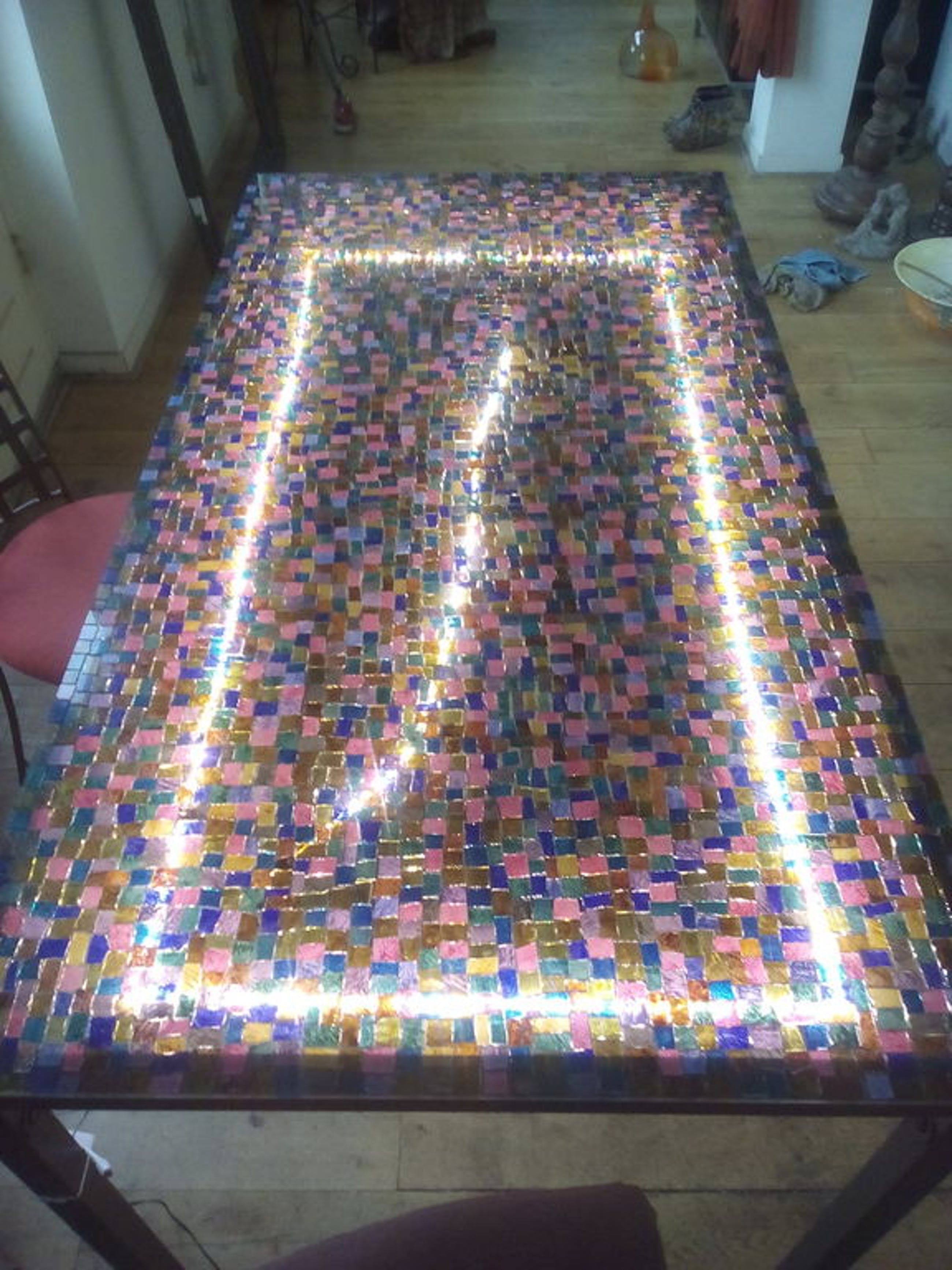 Mooie gemozaikte glastafel, bedekt met ongeveer 4000 stukjes glas. Een authentiek kleurrijk geheel dat tijdloos is en is tevens in meerdere kleurencombinaties mogelijk.