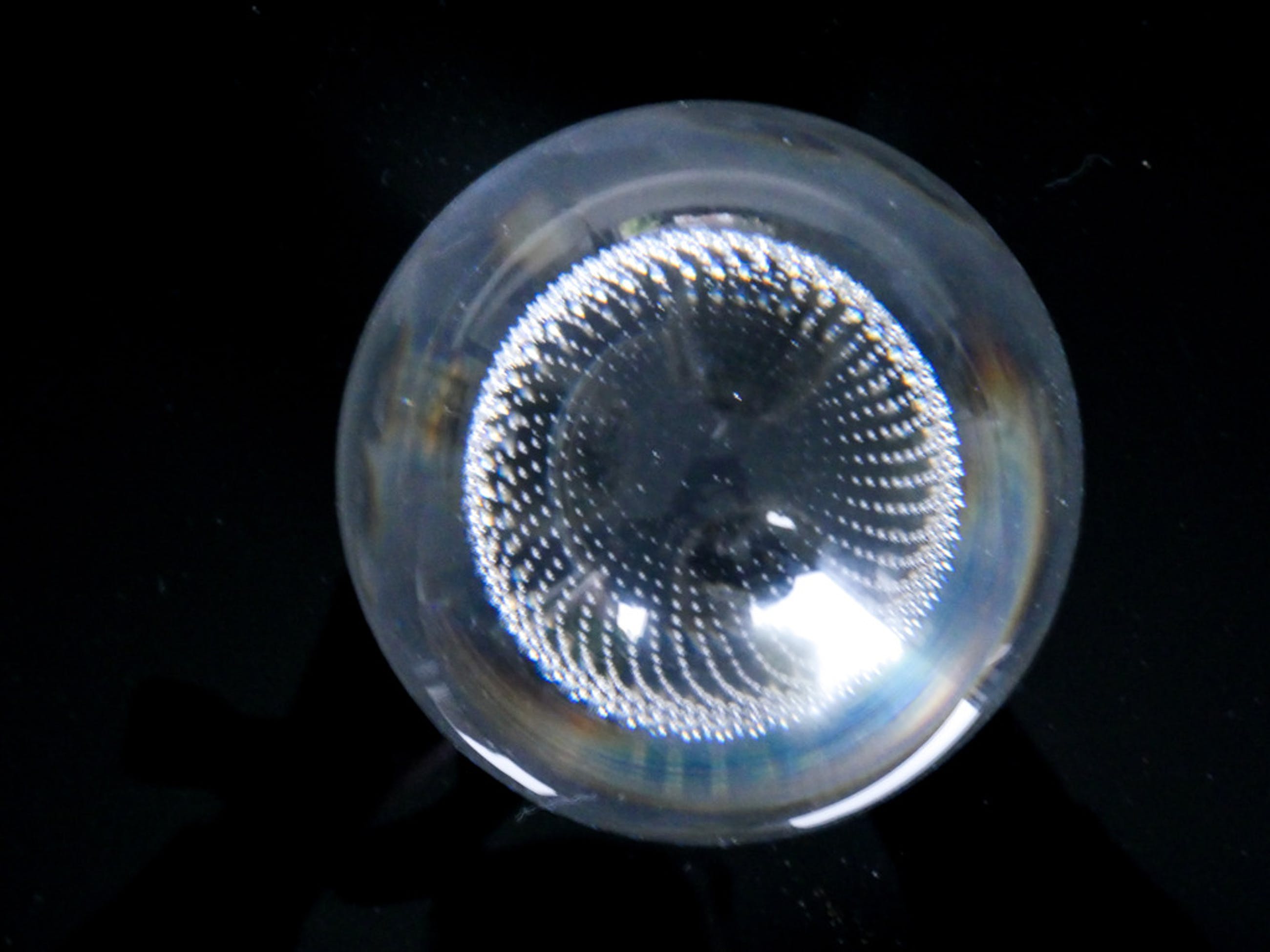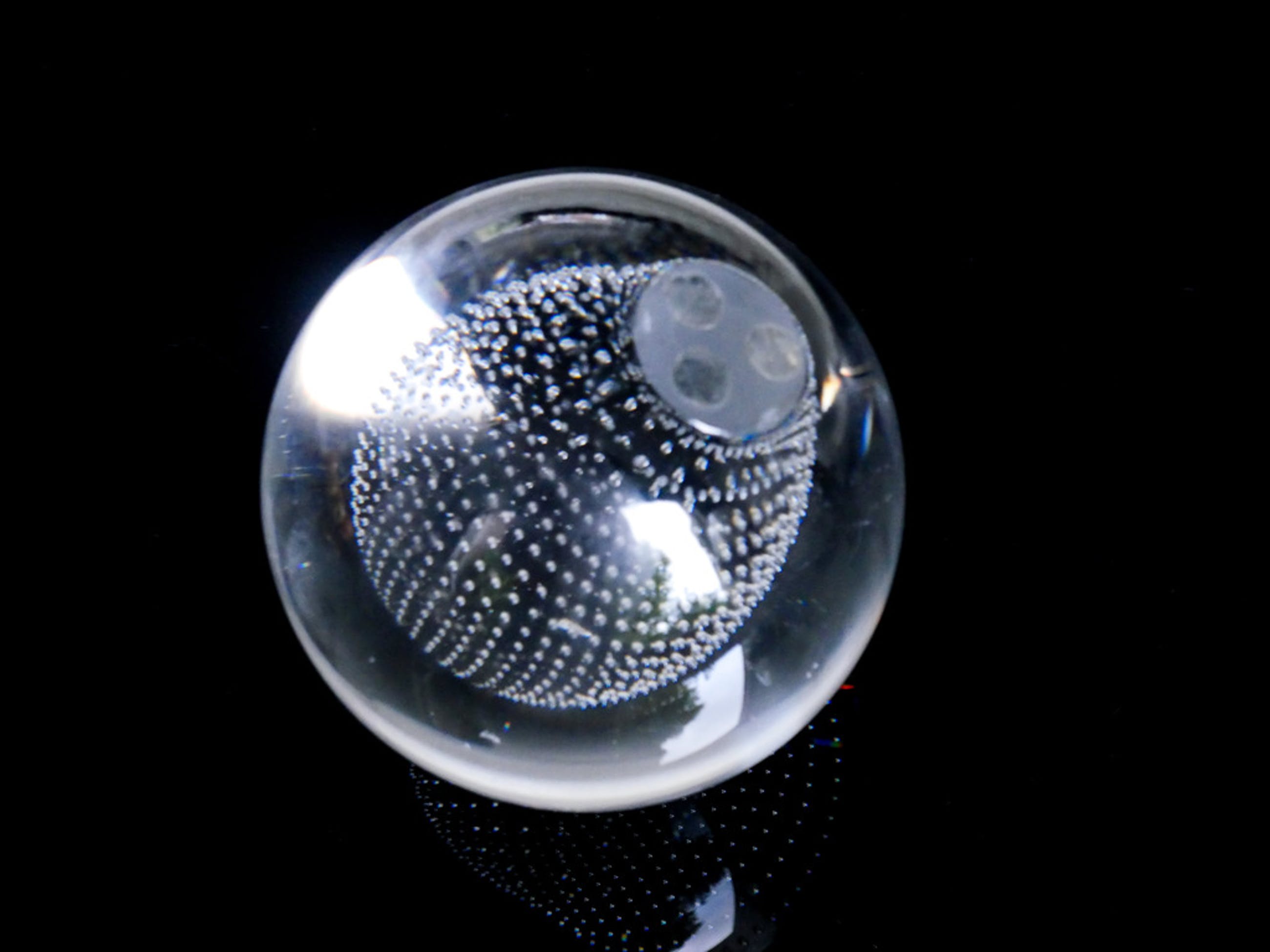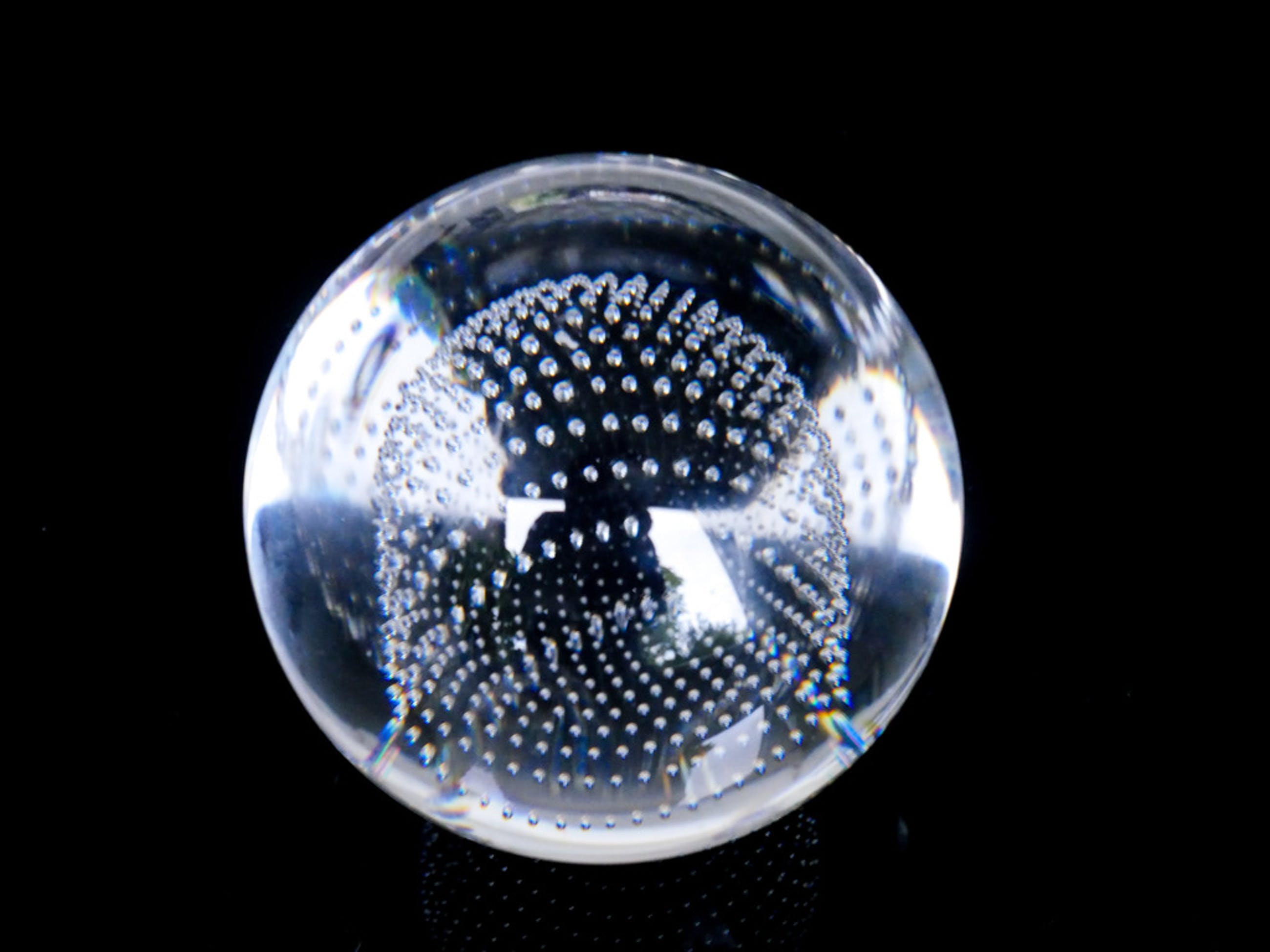 Beschrijving: helder glasbol met in de kern regelmatige luchtbellen