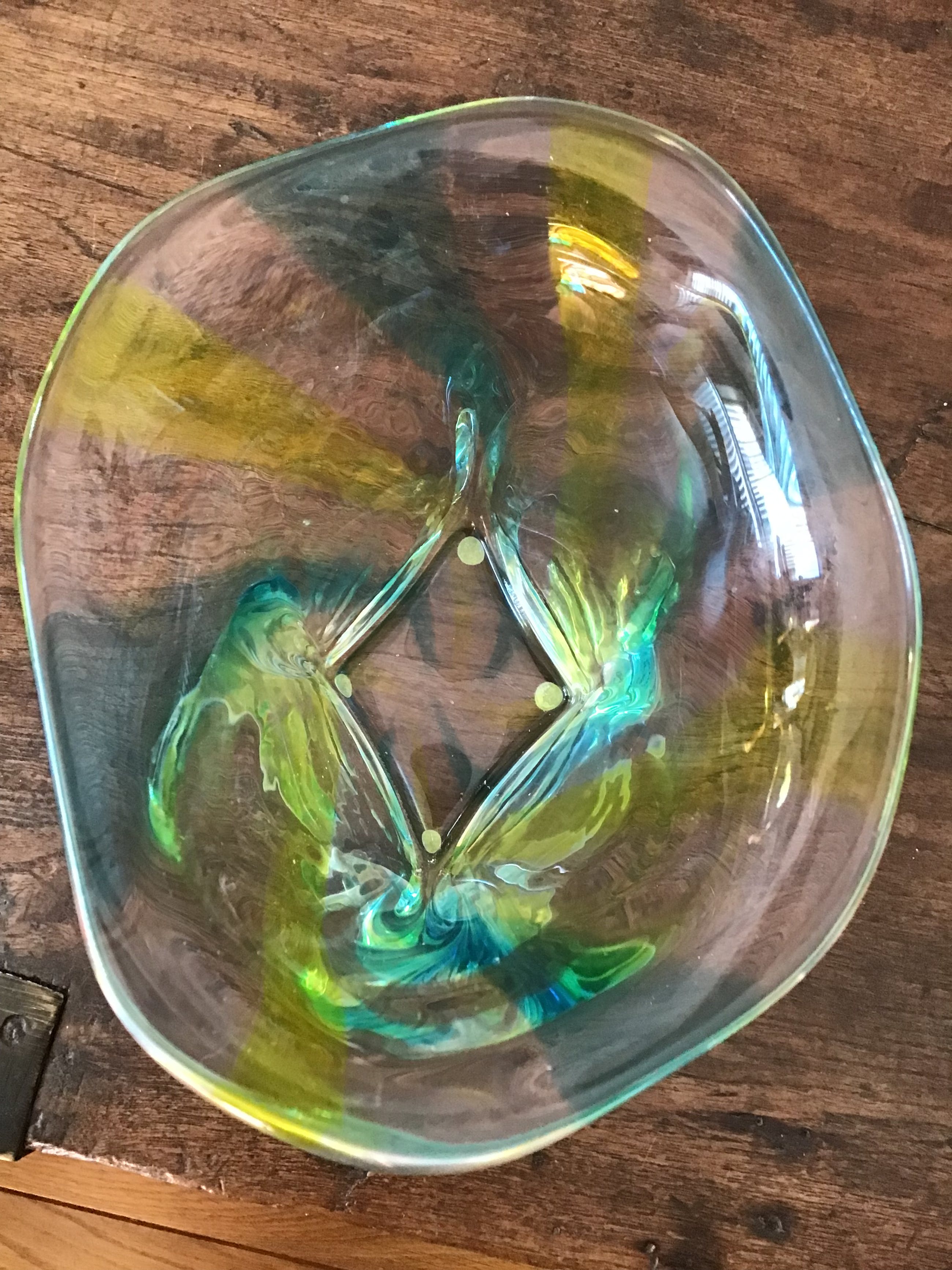Prachtige zware glazen vaas van Peter Kuchinke Hand gesigneerd ‘94 Glasfabriek Gullaskruf Zweden Hoogte ca 15 cm Breedte onderkant 11 x 8 cm Breedte bovenkant 18x 16 cm Conditie uitstekend Wordt aangetekend verzonden De glasfabriek Gullaskruf werd opgericht in 1893 maar ging failliet in 1921,daarna nog verschillende heropend en weer gesloten.In 1990 voor de laatste keer heropend er werd toen hoofdzakelijk sierglas gemaakt o.a door Peter Kuchinke,helaas werd de glasfabriek in 1995 gesloten.