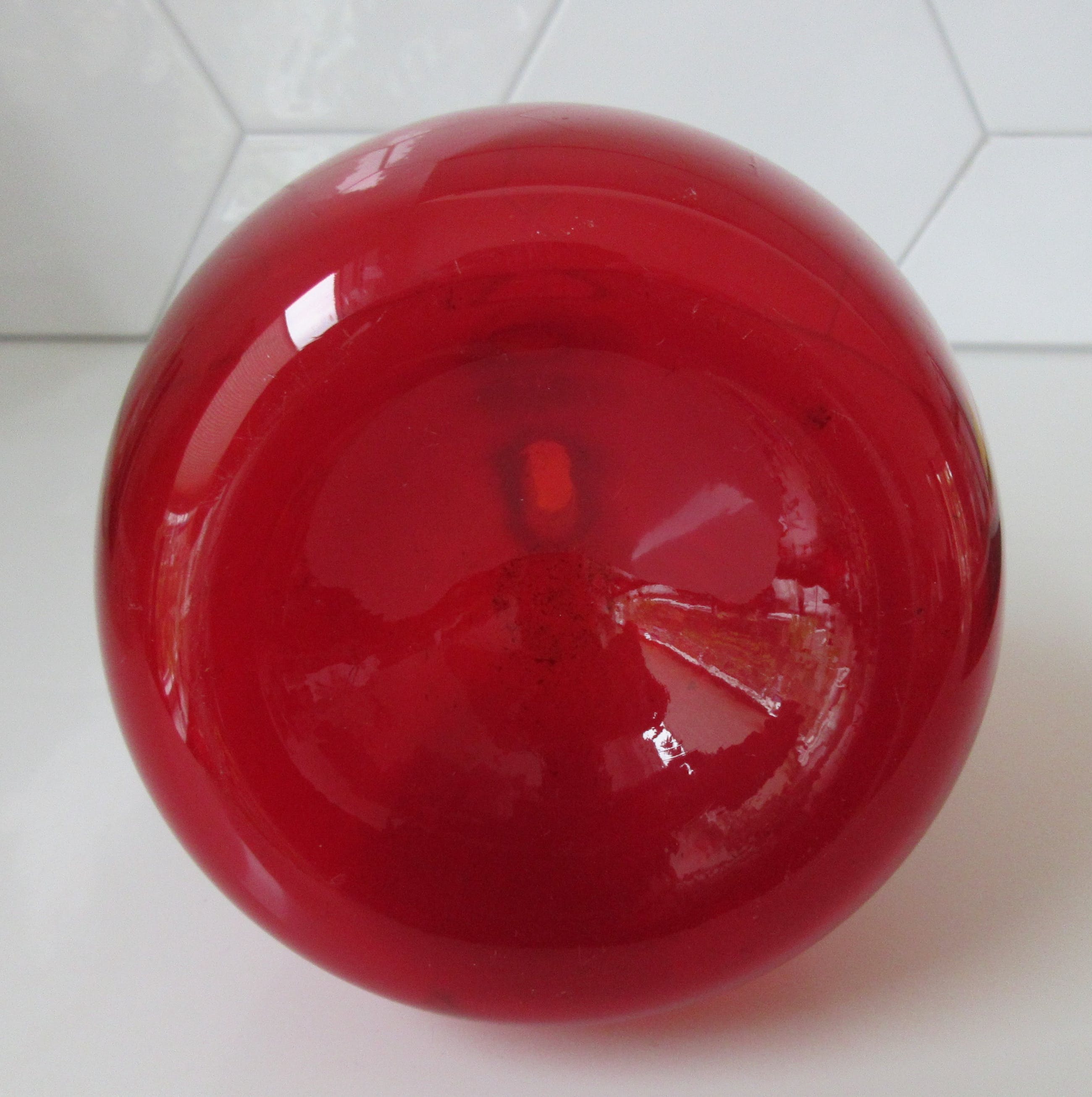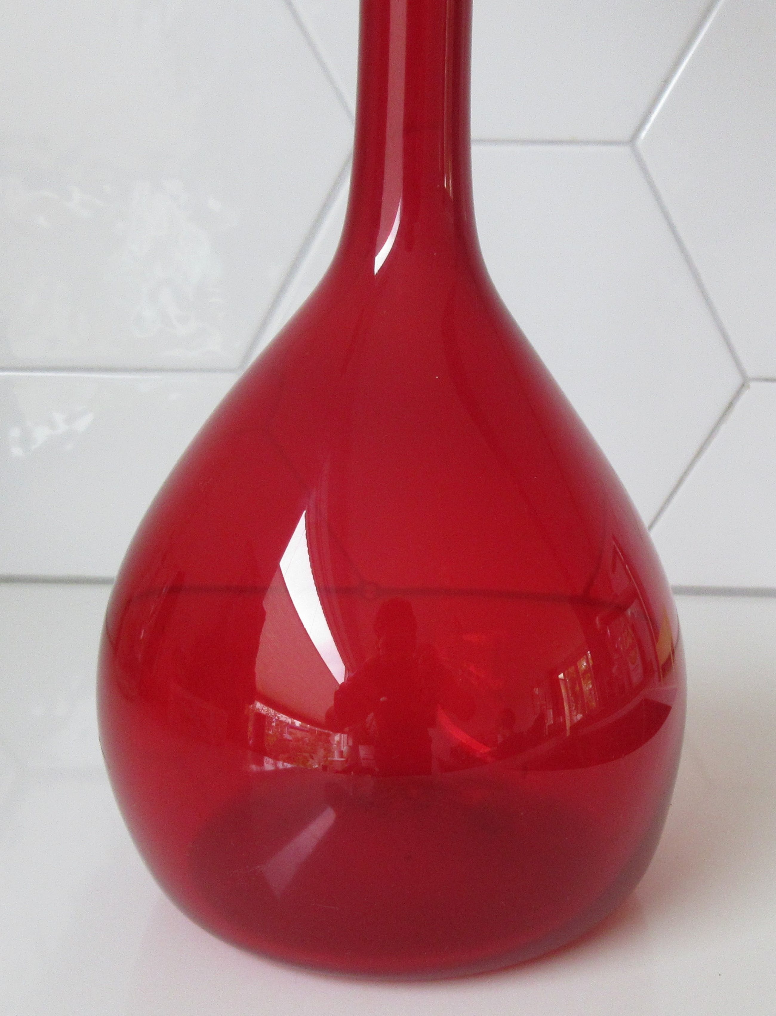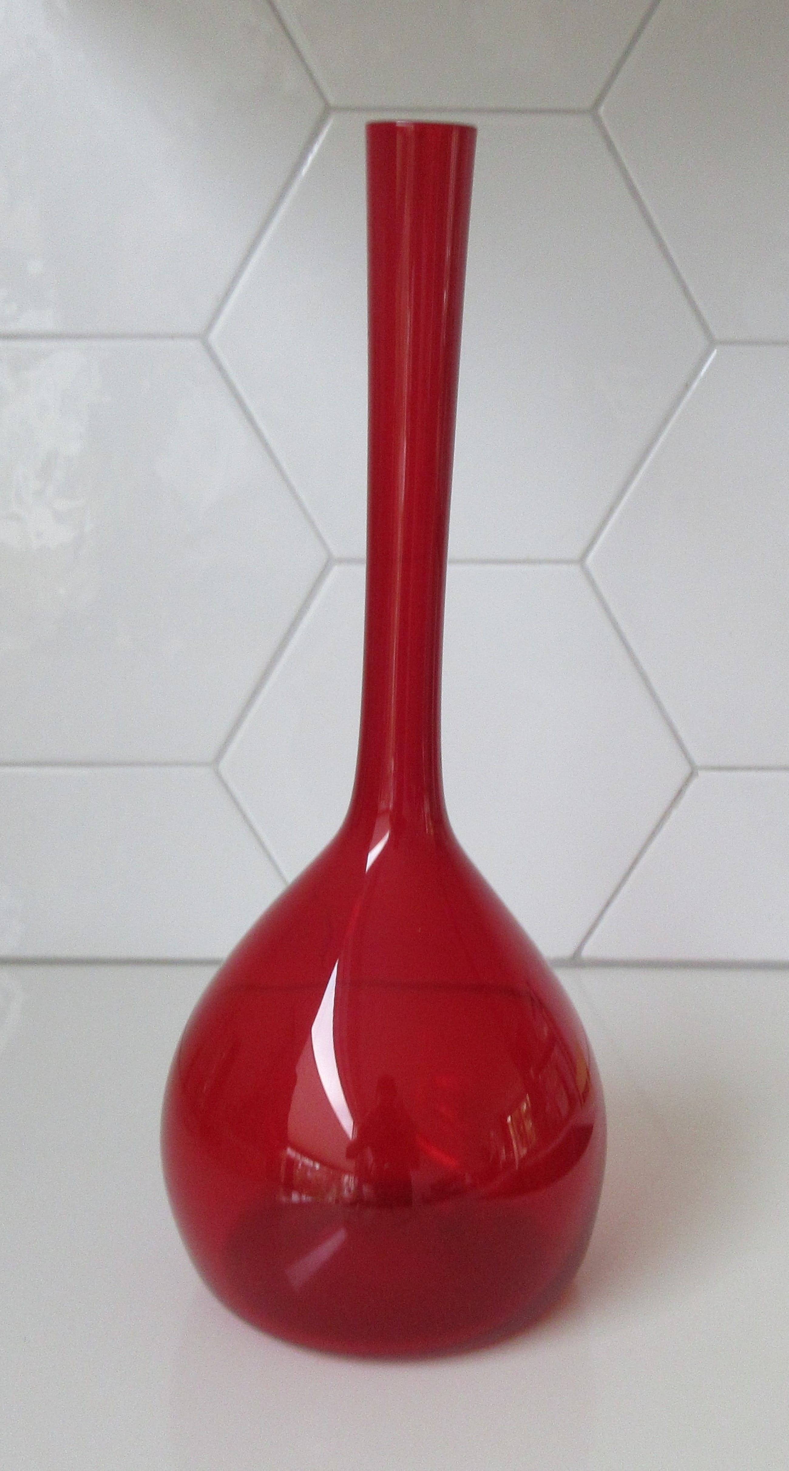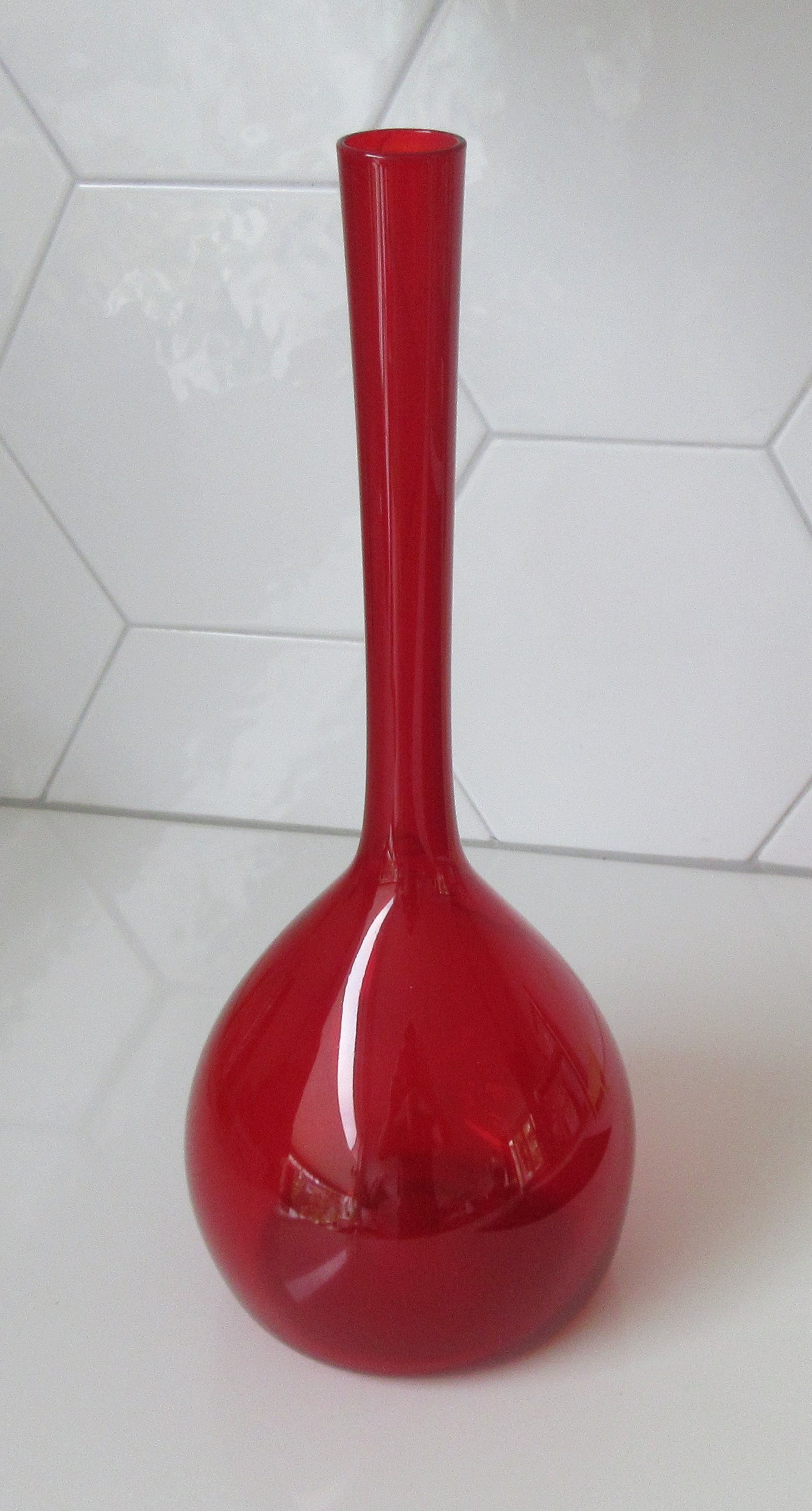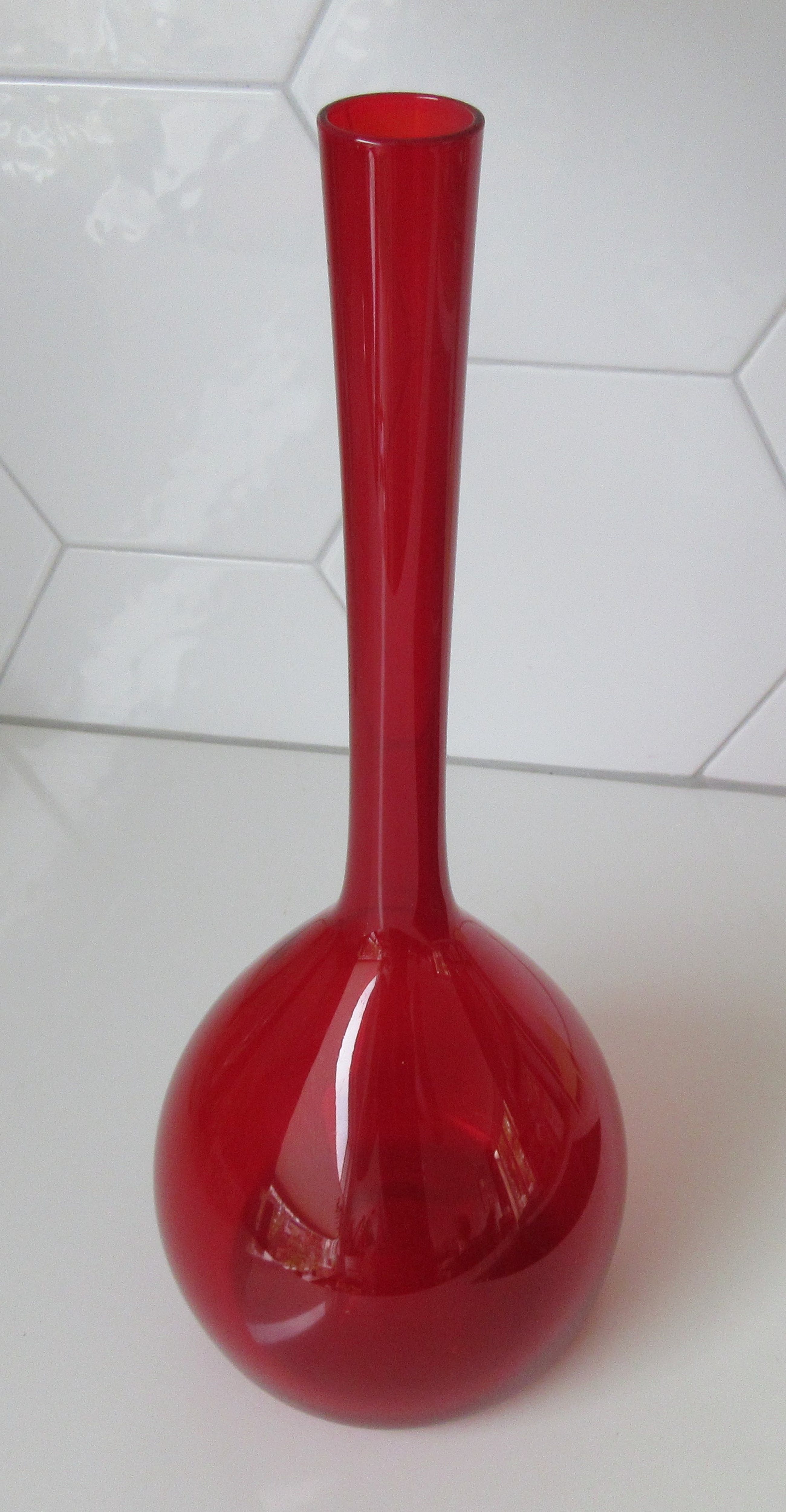 Rode vintage "Bulbvase" - ontwerp Arthur Percy ca. 1960 voor Gullaskruf Glasbruk uit Zweden. in prima gebruikte conditie, geen beschadigingen en wat licht vuil aan de binnenzijde. Niet gemerkt.