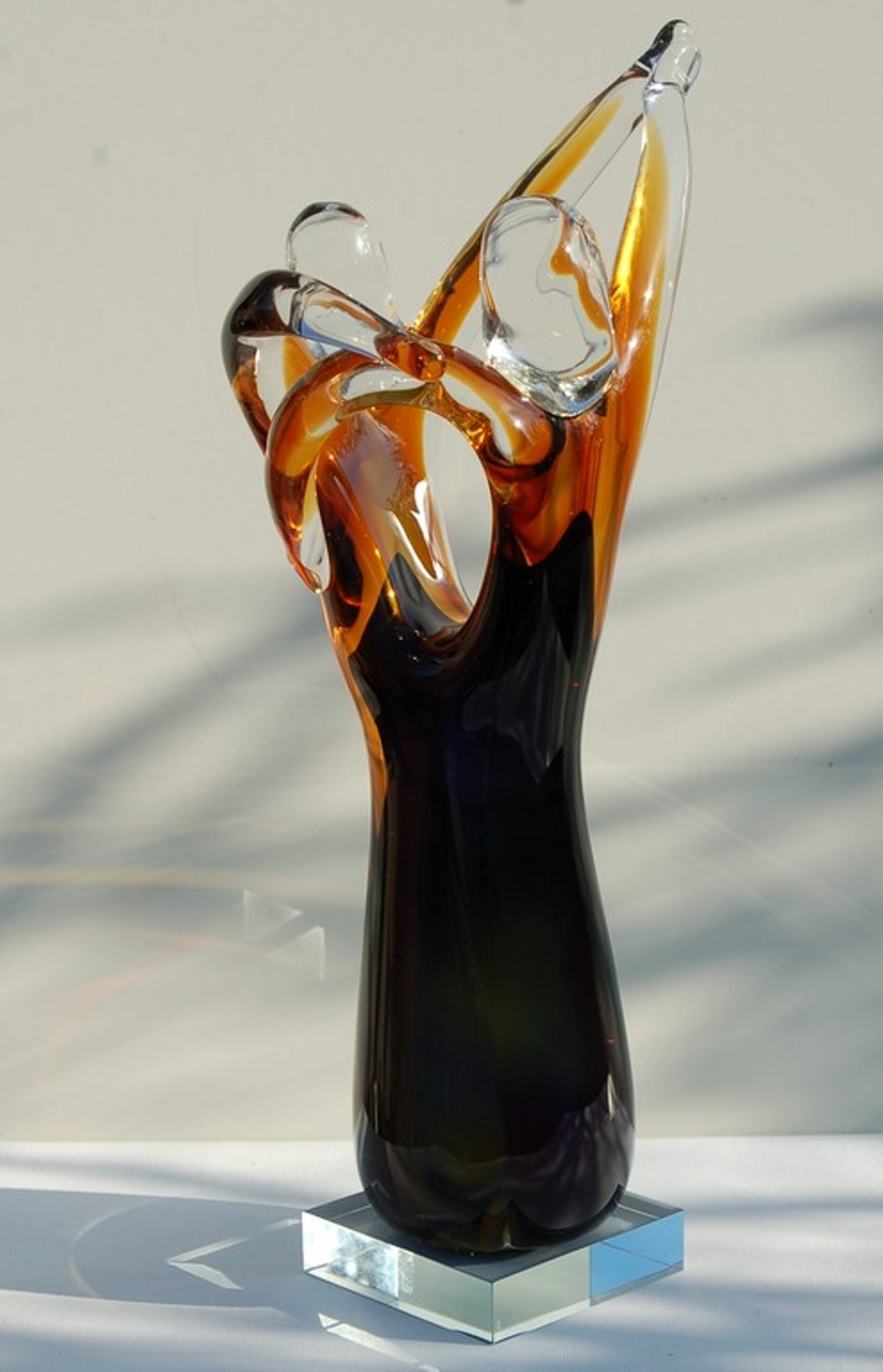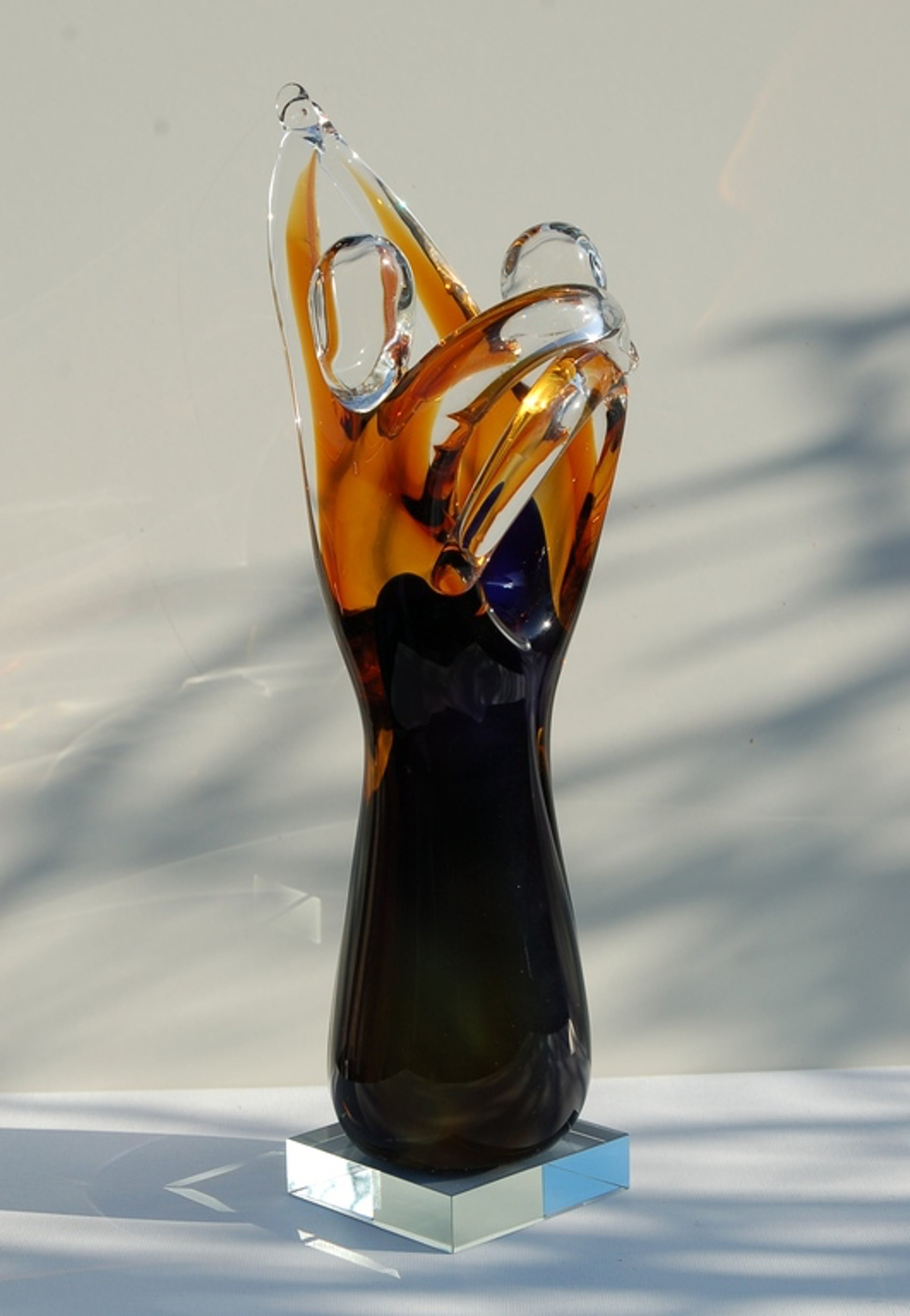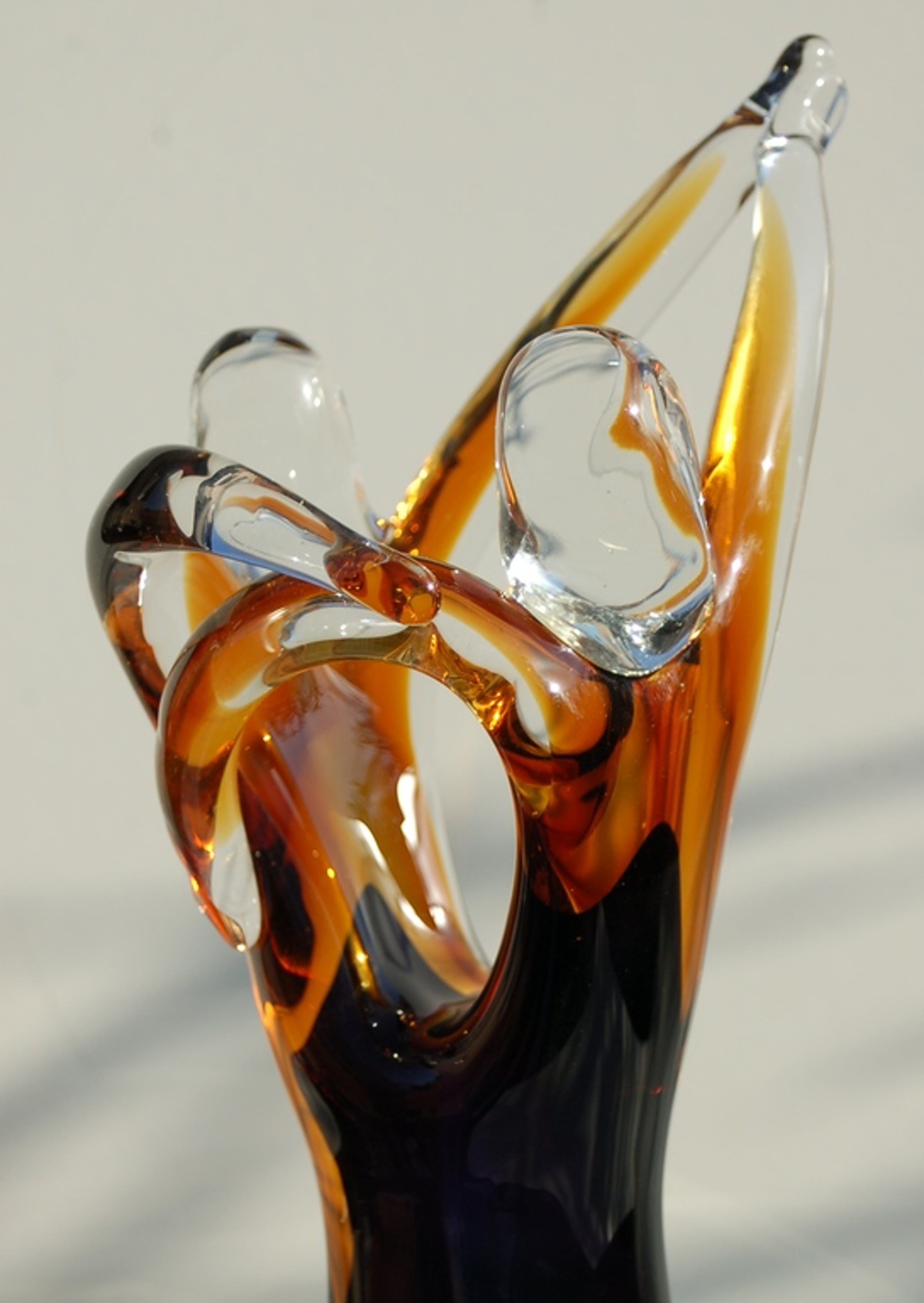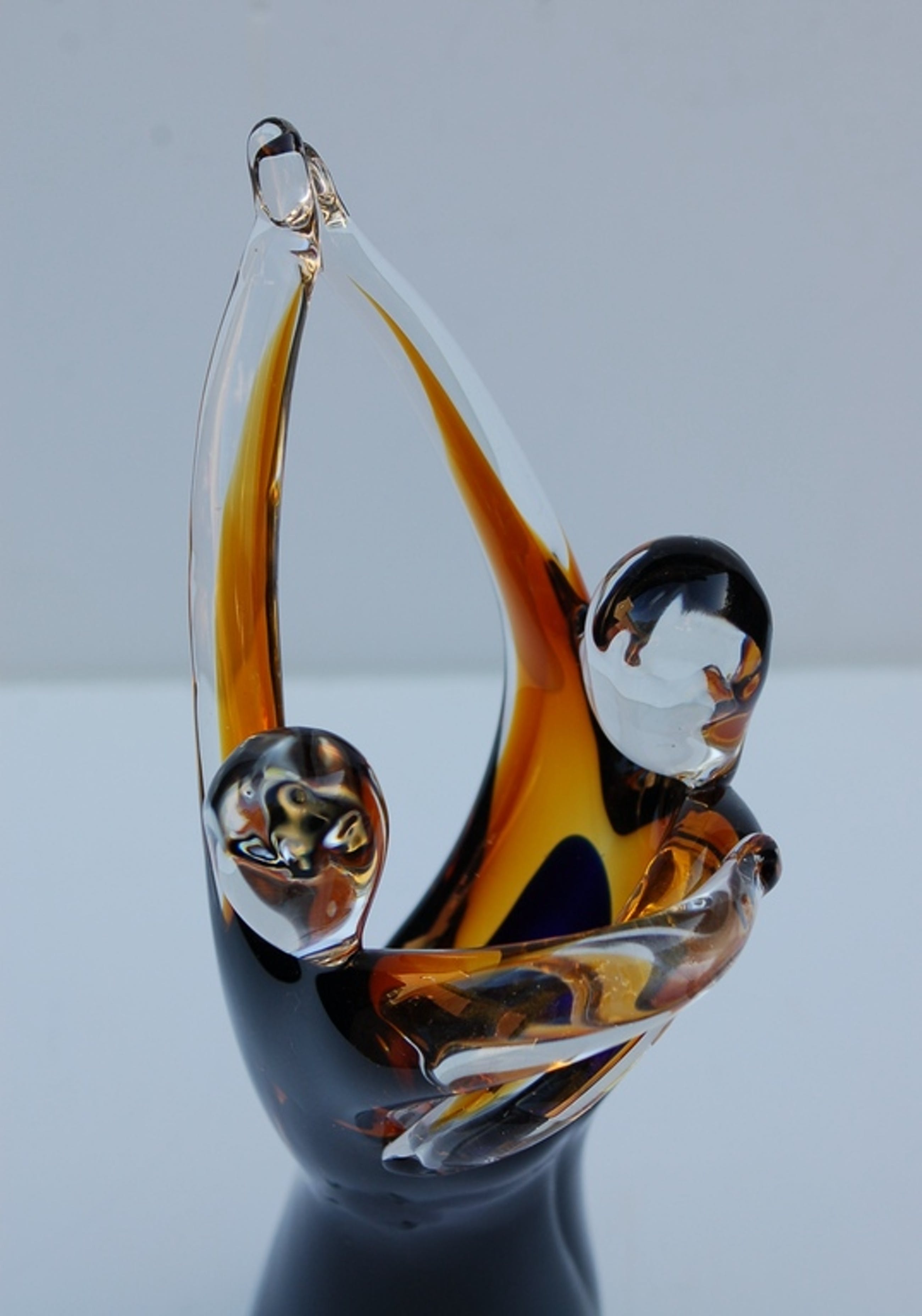 Een mooi modern kunstwerk van glas uit Italië. In het glas zijn de kleuren blauw, groen, bruin en oker zichtbaar. De hoofden en de sokkel zijn van blank glas. Met enig (zon)licht erop gaan de kleuren nog meer spreken. In 2014 aangekocht.