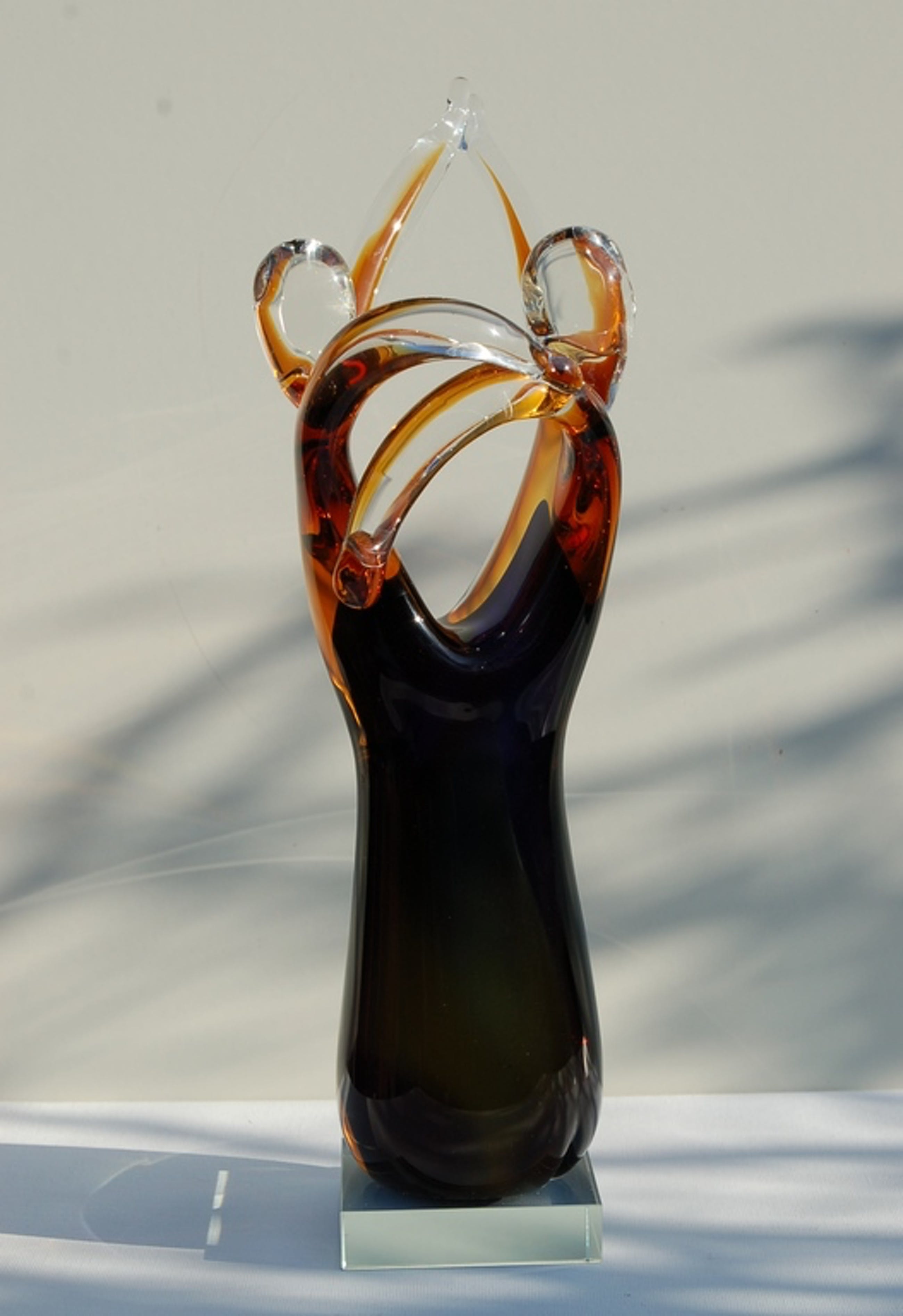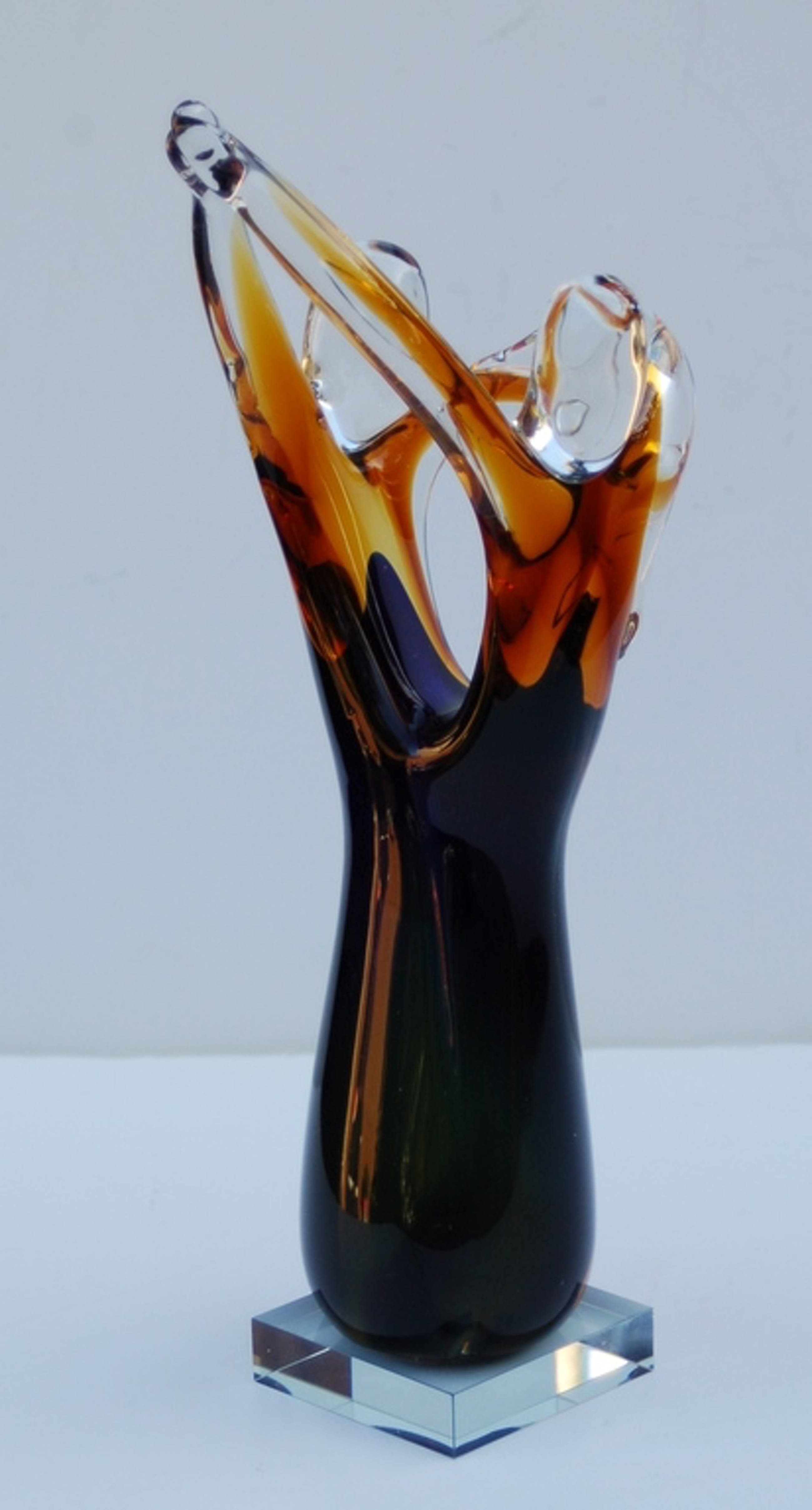 Het glasobject is 36 cm hoog, 16 cm breed en heeft een diepte van 12 cm.
