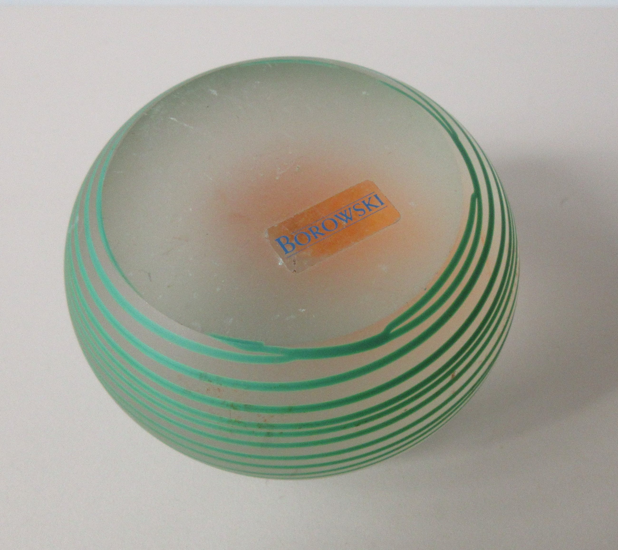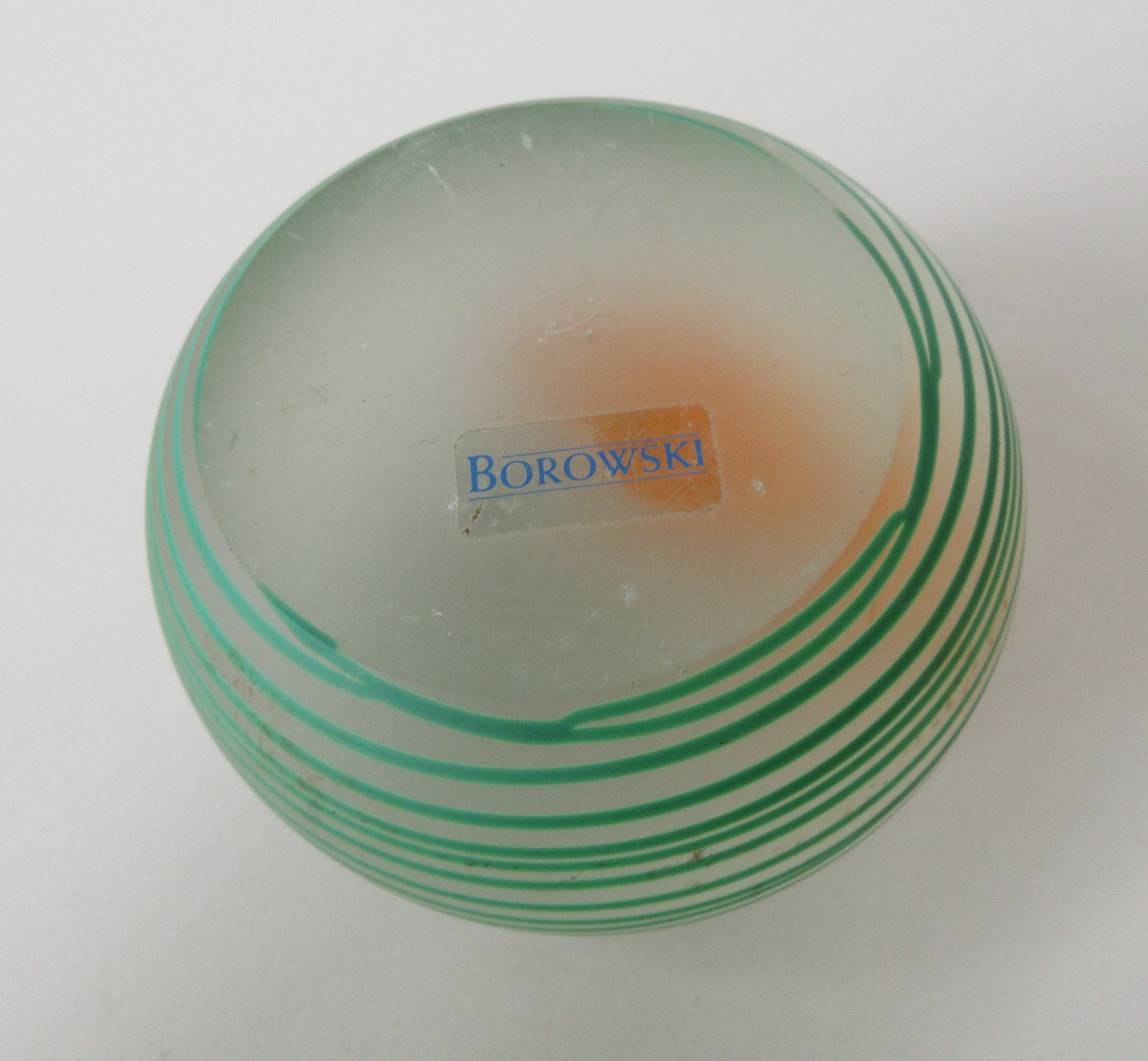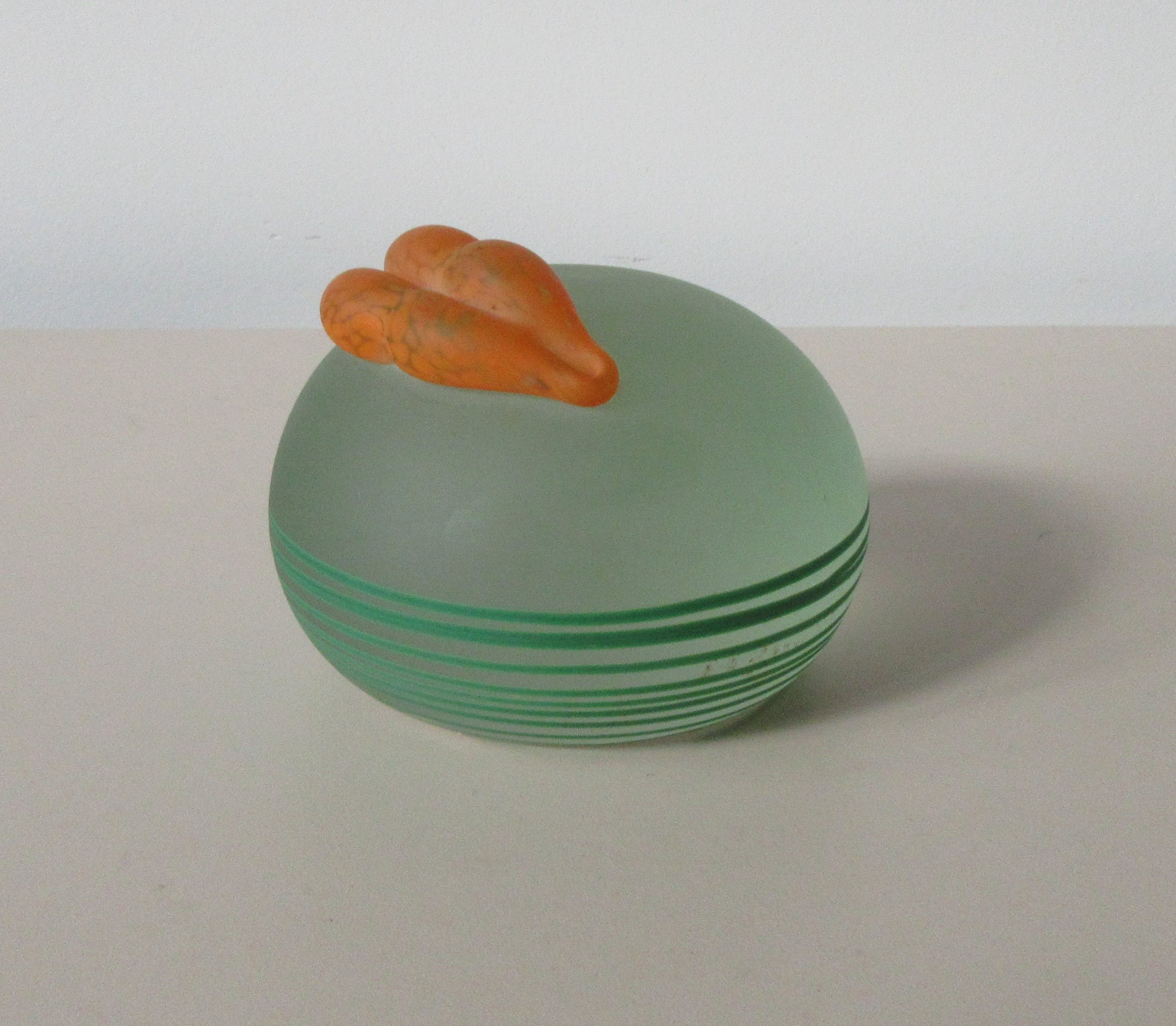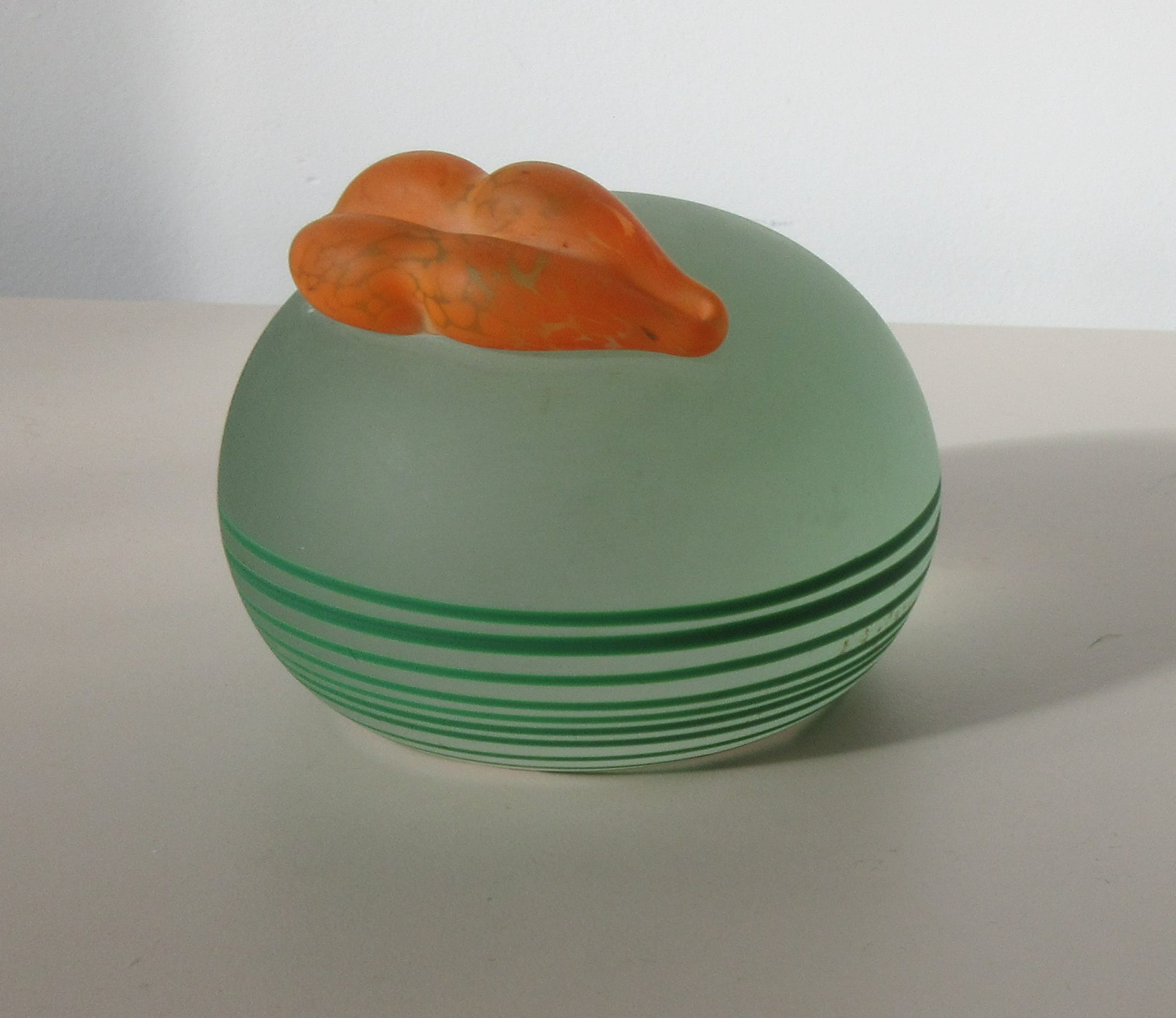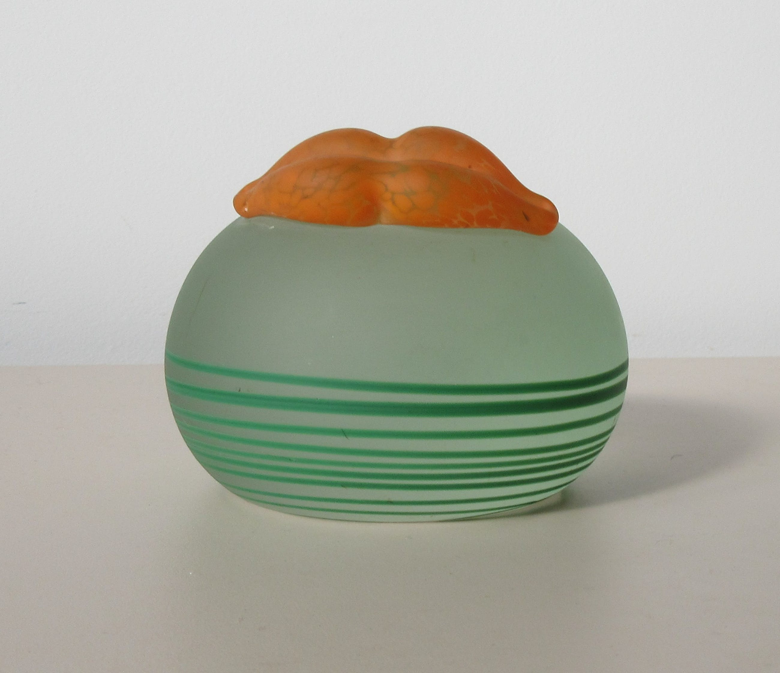 Grote groene gesatineerde presse papier met oranje gesatineerde mond van glasstudio Borowski uit Duitsland. Helaas zit er de mond of de lippen een chipje (zie foto). Gemerkt met een sticker aan de achterzijde.