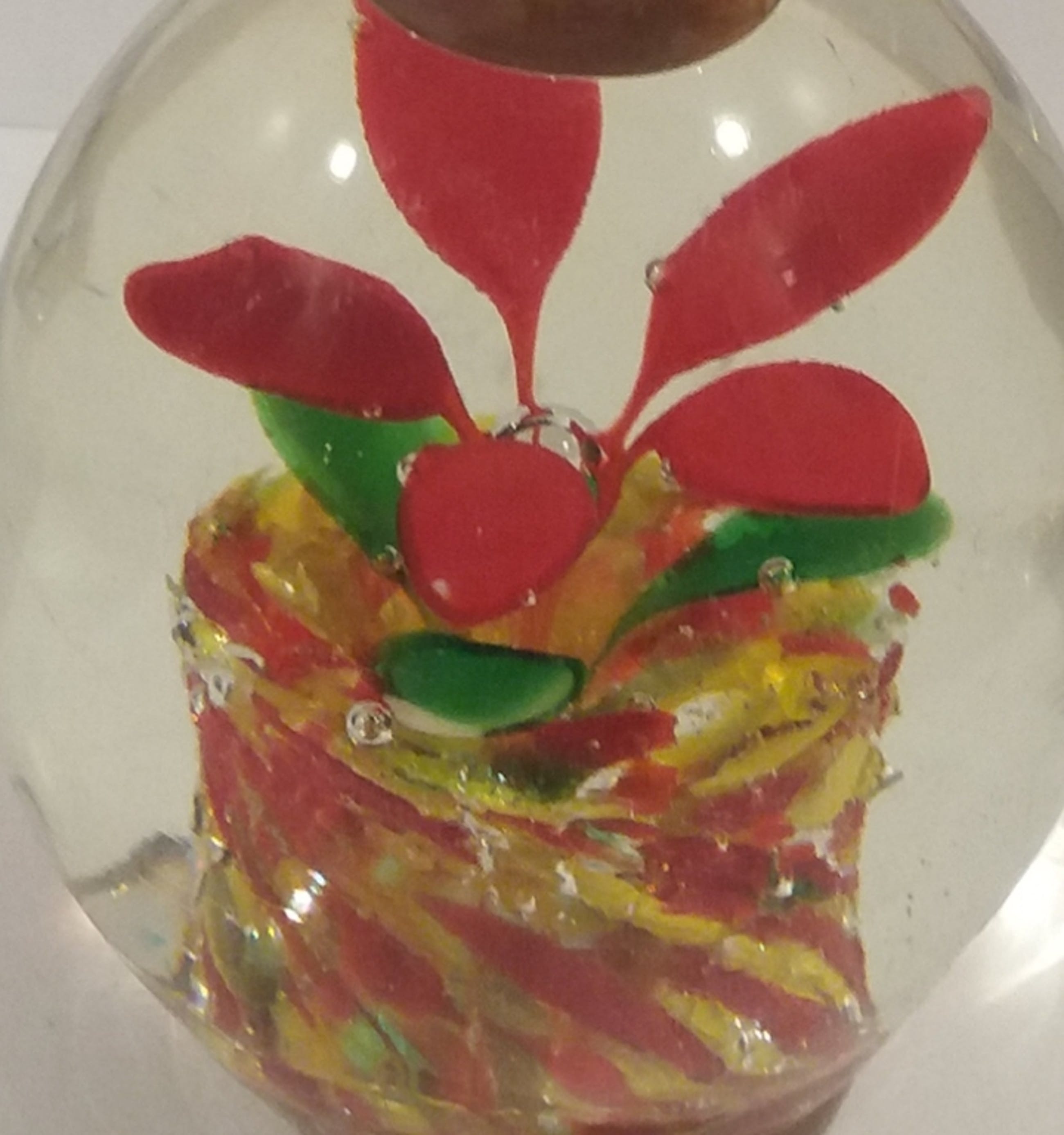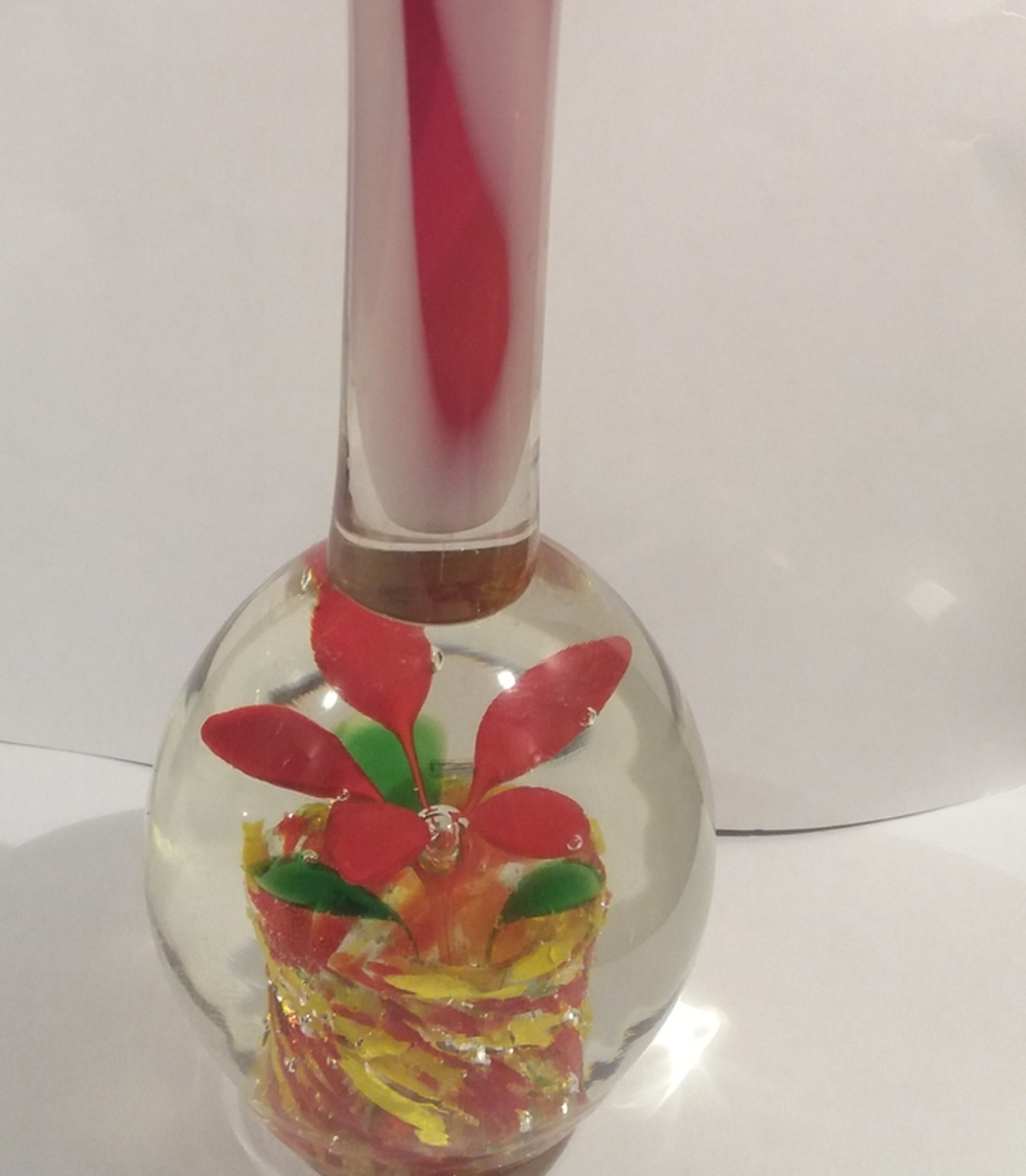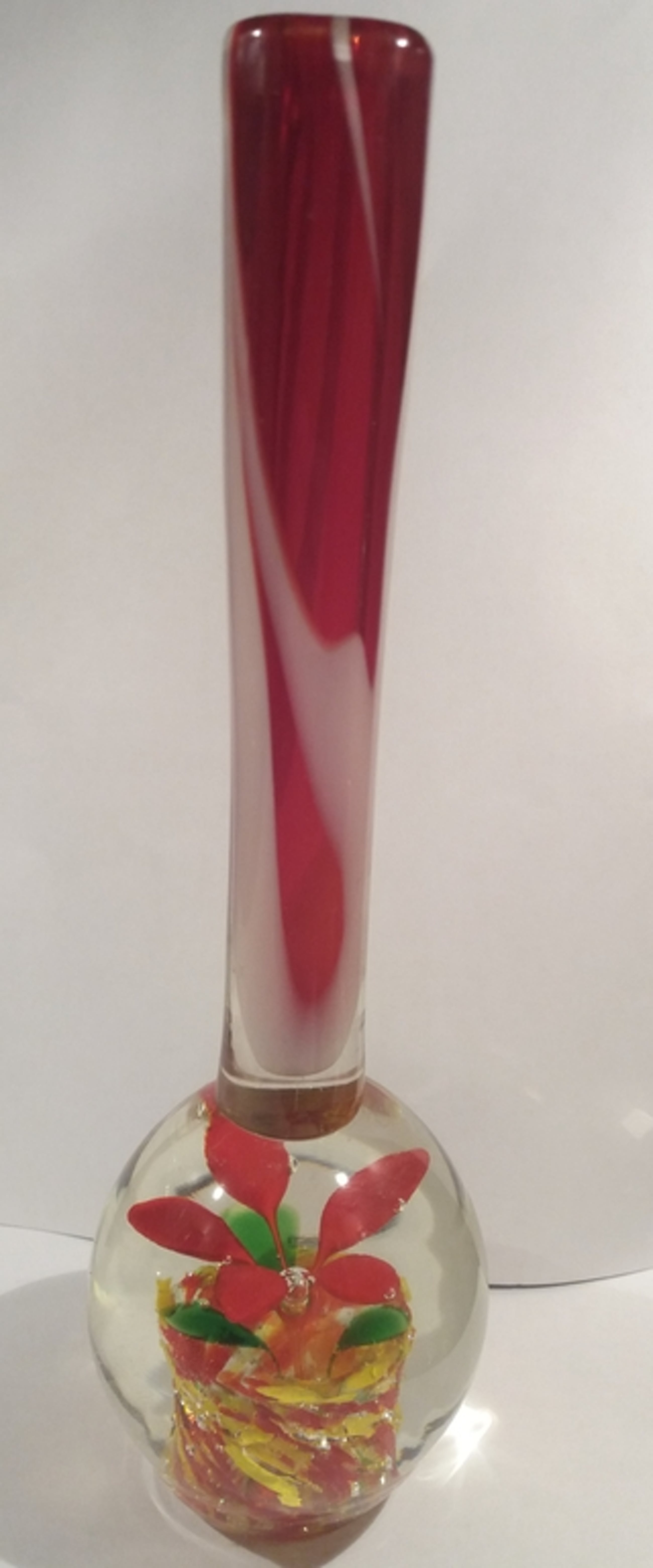 Glazen presse papier met rode en wit hals en rode bloem onderin Murano.
