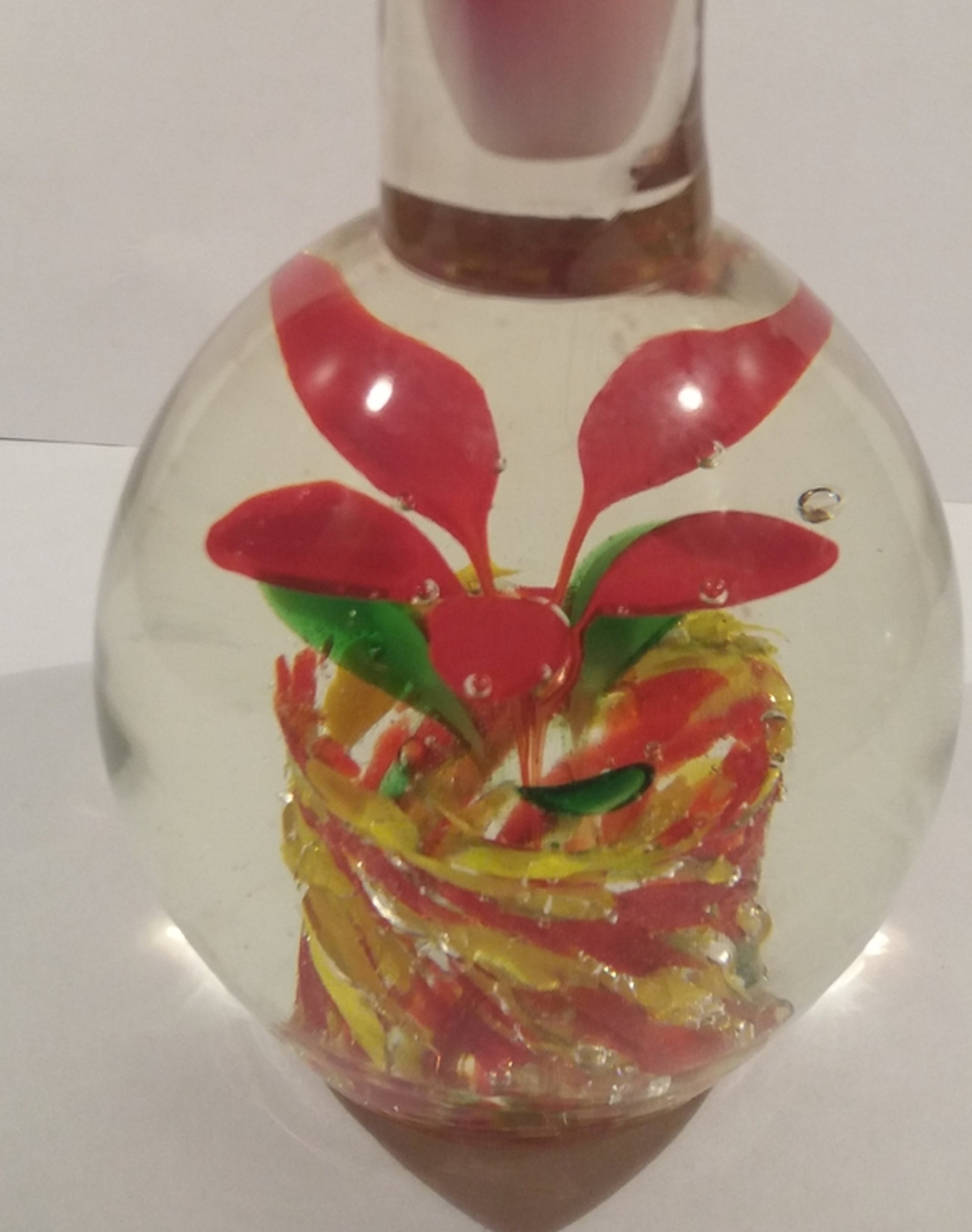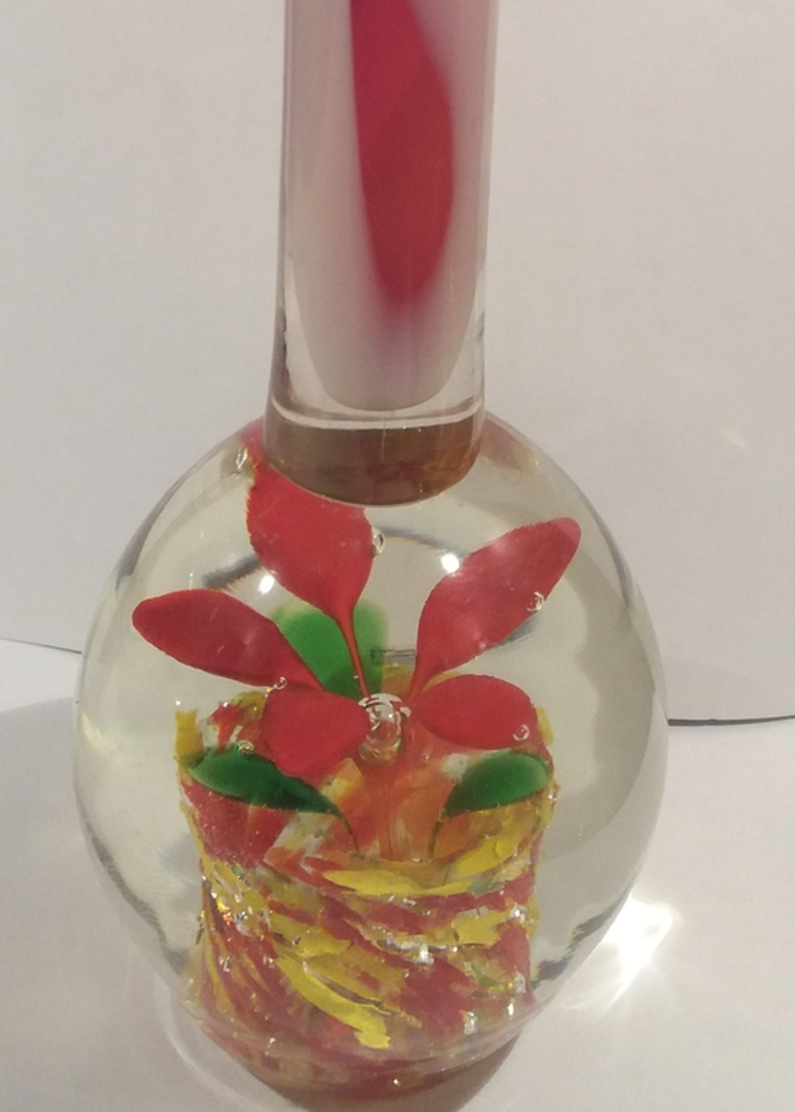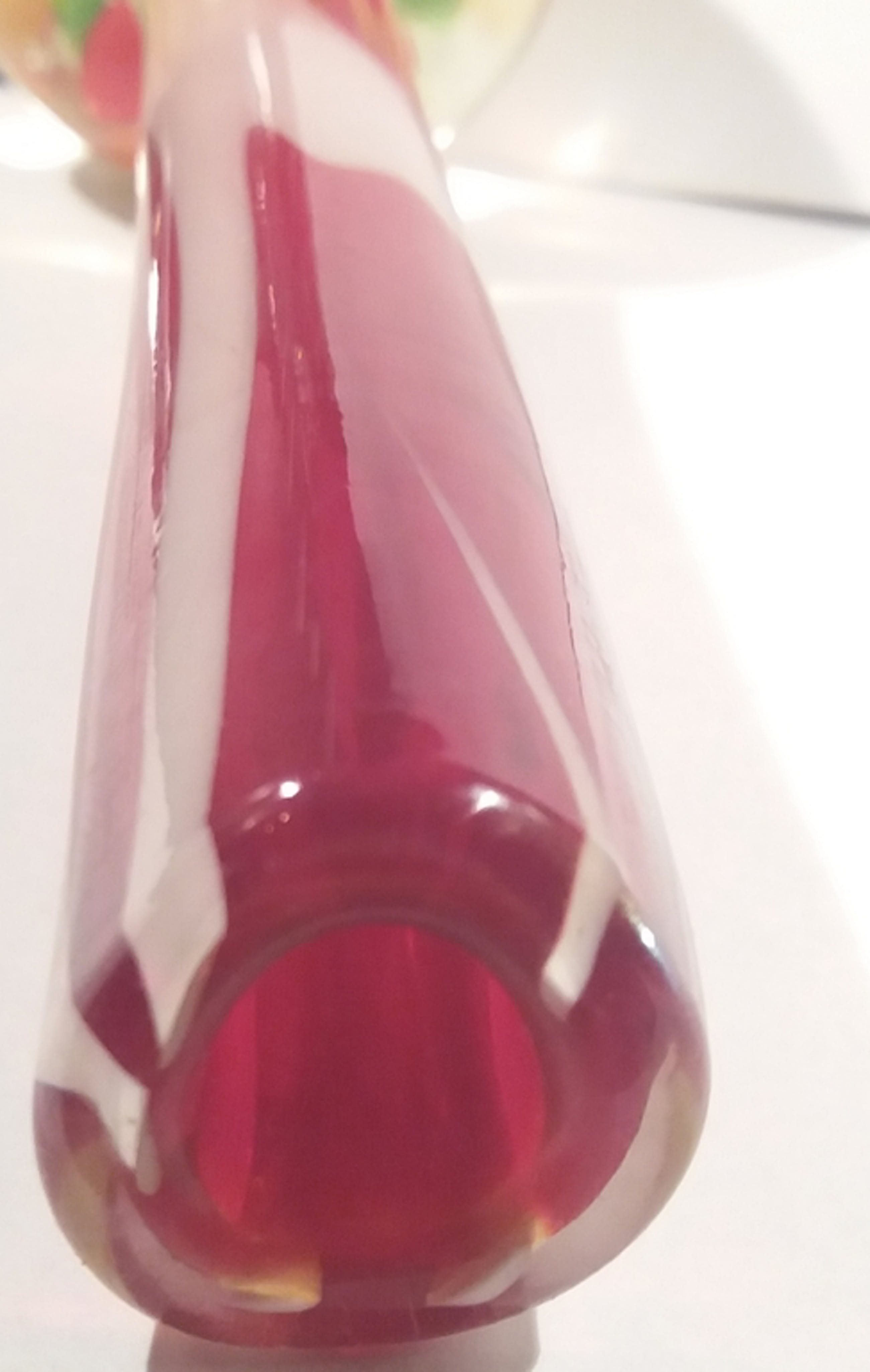Glazen presse papier met rode en wit hals en rode bloem onderin Murano.