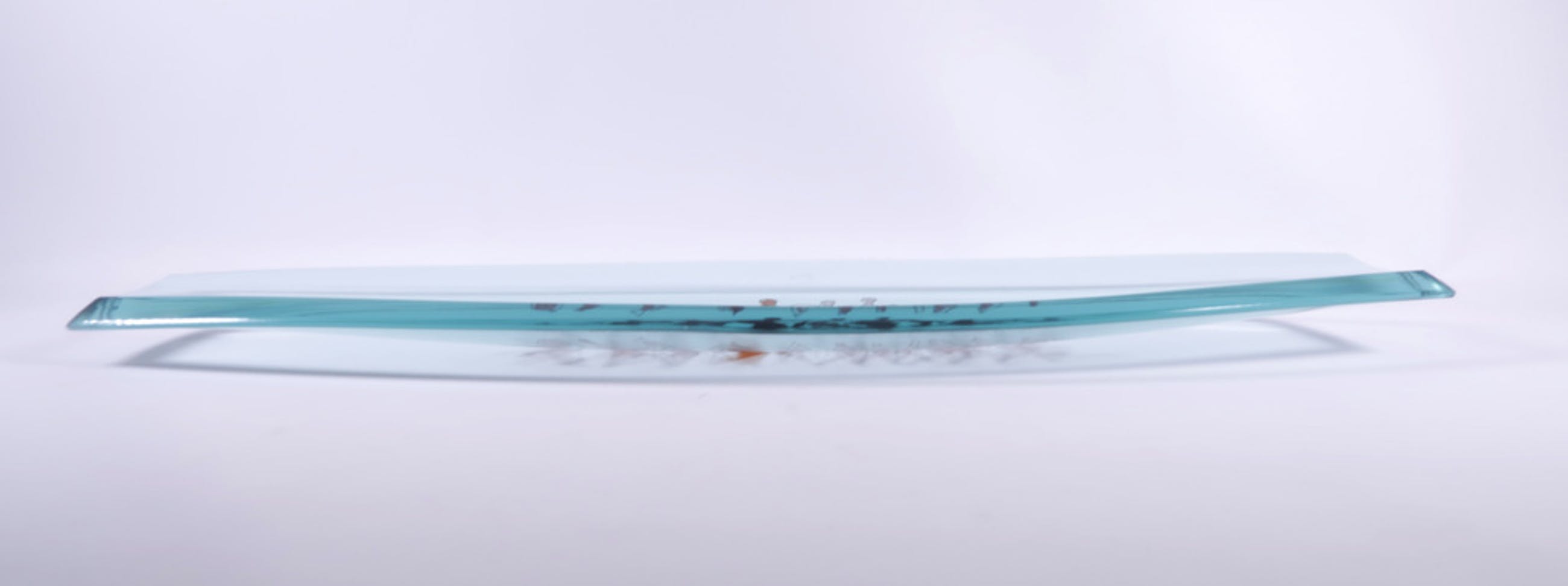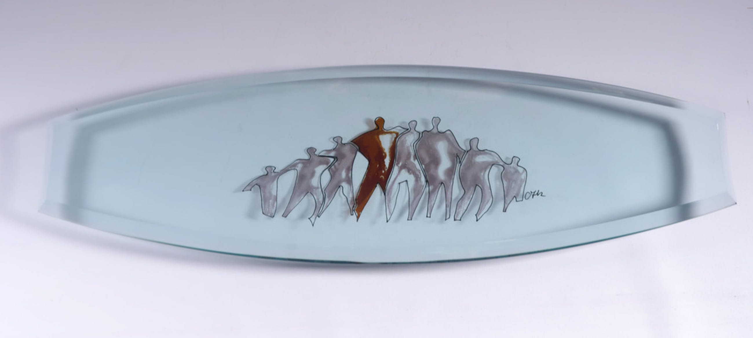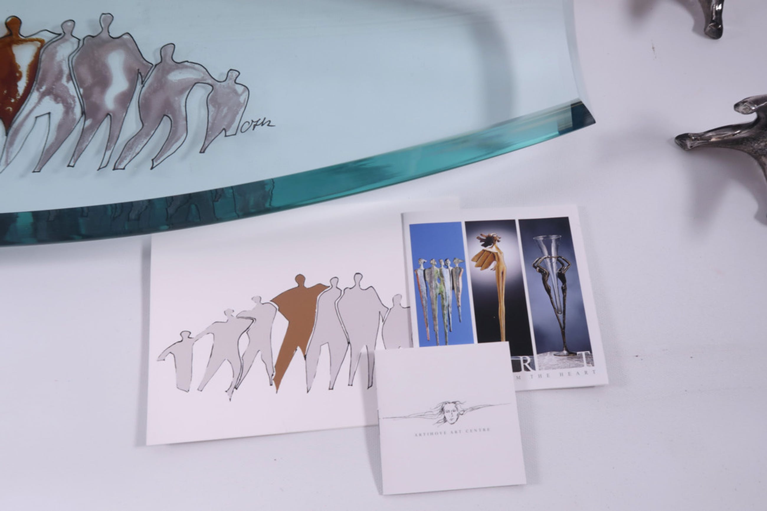 Titel: Glazen schaal met twee metalen sculpturen in houten bewaarbox met documentatie