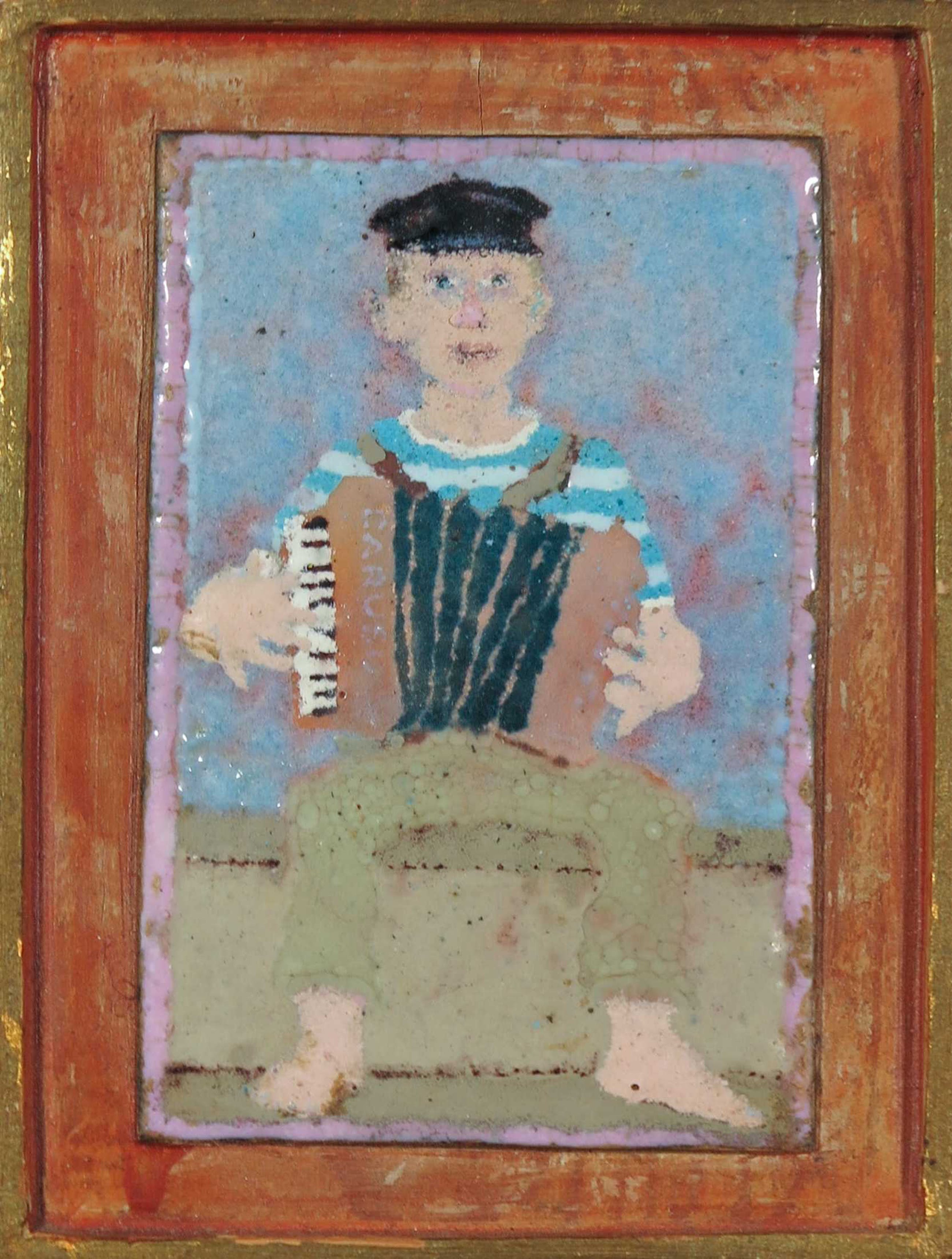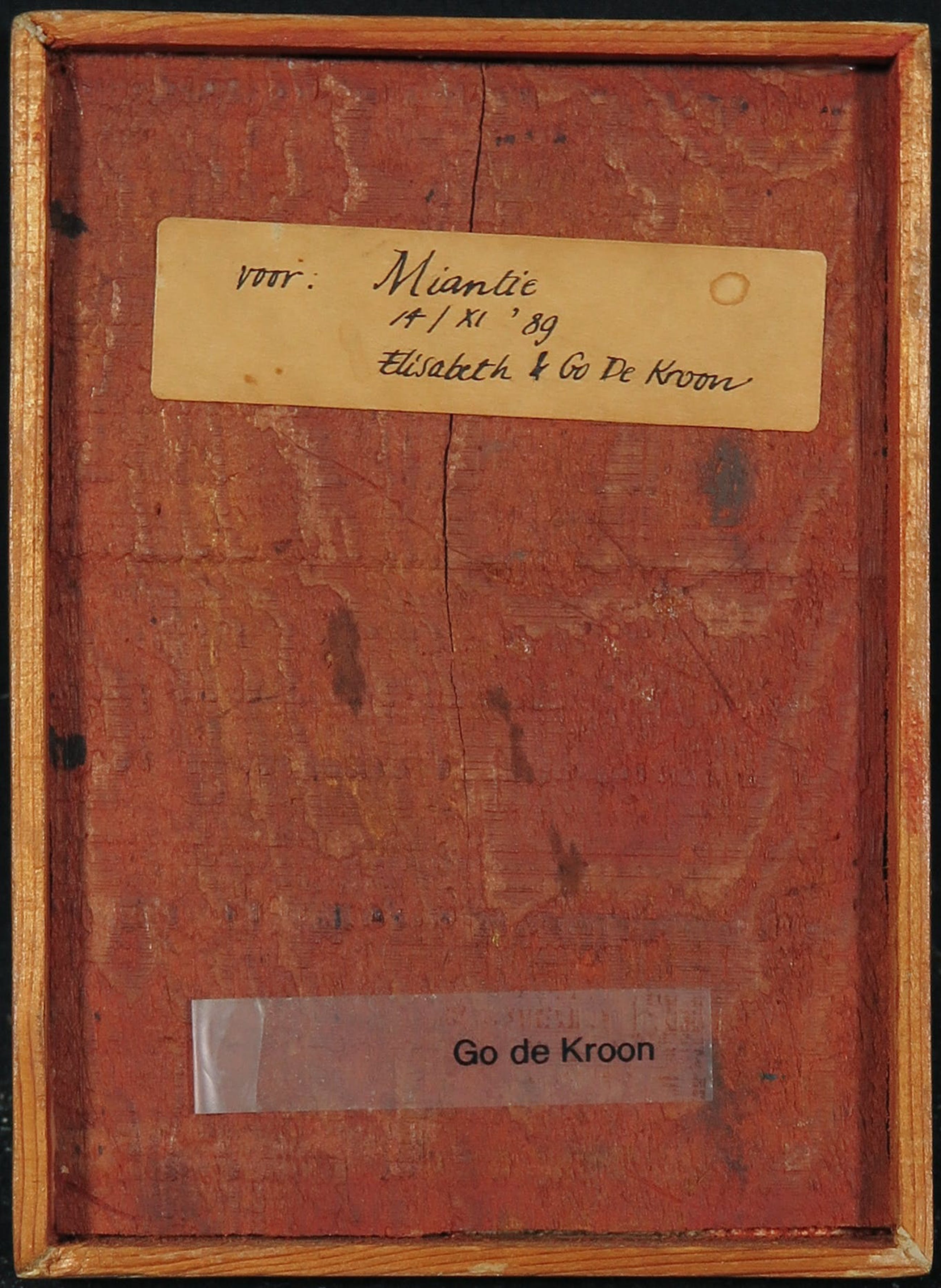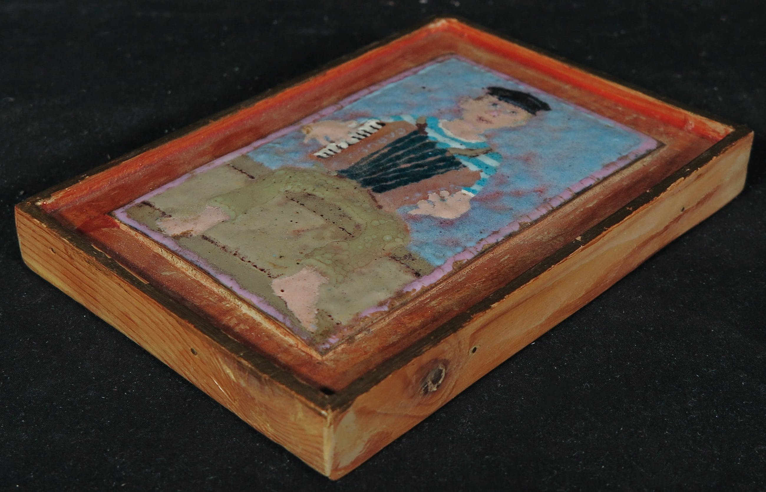 Kleine schildering in emaille-techniek door Go de Kroon. Het plaatje is bevestigd tegen een houten paneeltje dat als lijstje fungeert.