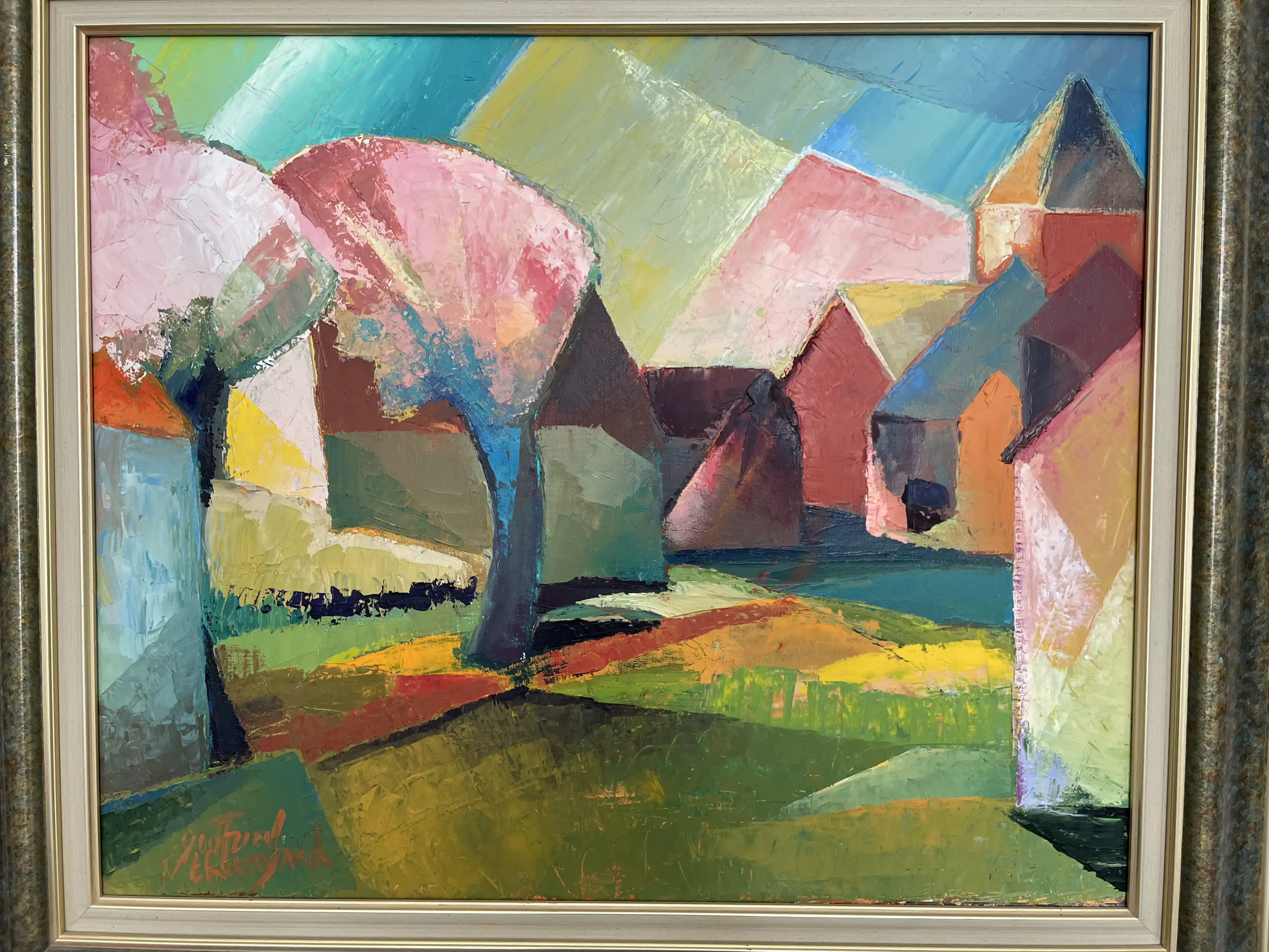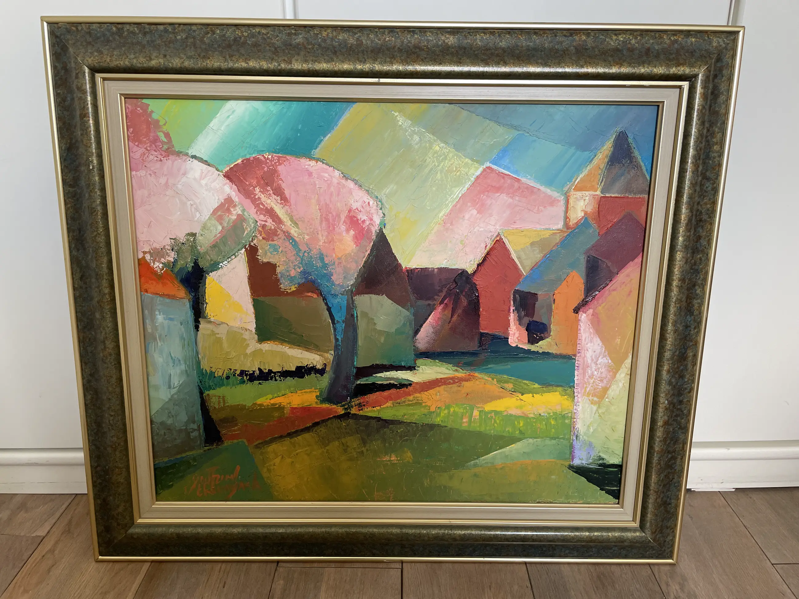 Zeer decoratief en mooi ingekaderd schilderij met een dorpzicht in - voor deze kunstenaar eerder uitzonderlijke - frisse lentekleuren.