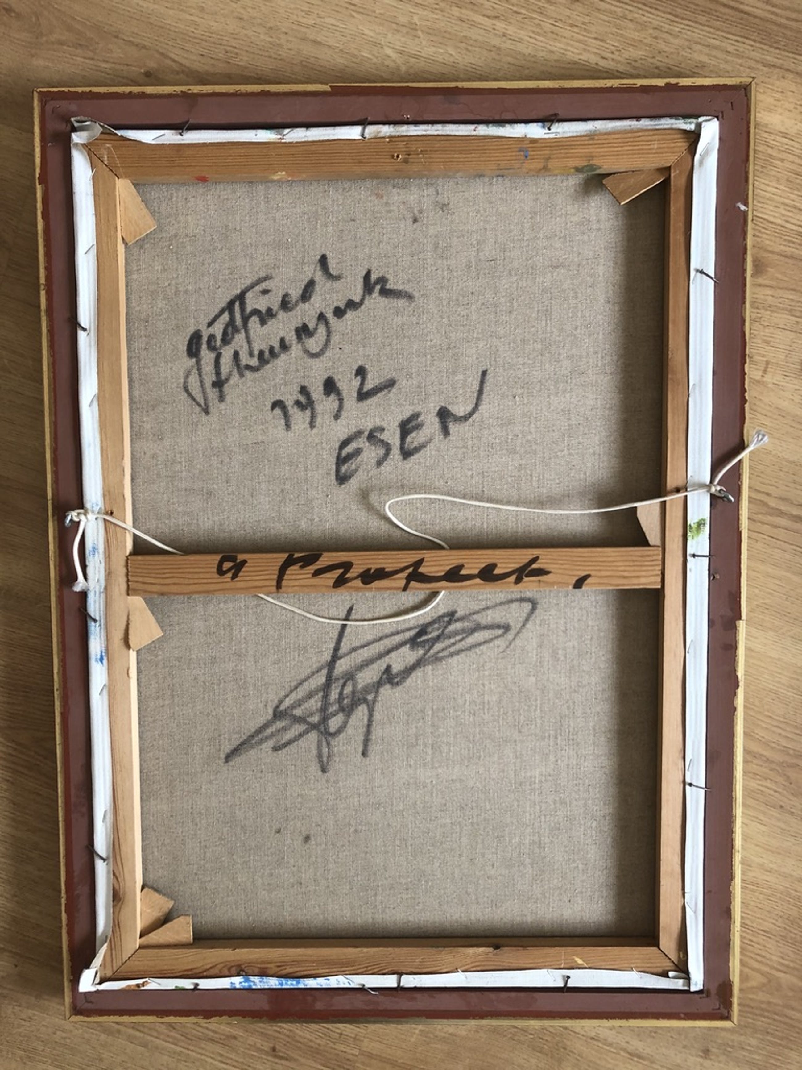 Zie ook de achterkant van het schilderij, ook een kenmerk van de schilder.