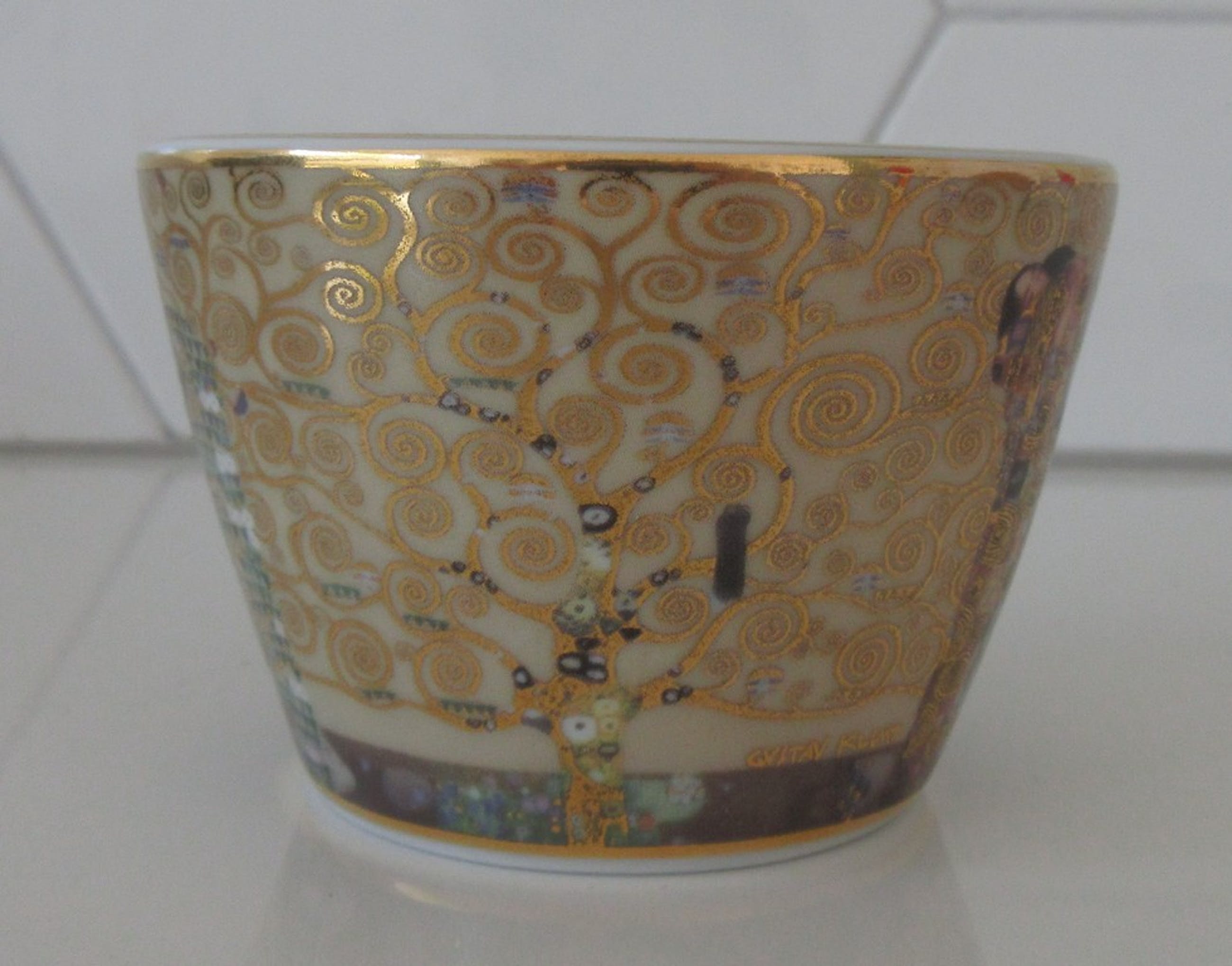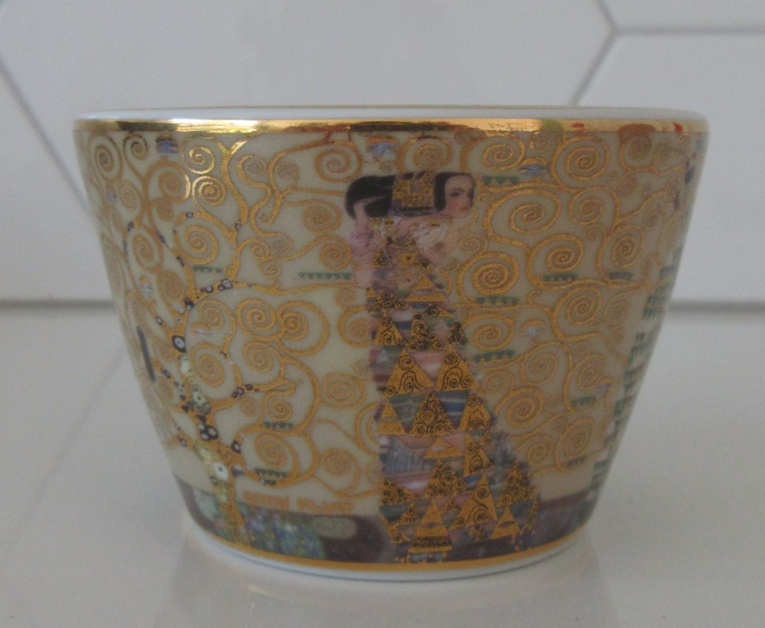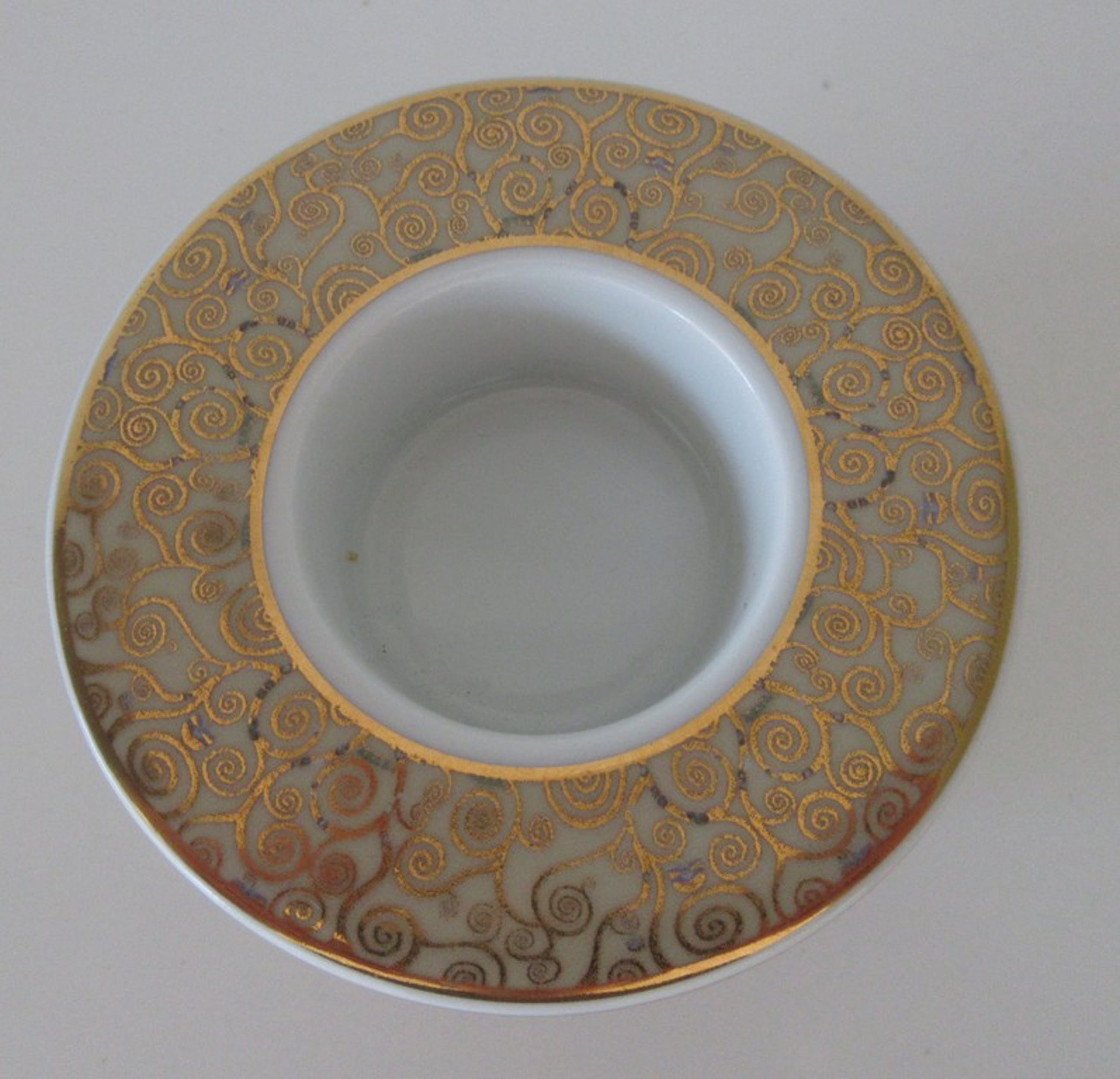 Mooie porseleinen kandelaar van Goebel uit de Artis & Orbis met een afbeelding van Gustav Klimt. Handgedecoreerd en in prima conditie, aan de voorzijde gesigneerd Gustv Klimt en aan de achterzijde is de kandelaar gemerkt.