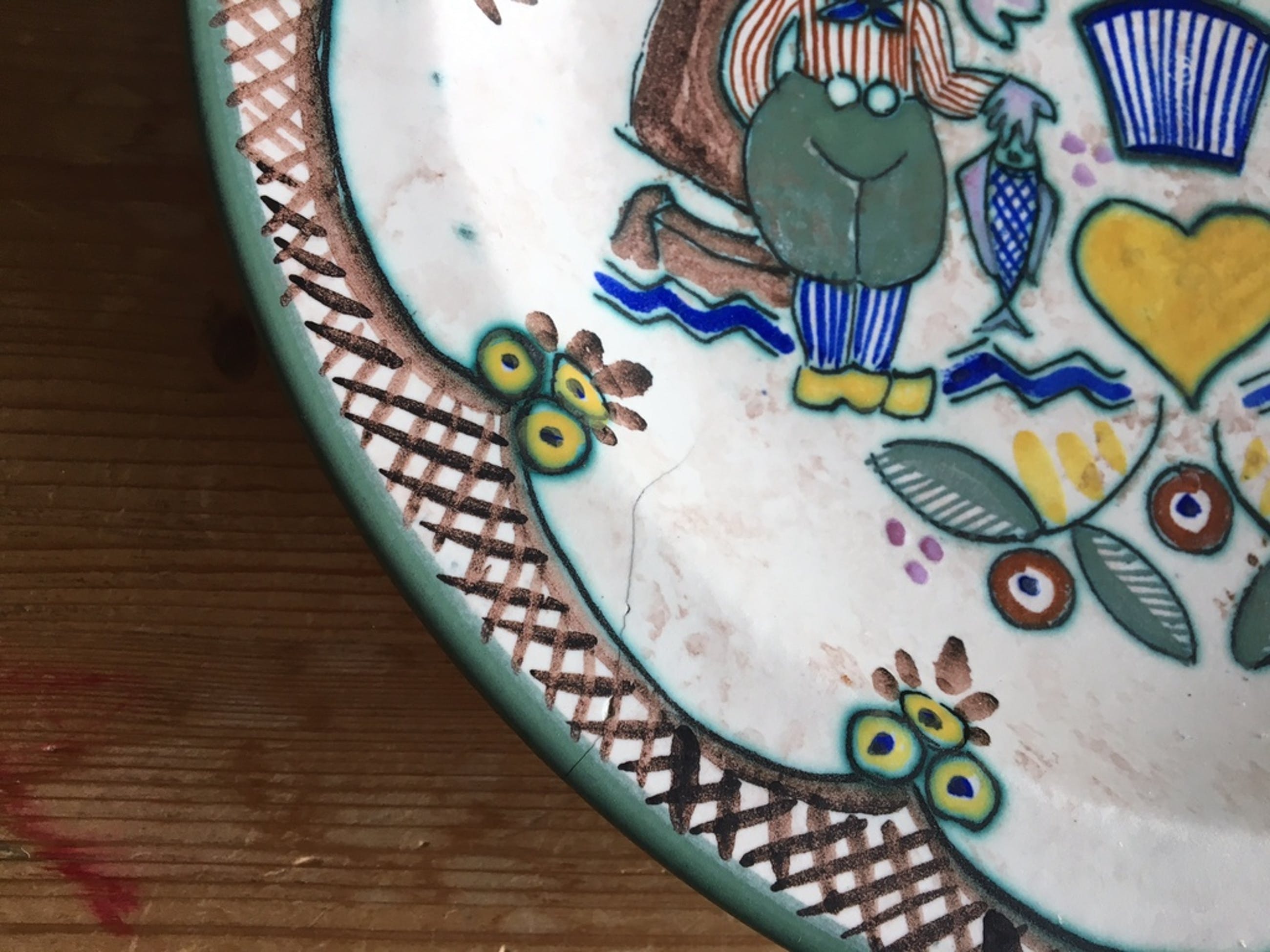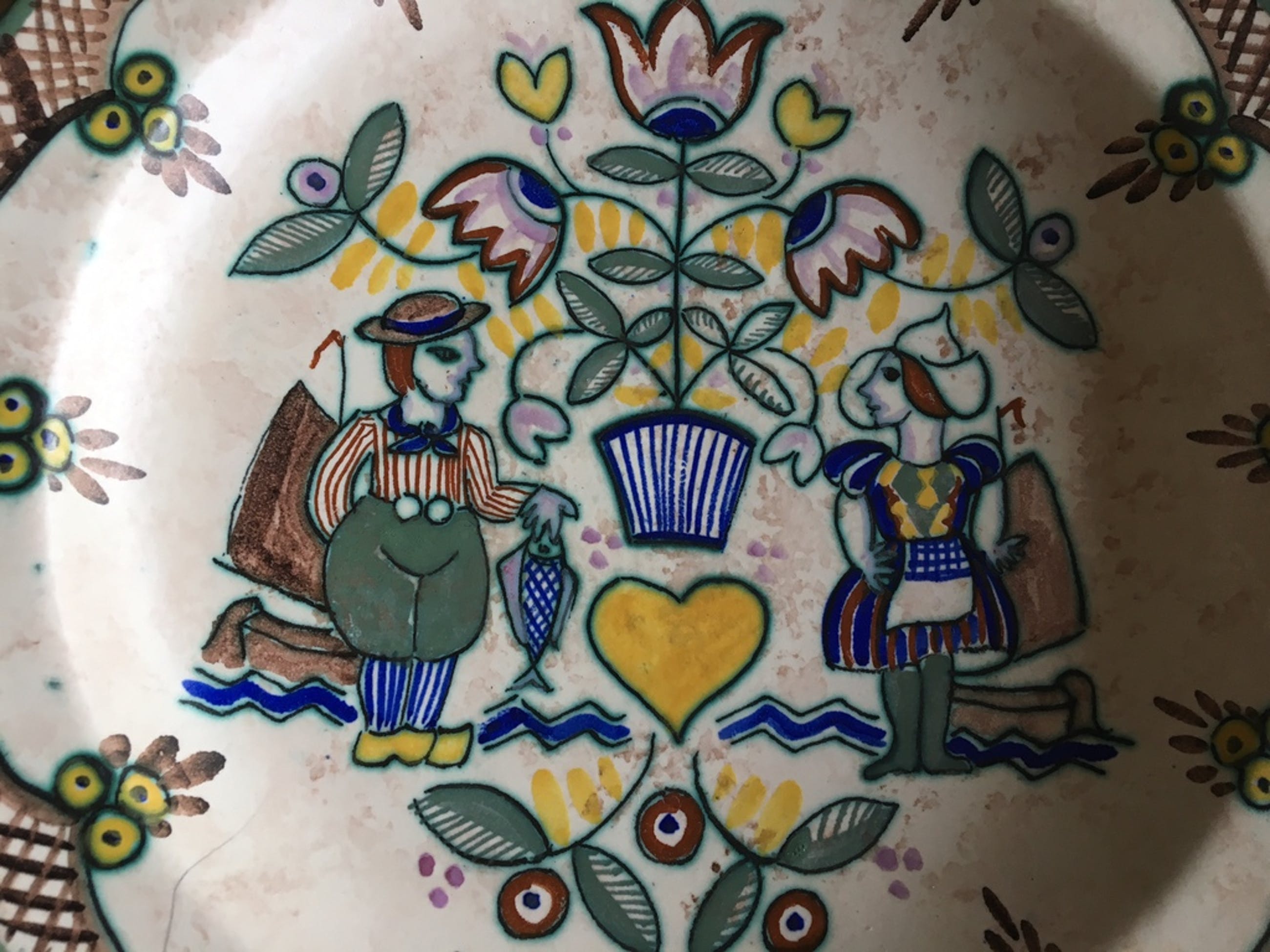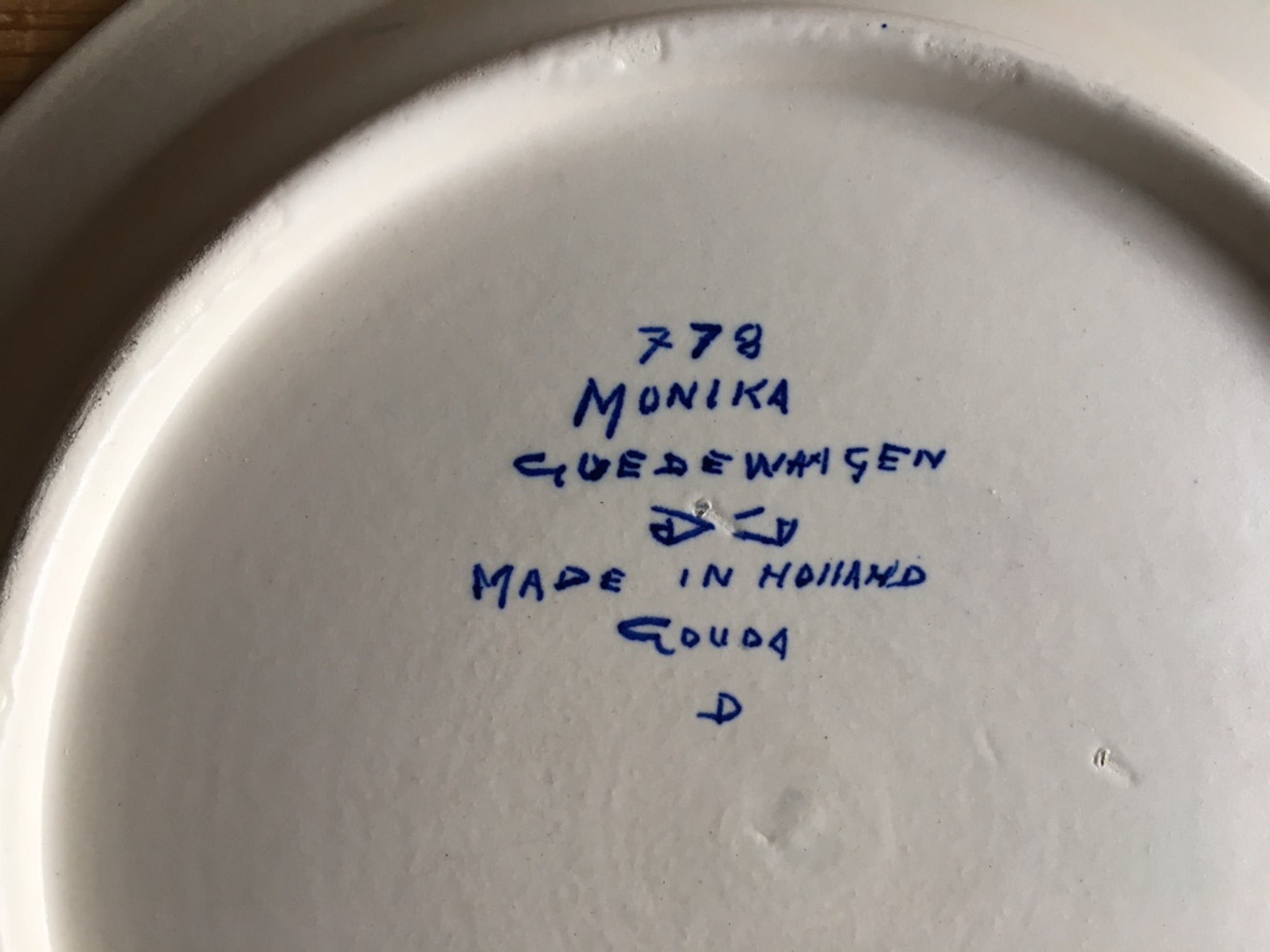 Mooi stuk Gouds plateel uit de jaren '40-'50. Handbeschilderd. Aan de onderzijde met de hand gemerkt en voorzien van decornaam en nummers. Heeft een haarlijn op de rand.