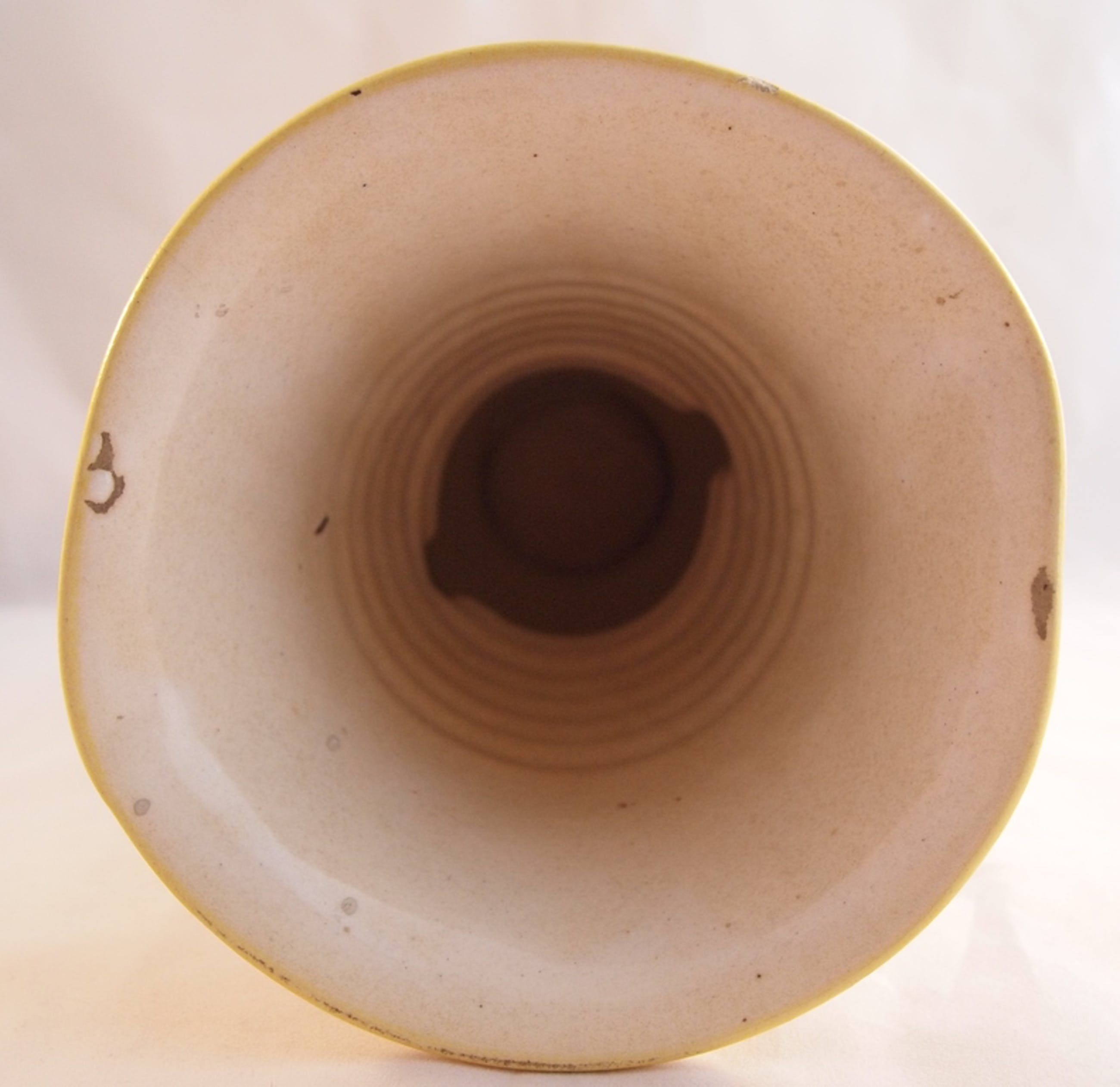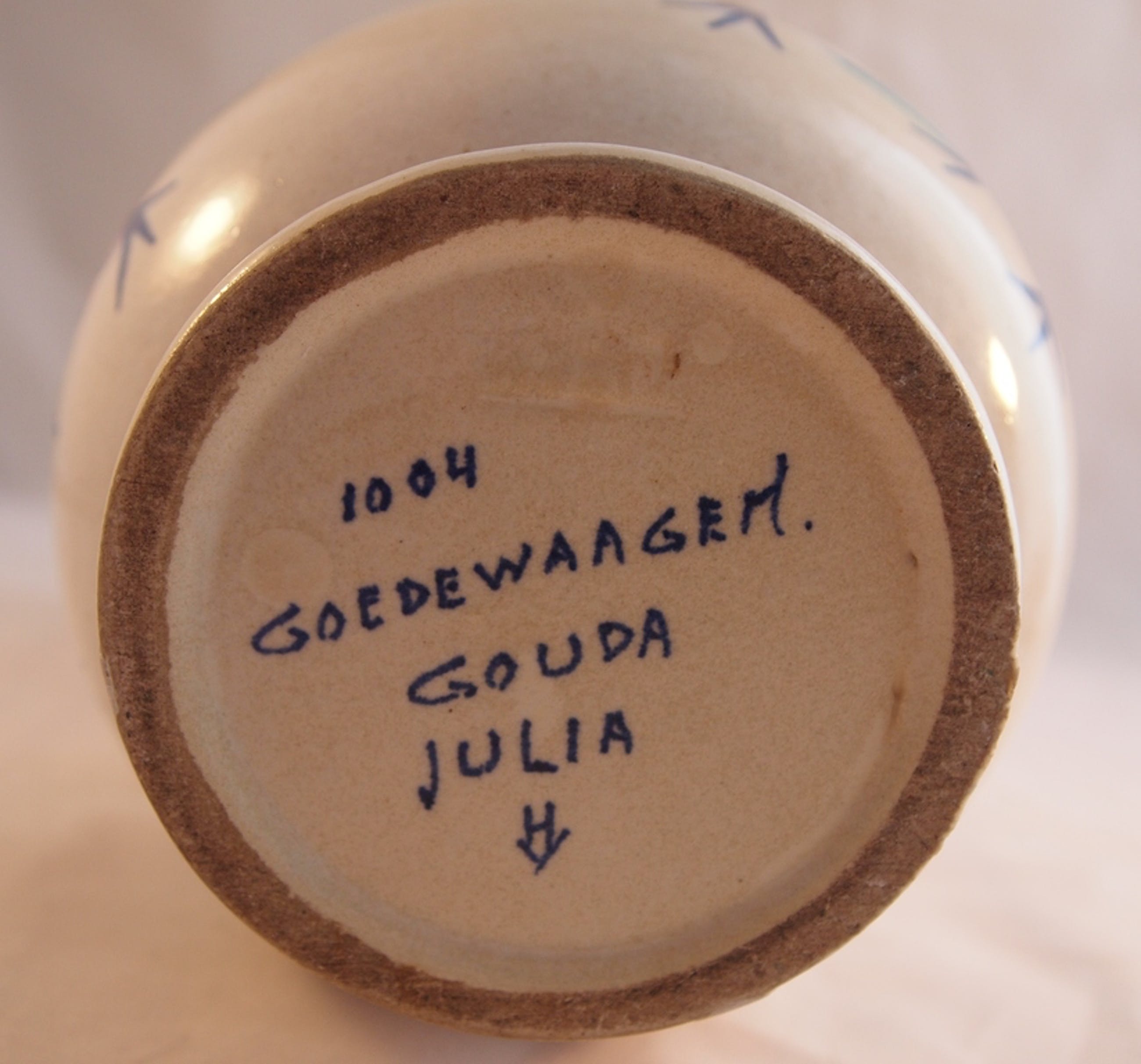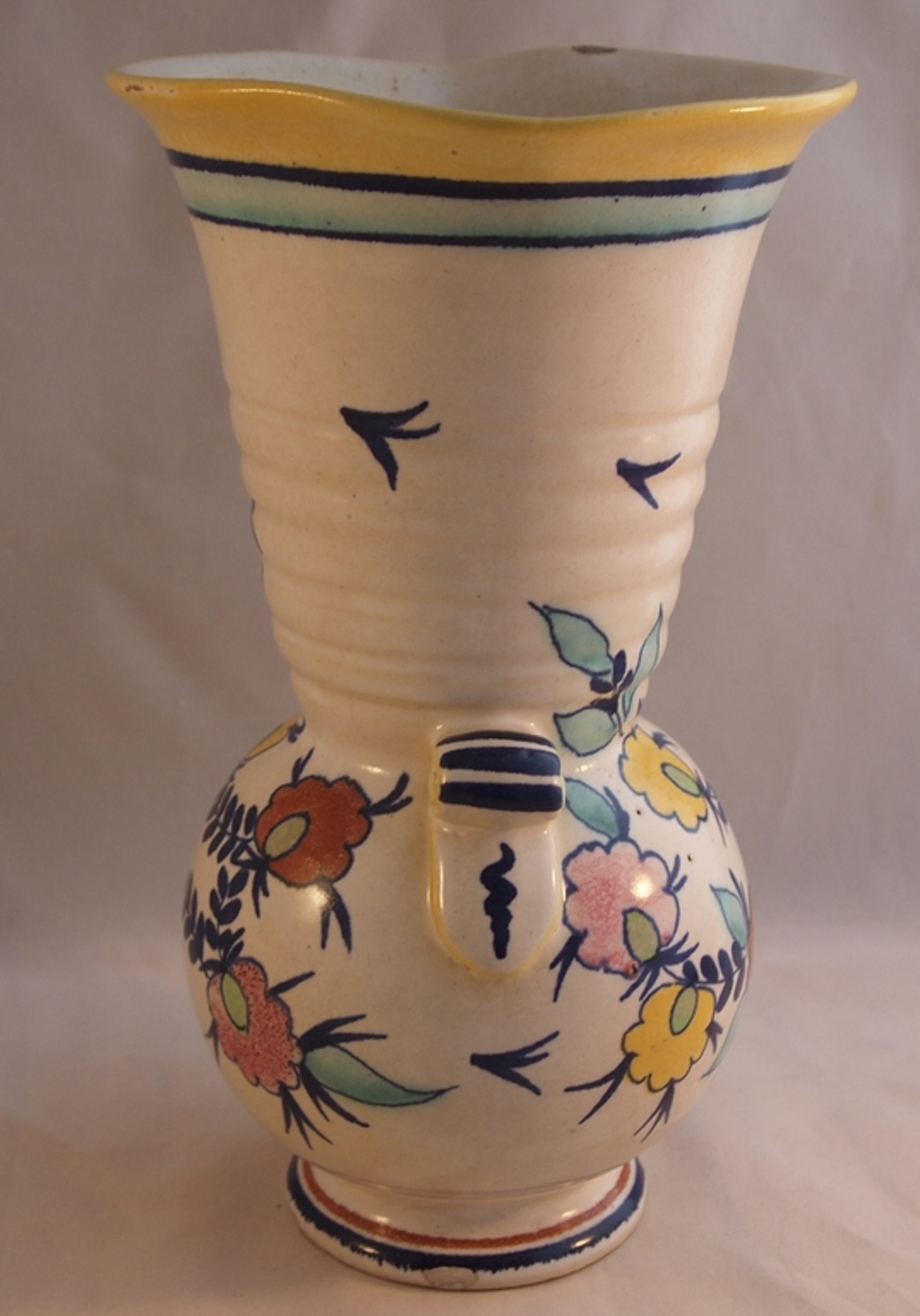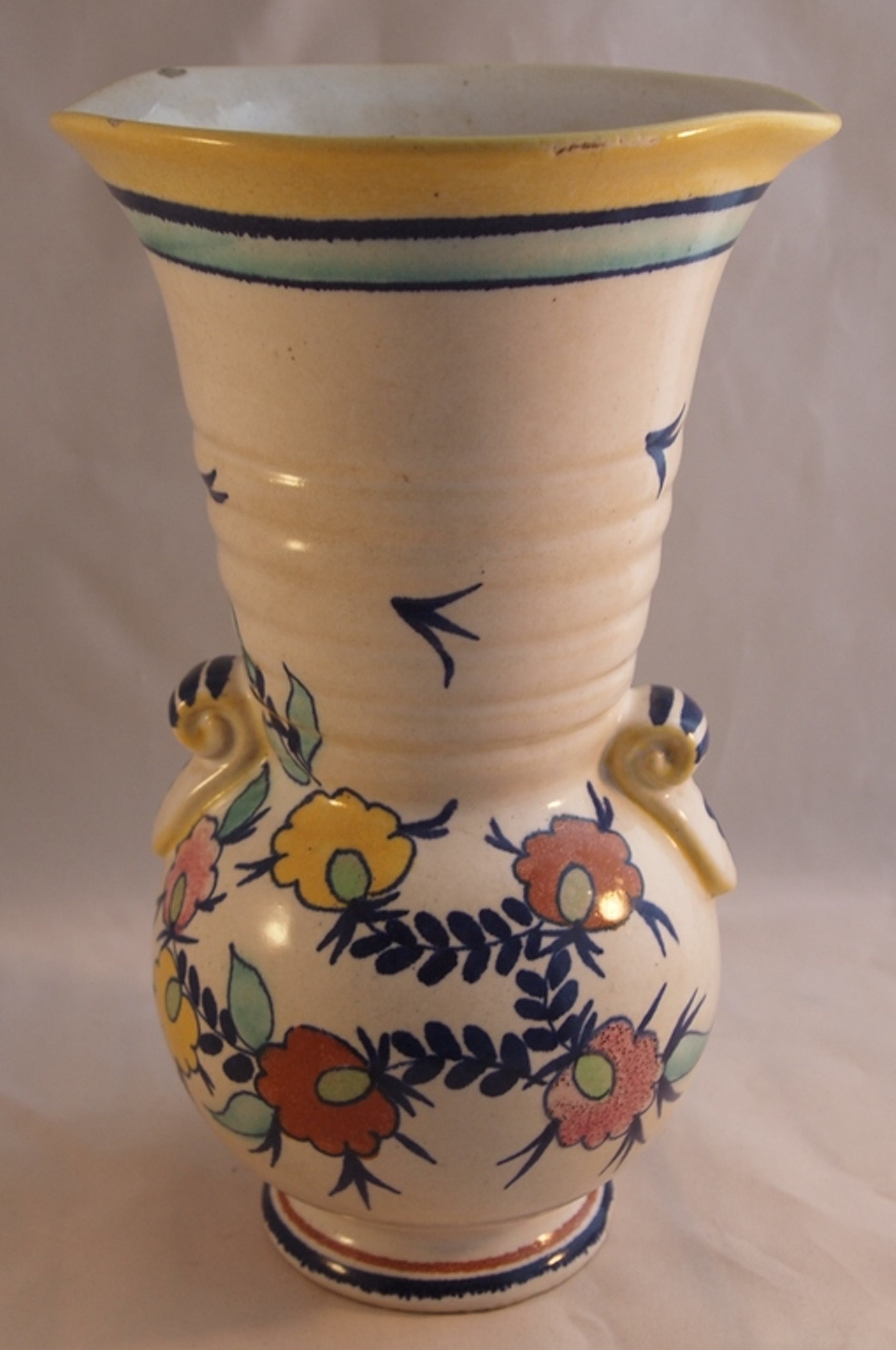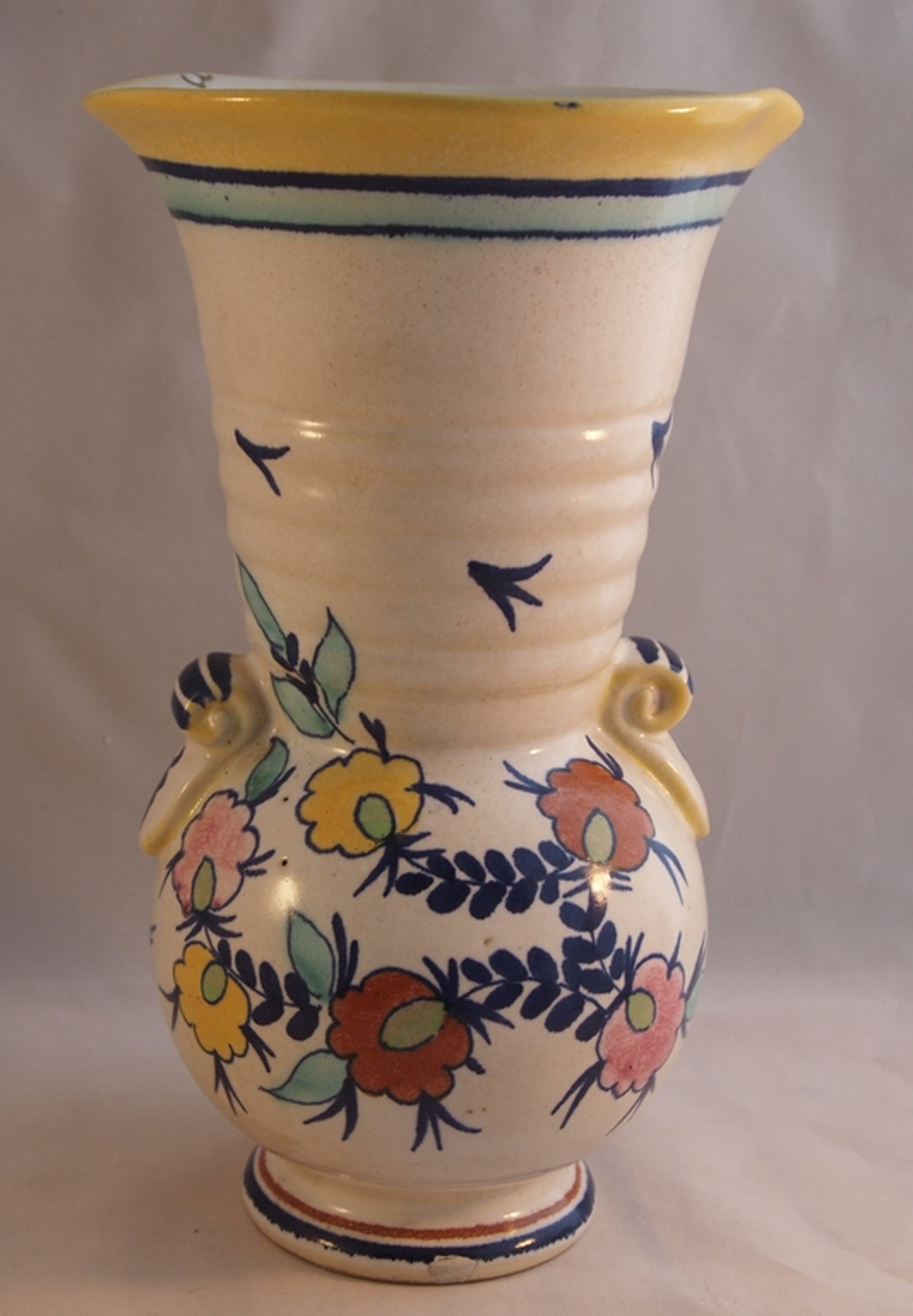 Mooie kleurrijke hand beschilderde platelen vaas decor Julia. In goede conditie, een fleebite op de bovenrand van de vaas en twee kleien bakfoutjes. Aan de onderzijde met de hand gemerkt en gesigneerd.