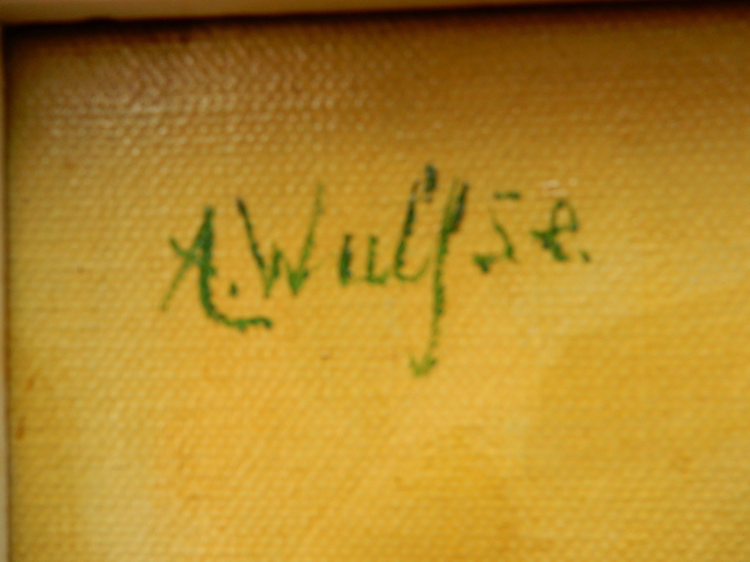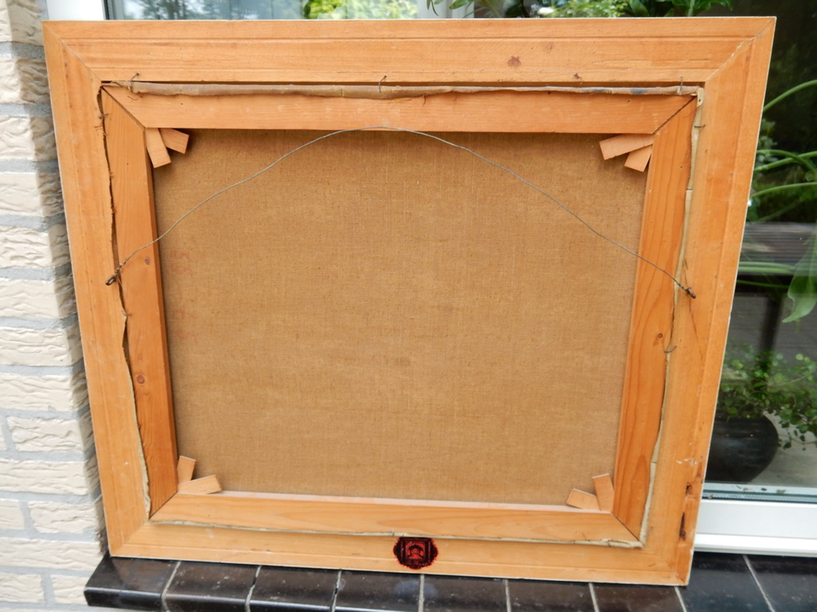 Aan de achterzijde van het schilderij een fignet, organike lijst Kunsthandel De Poort,
