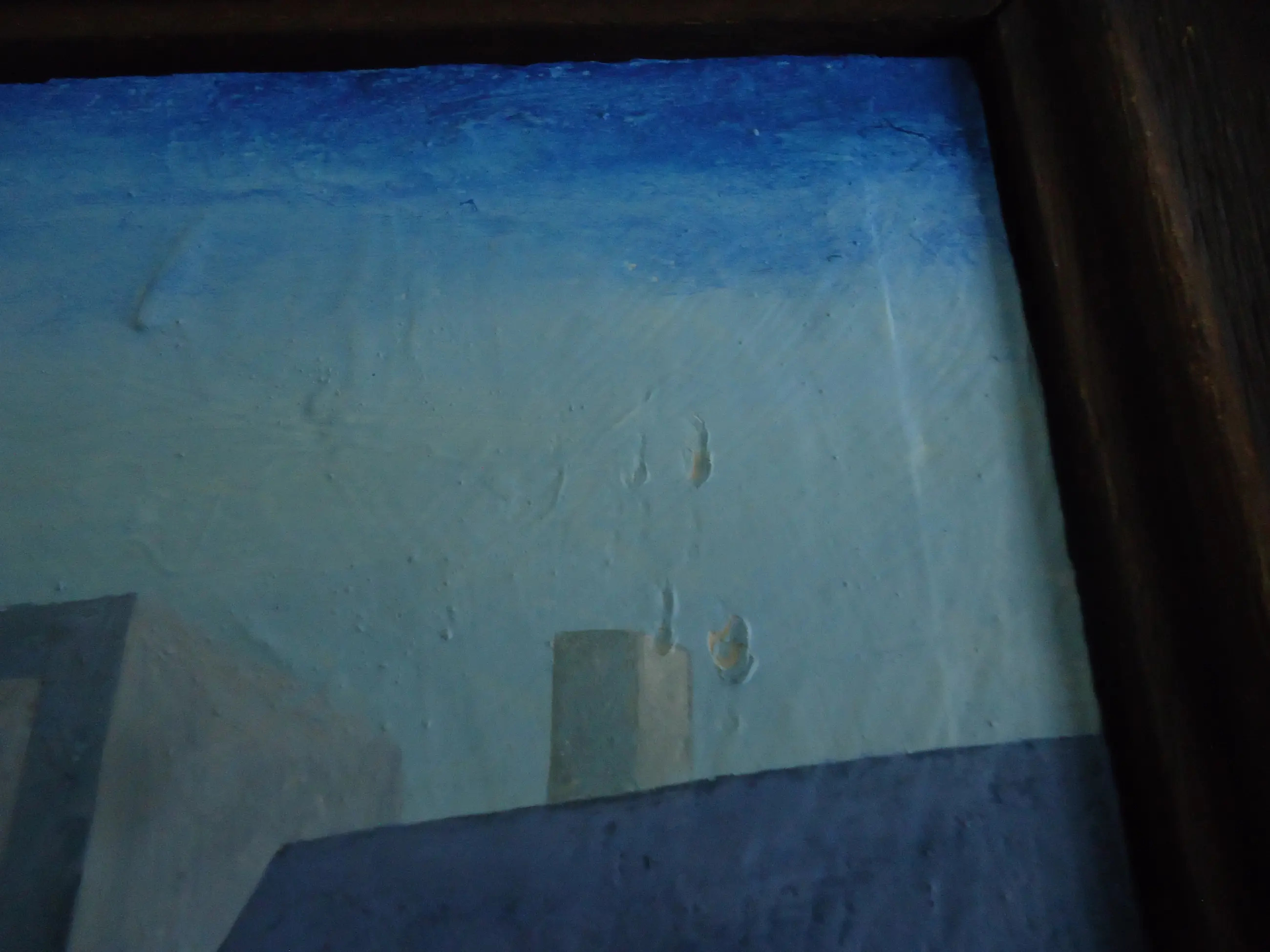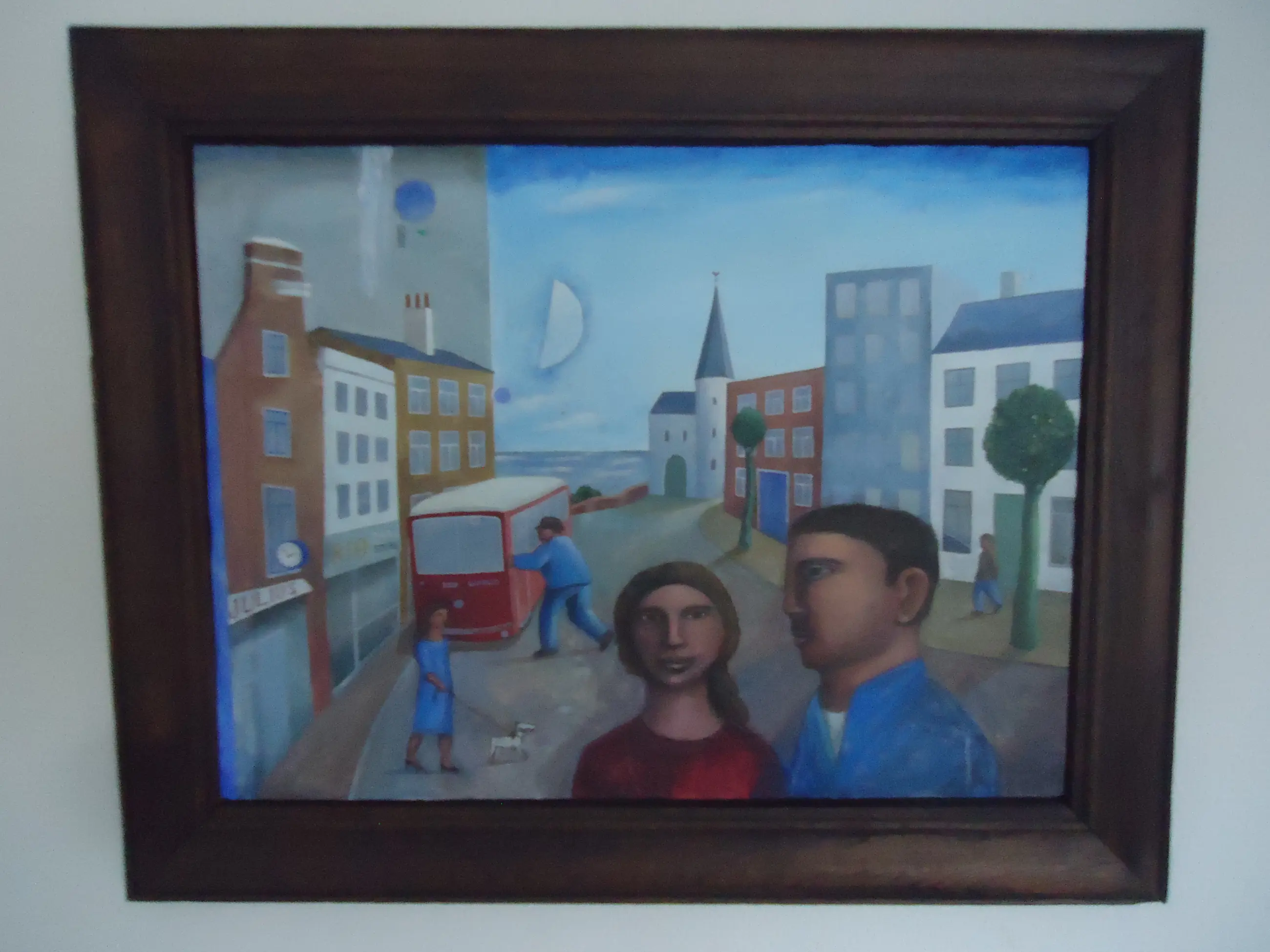 Acryl op hardboard, in houten lijst, zie graag het etiket. Zelf gekocht van de kunstenaar in 1998 voor familielid. Afgebeeld een vijftal mensfiguren, één met hondje, in een fictief stadsgezicht met boom, klassieke en hedendaagse gebouwen, de lucht en de zee.