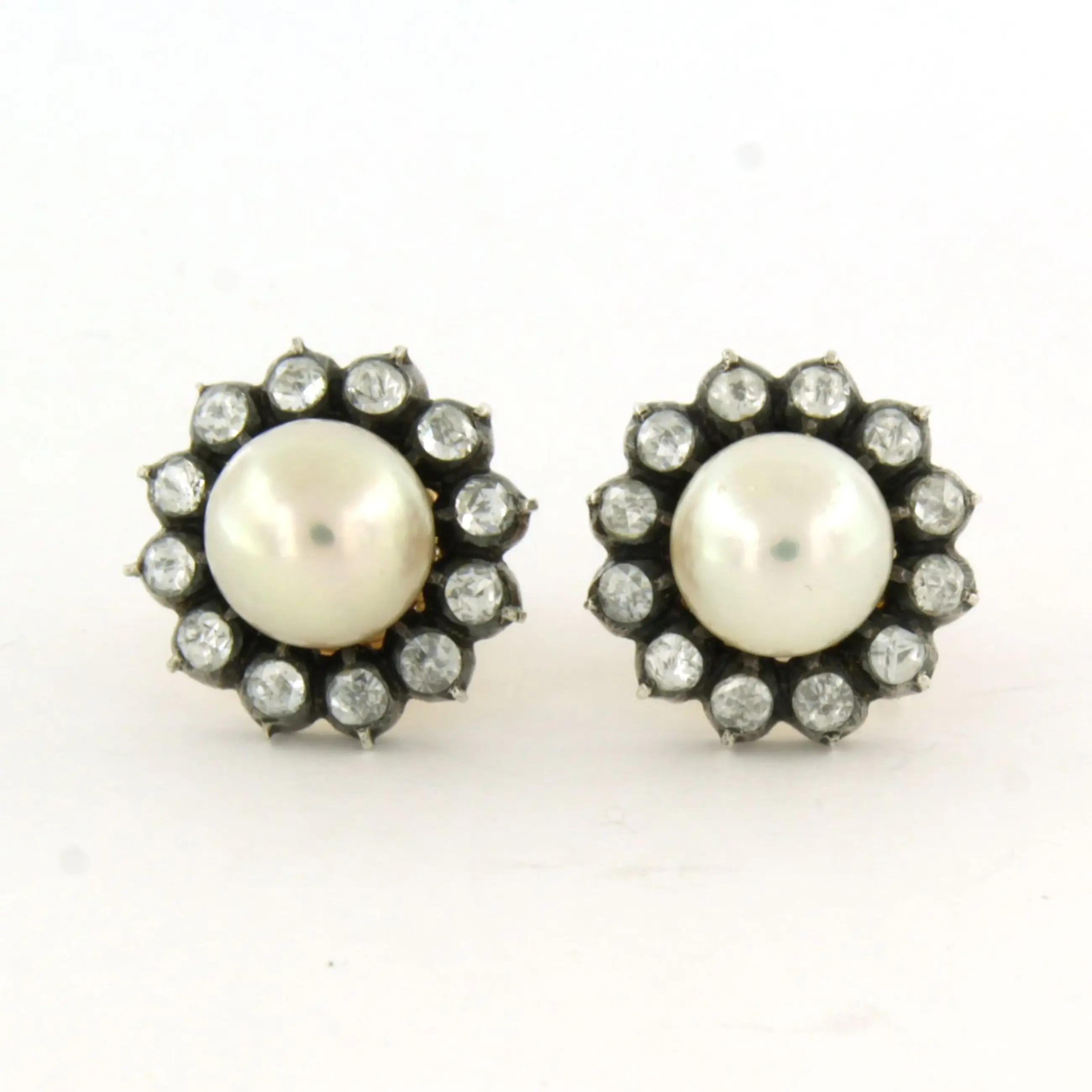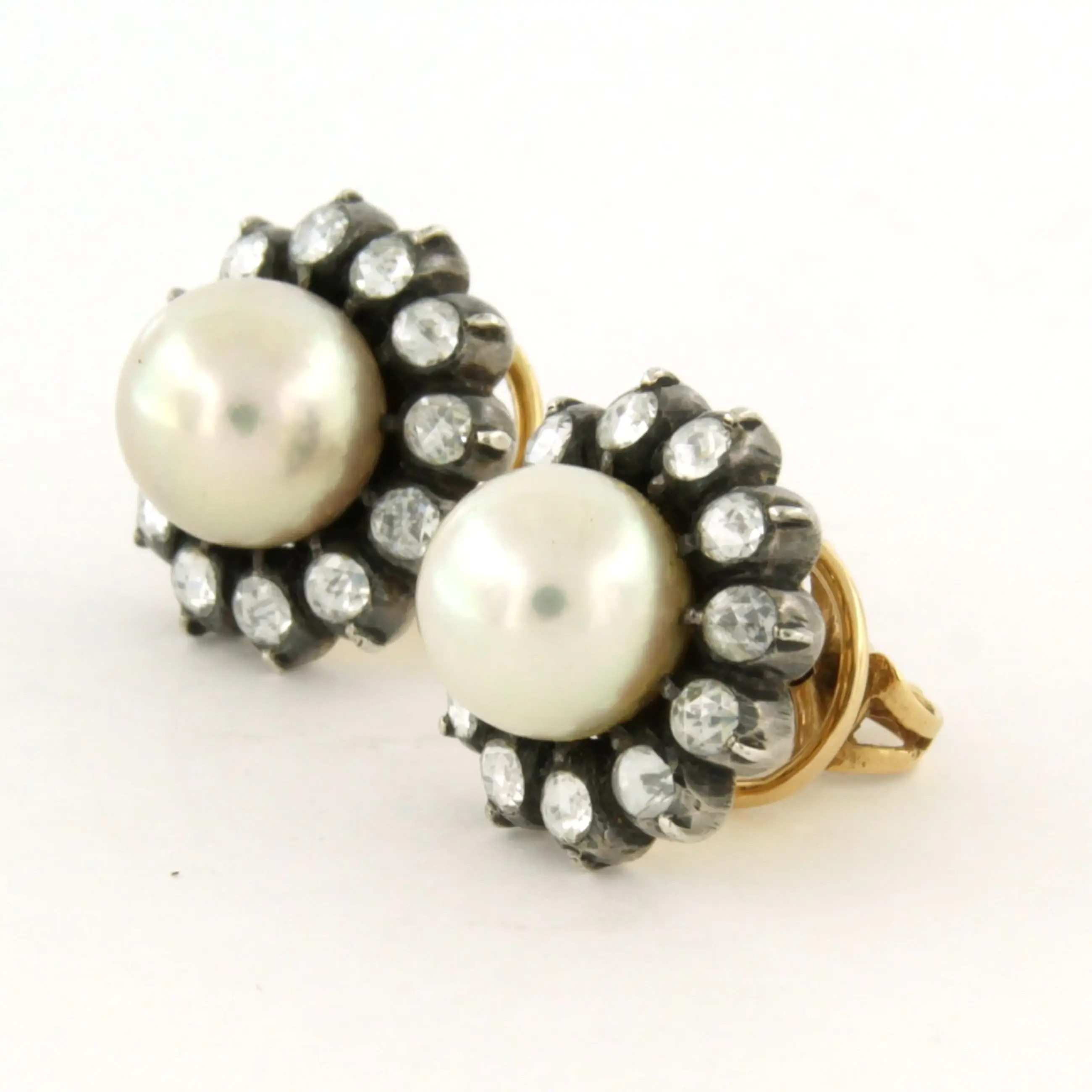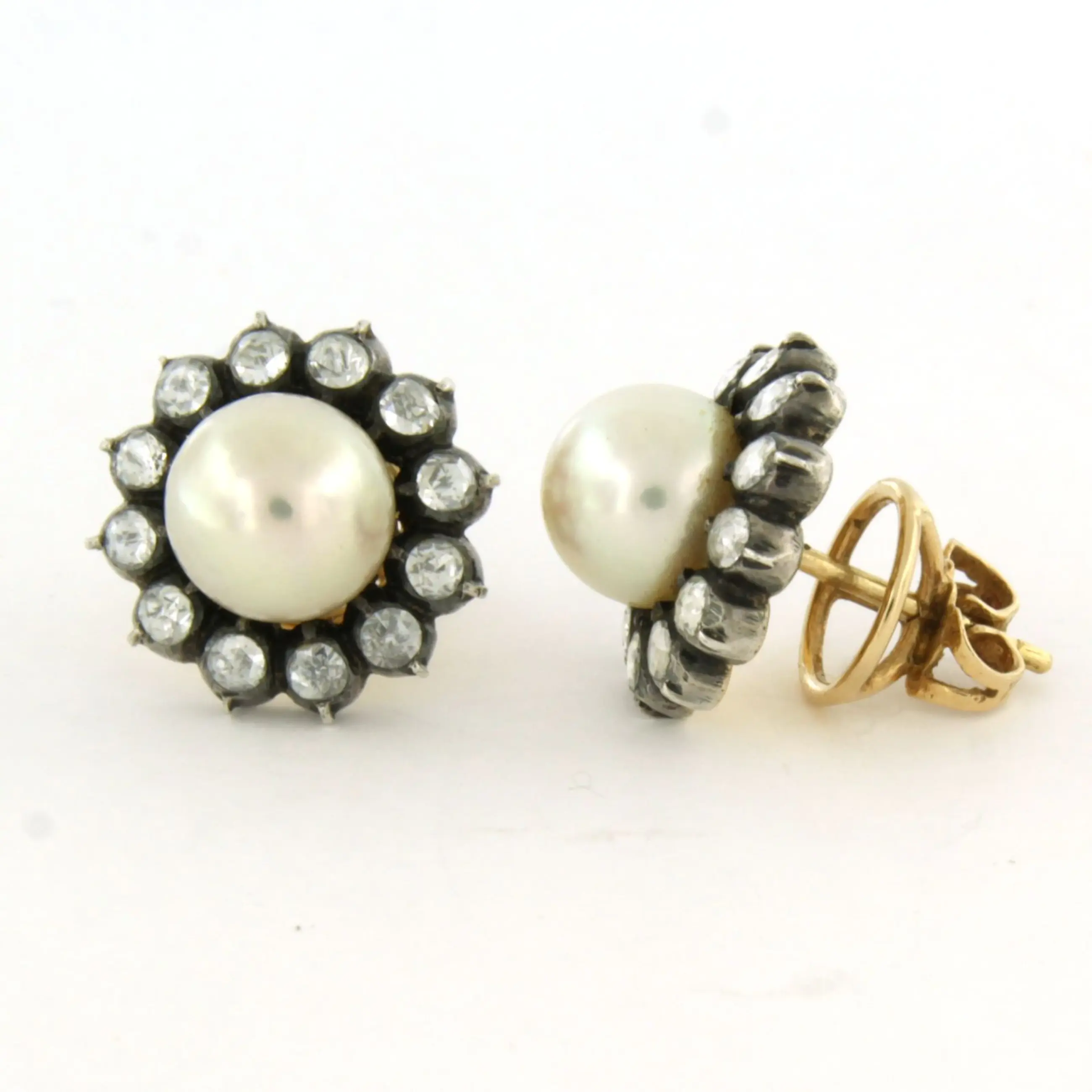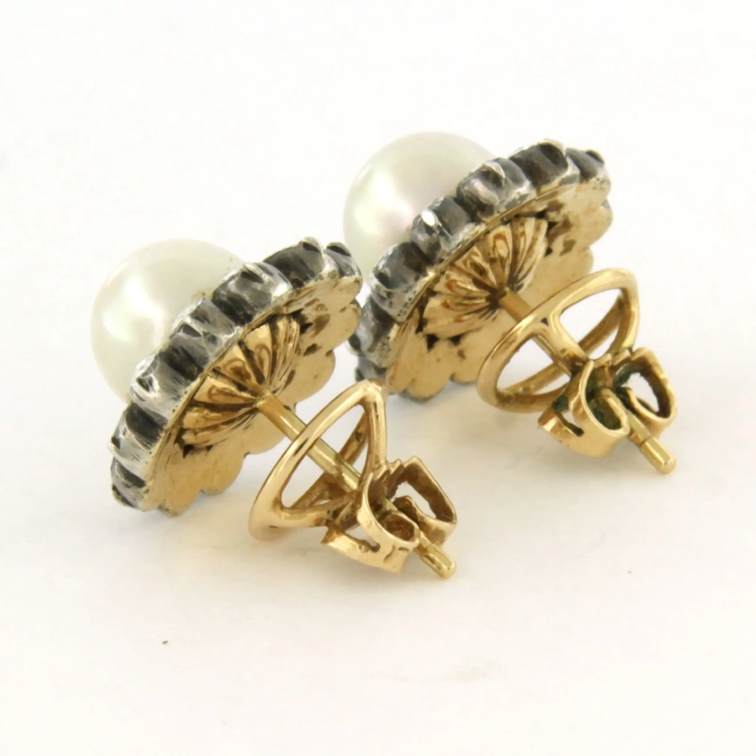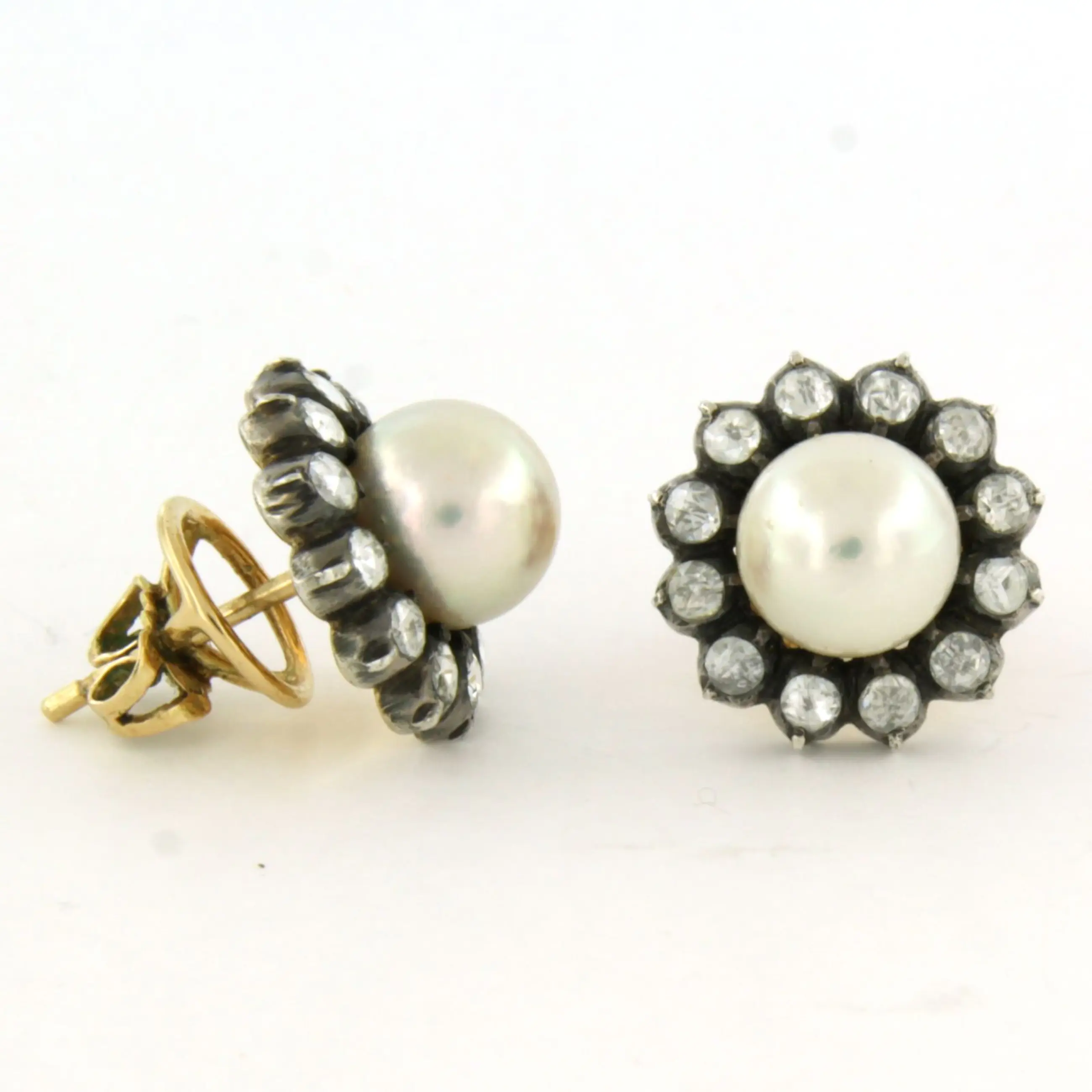 14k goud met zilver oorknoppen bezet met parel en roos geslepen diamant, totaal circa 1.00ct – G/H – SI