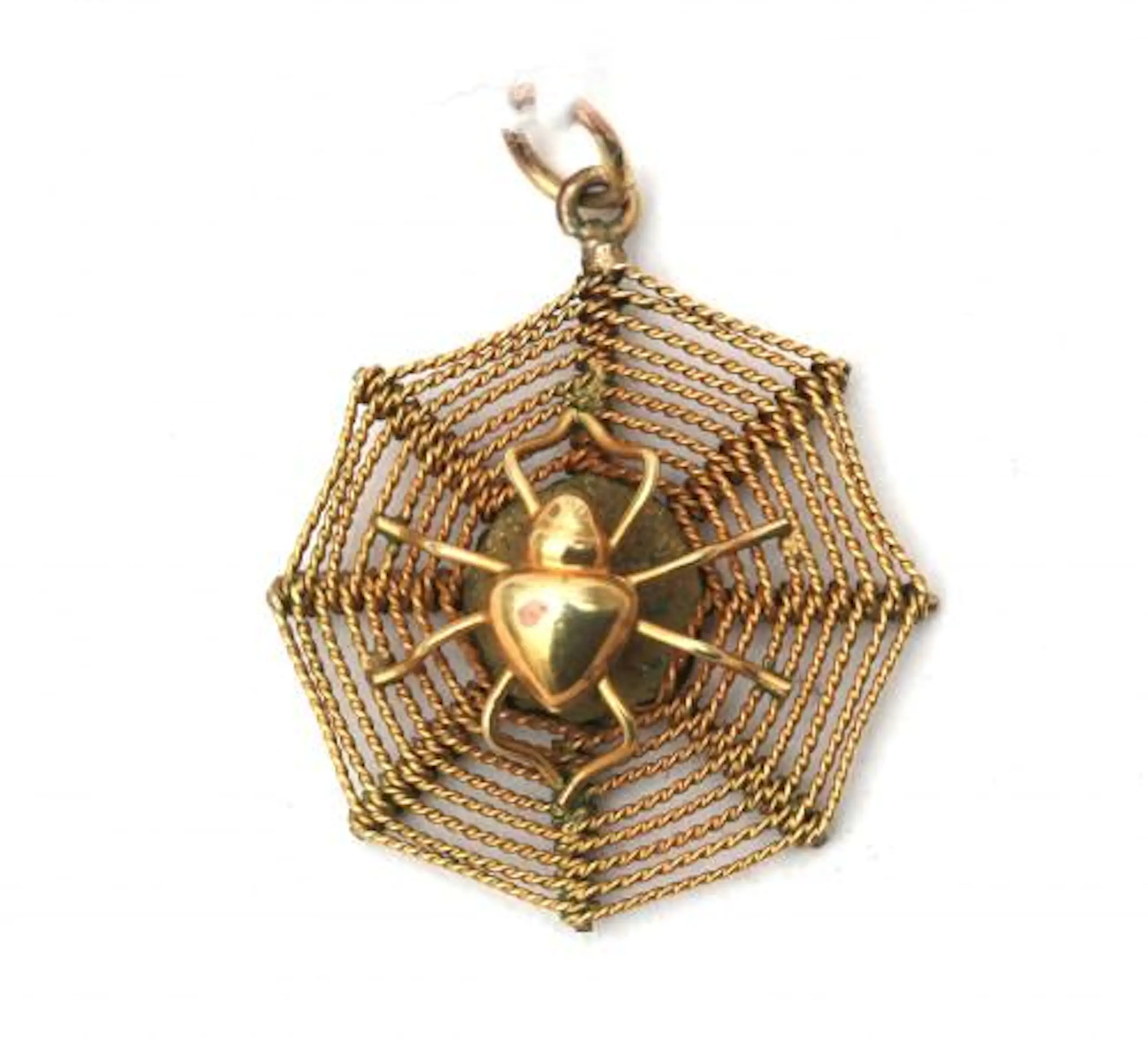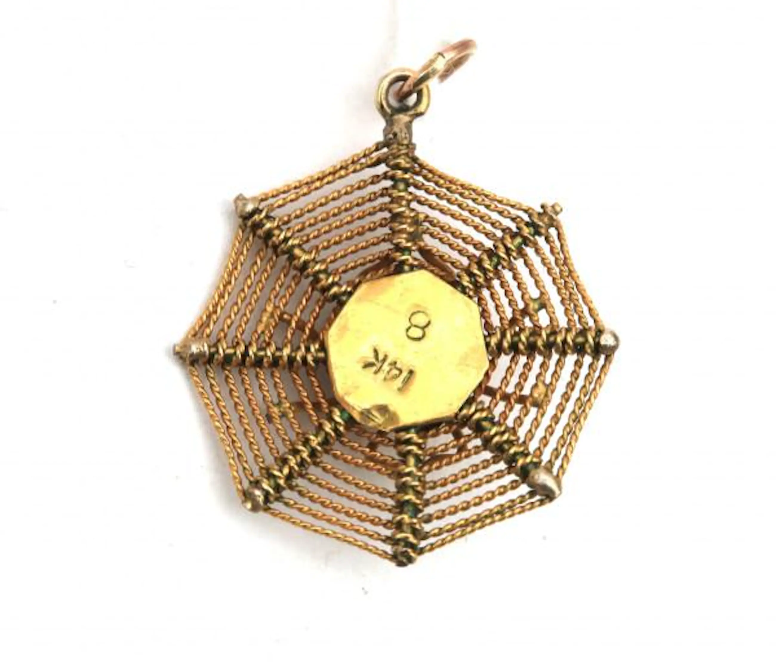 Een 14 gouden hanger in de vorm van een spinnenweb met spin. Diameter: ca. 20 mm. Gewicht: 1.1 gram. Artikelnummer: 11985