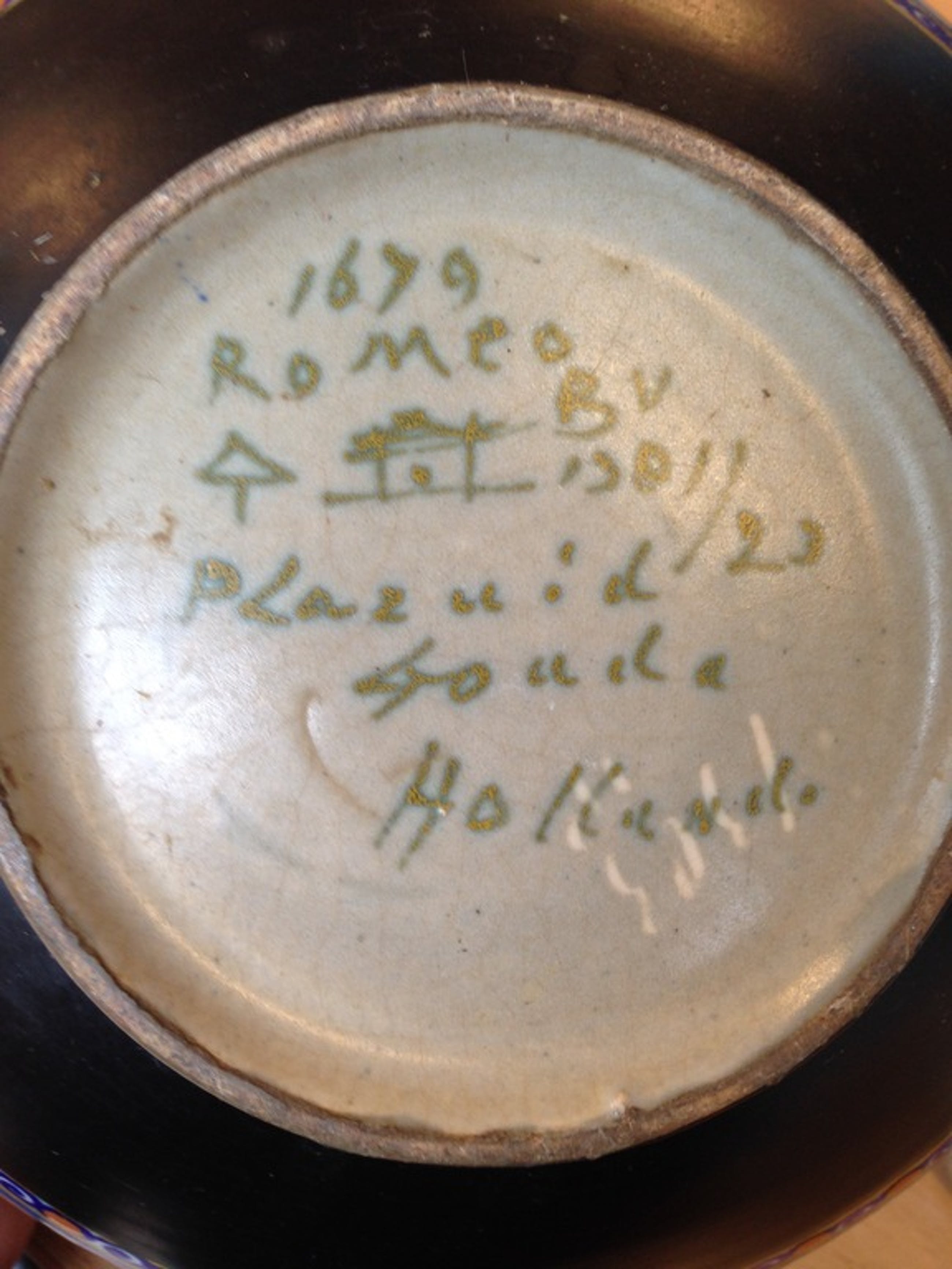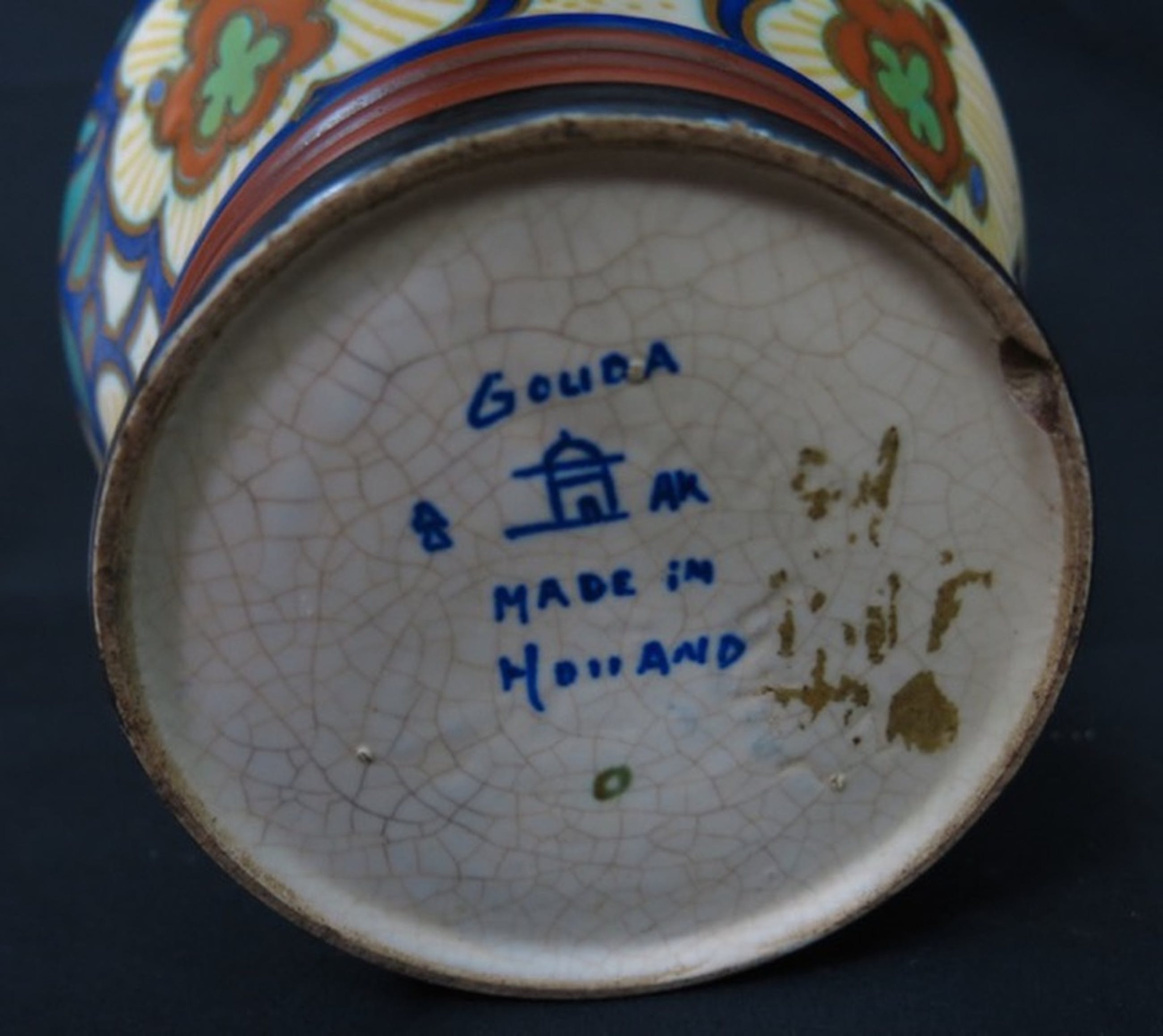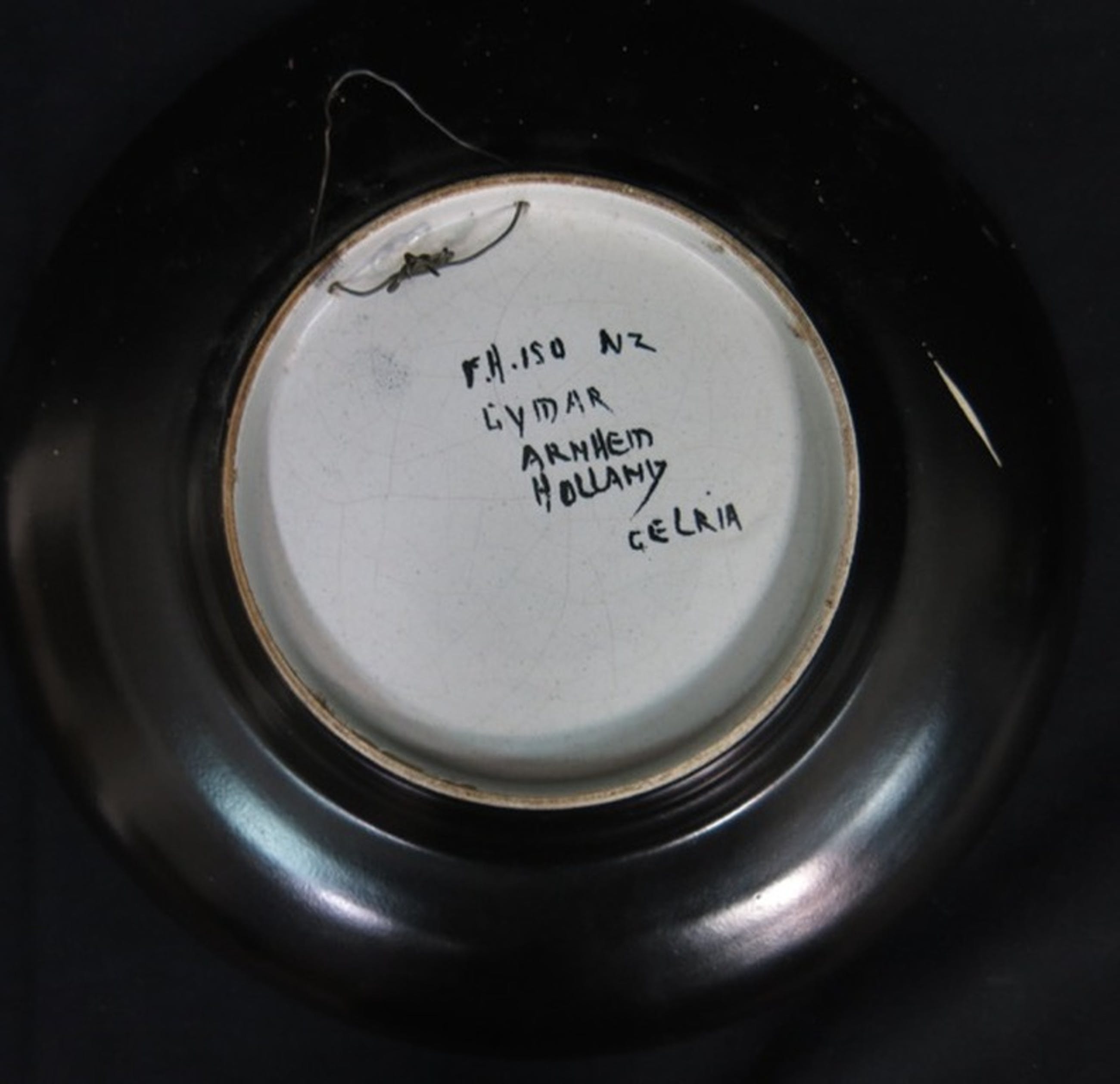 Lot met Gouds Plateel: een grote schaal, een kleine pot en een bord. De schaal is geproduceerd in 1928, de bloempot uit 1929.